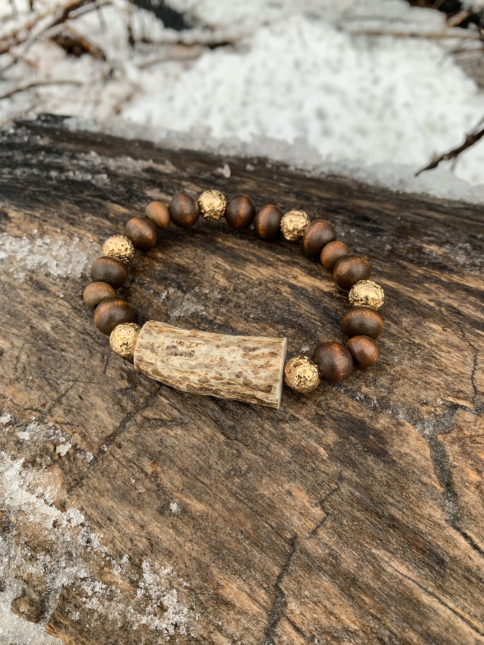 Wooden beads with a beautiful golden accent bead, and an authentic dark antler piece. Handmade.