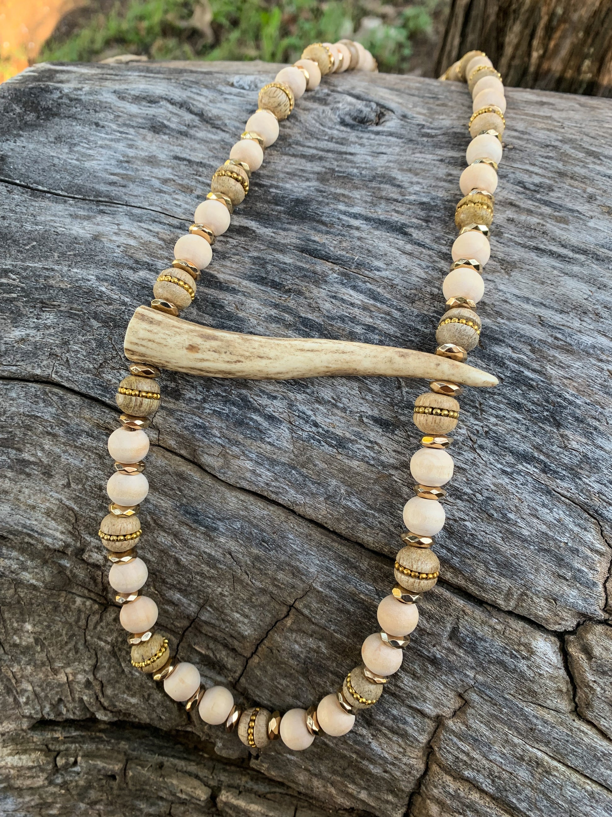 Tan wooden beads with golden accent pieces with a horizontal authentic deer antler piece in the middle! Handmade. One of a kind.