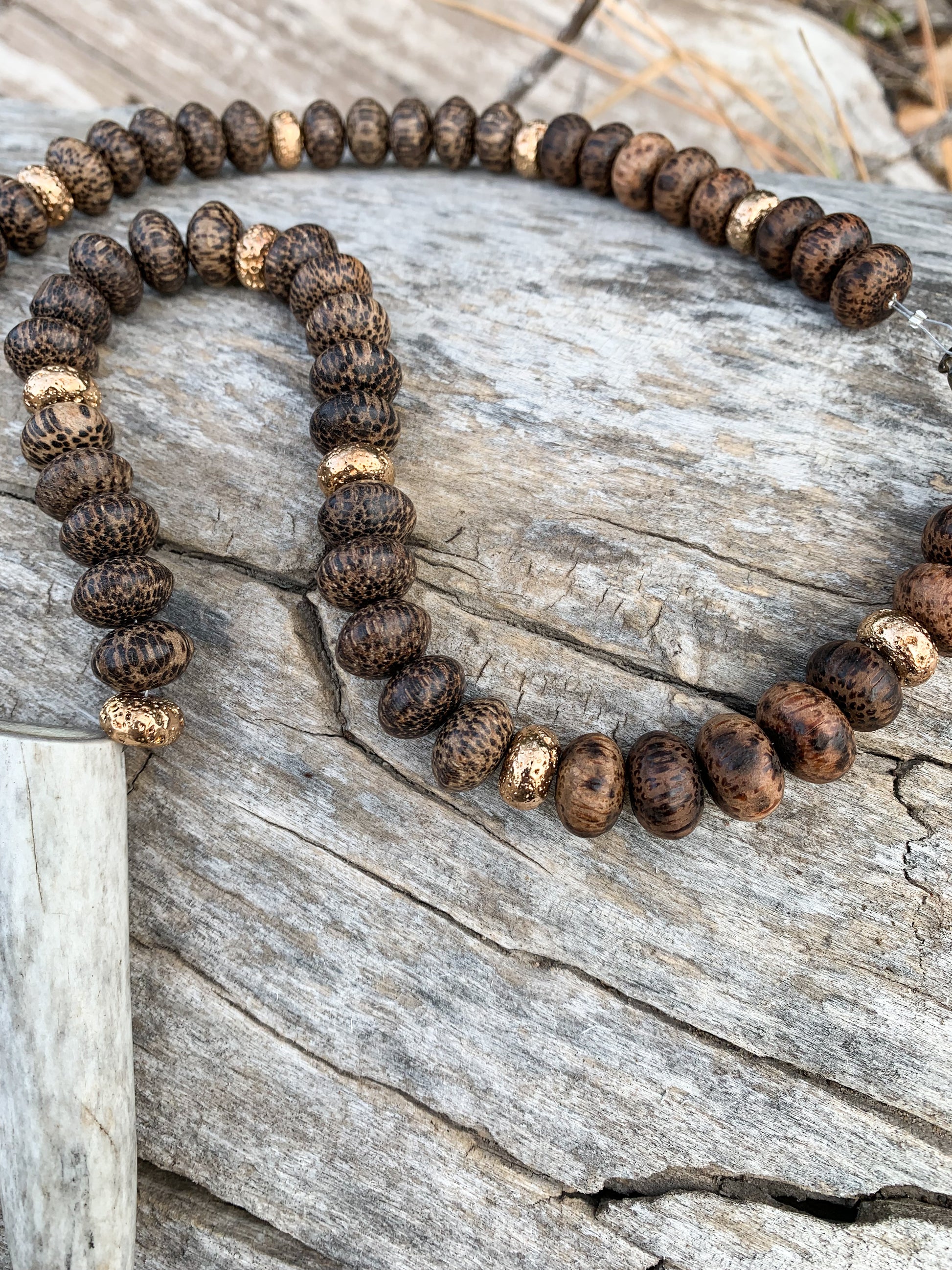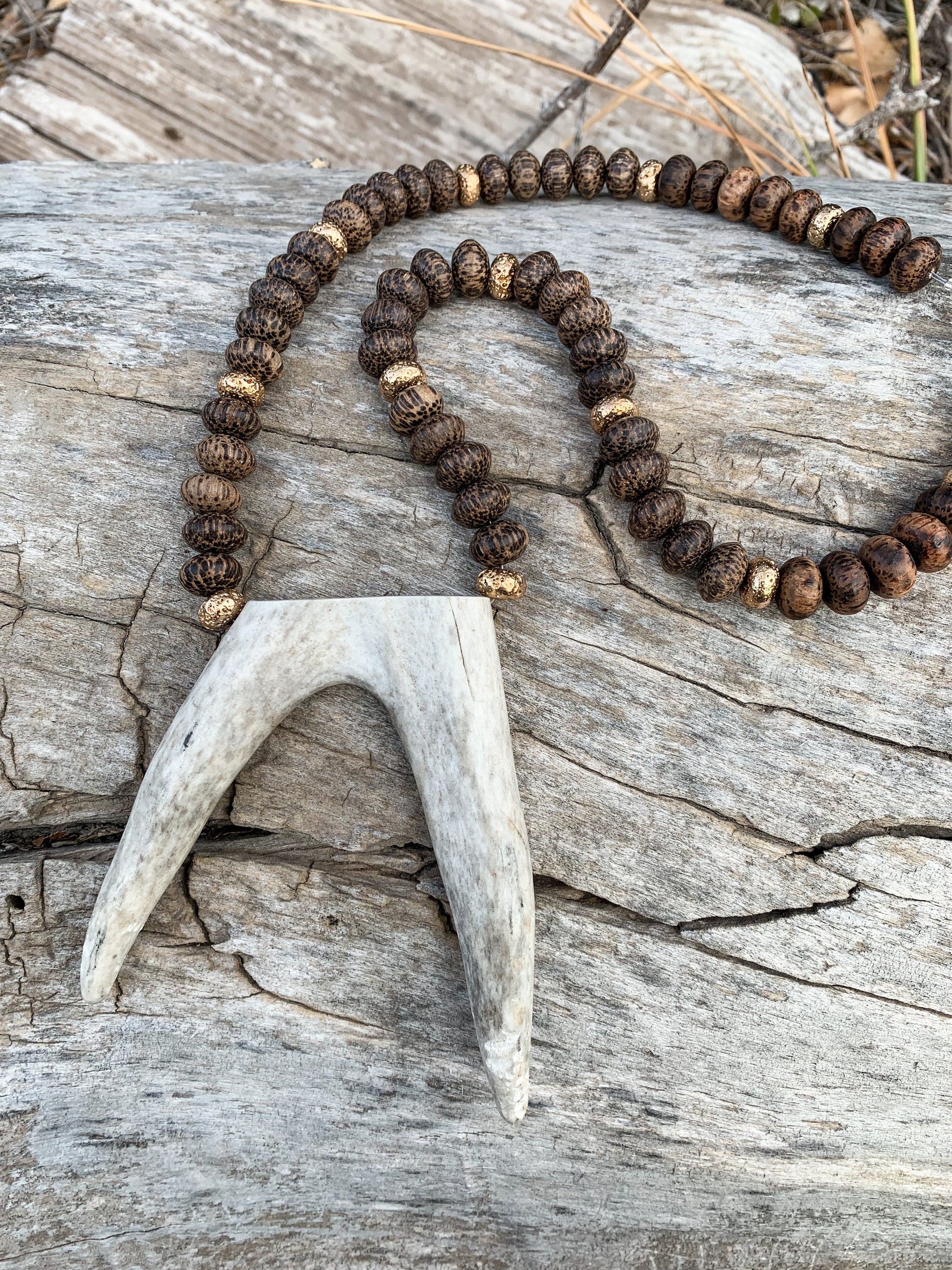 Wood slab beads with a metal gold accent bead, and a large forked authentic antler piece that has a chewed on texture from laying in the field. Handmade.