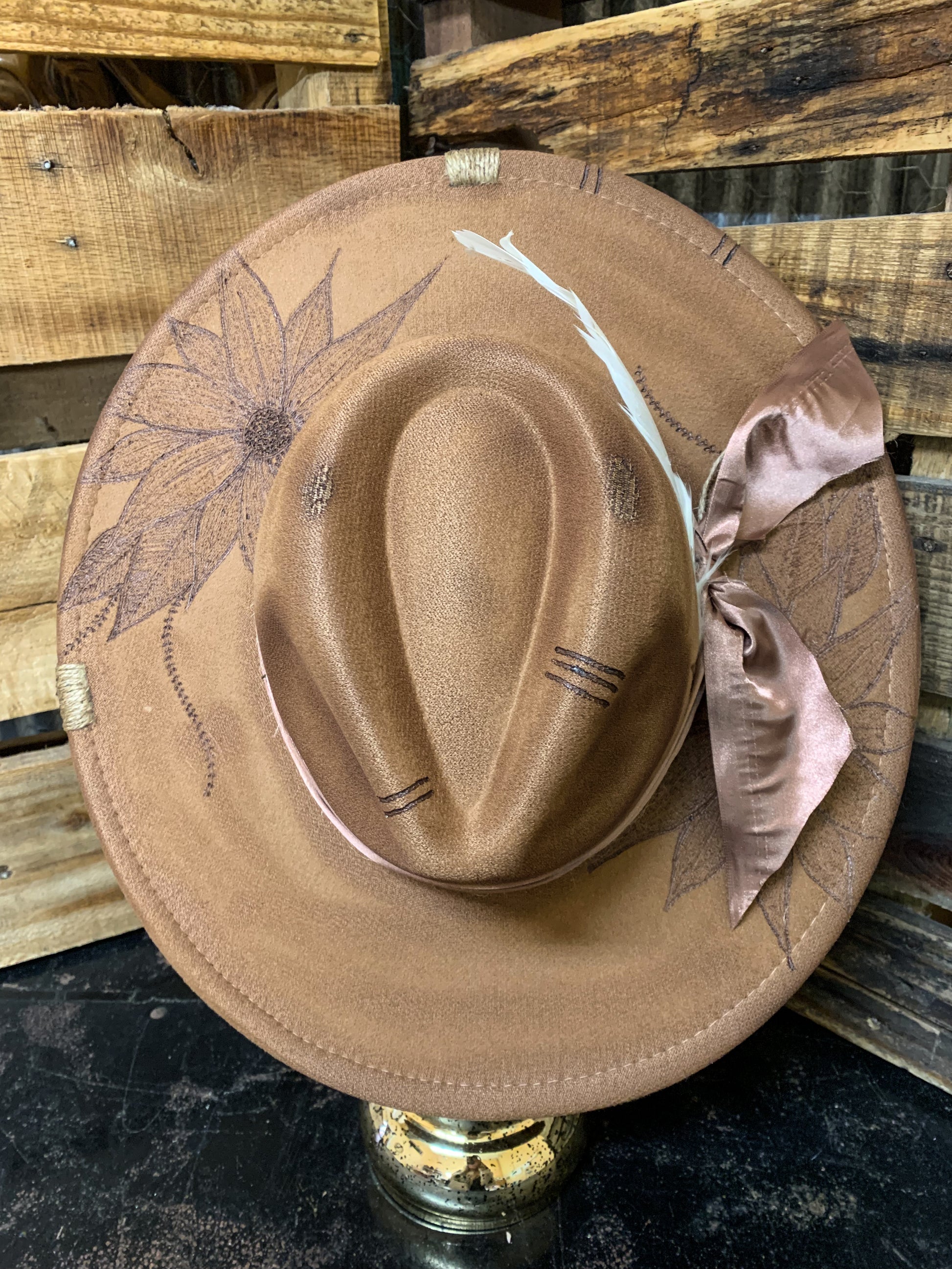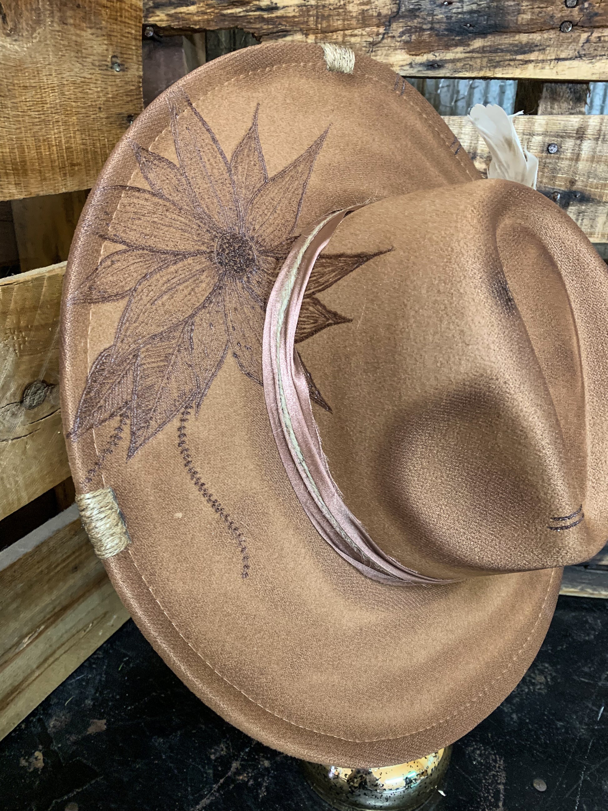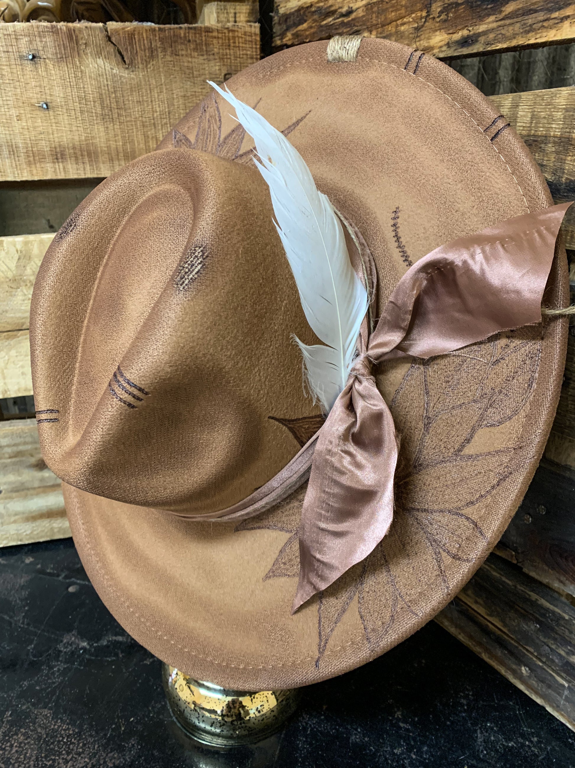 A beautiful simple faux felt hat with floral burned brim and a champagne satin fabric for the band with a white feather. Twine wrapped brim. Drawstrings inside to tighten if needed. 4.75”, Brim 3.5”, circumference 22”. 65% cotton, 35% polyester.