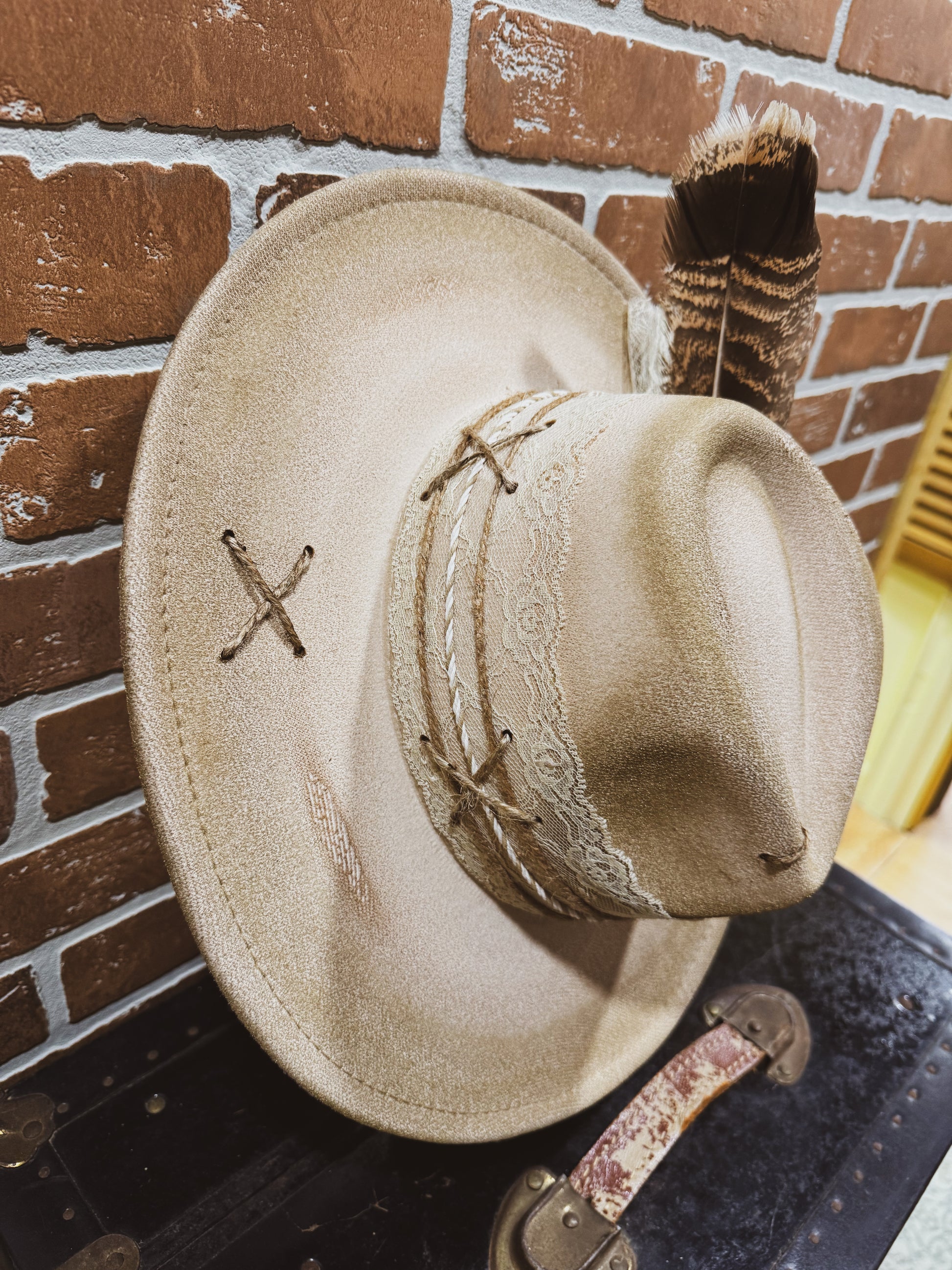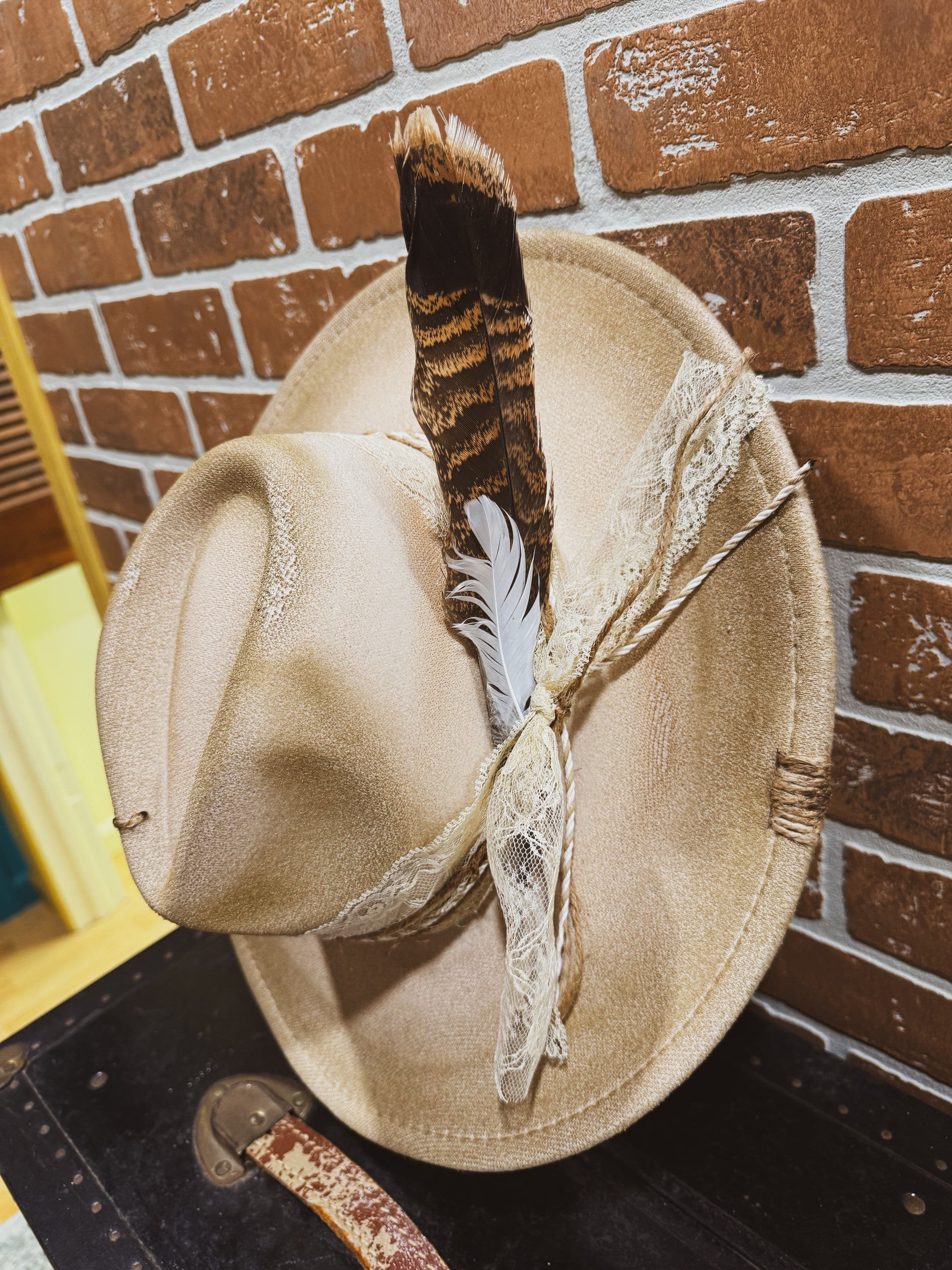 Wide brim Ivory faux felt hat with lace and twine wrapped around and tied on the side. Brown accent paint detail. 2 feathers, and twine detail. Adjustable drawstrings inside to tighten if needed. 4.75” height, 3.5” brim, 22” circumference. 65% cotton, 35% polyester.
