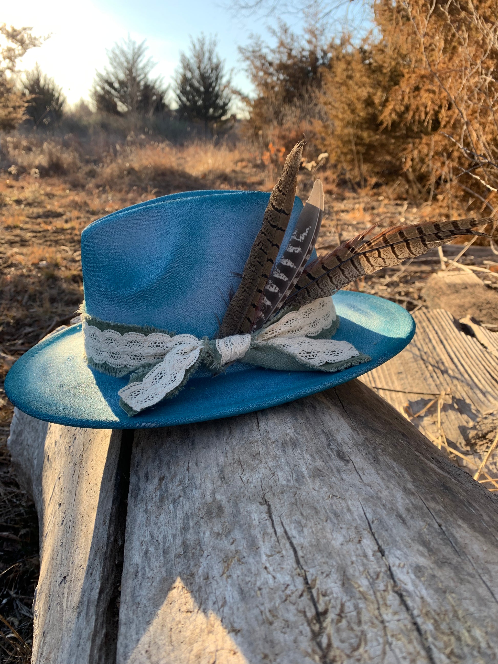 Sky blue hat with turquoise accent and burned distress. Sage green and lace band with 3 pheasant feathers. 4.75” height. 2.75” brim. 22” circumference. 65% cotton, 35% polyester.