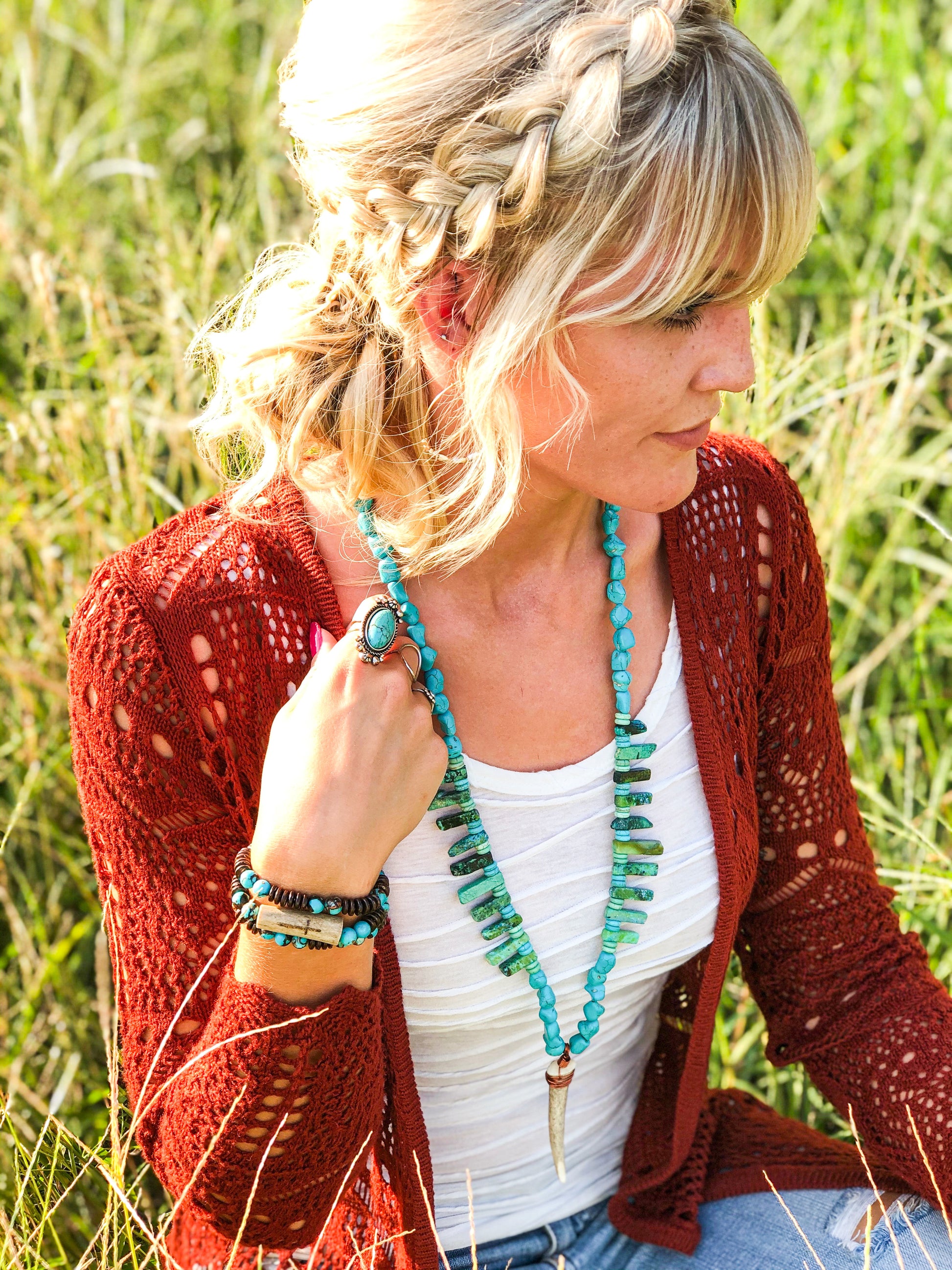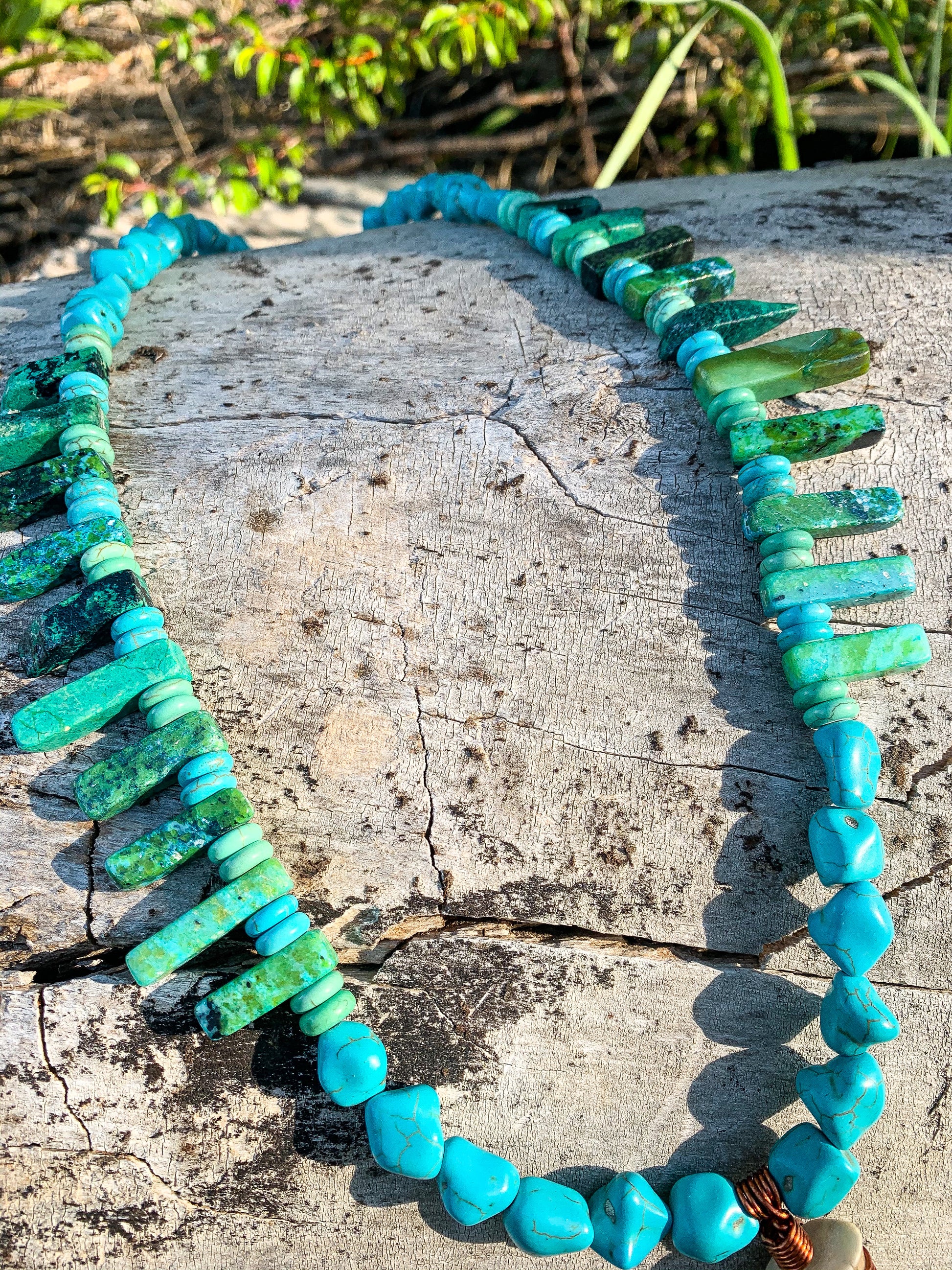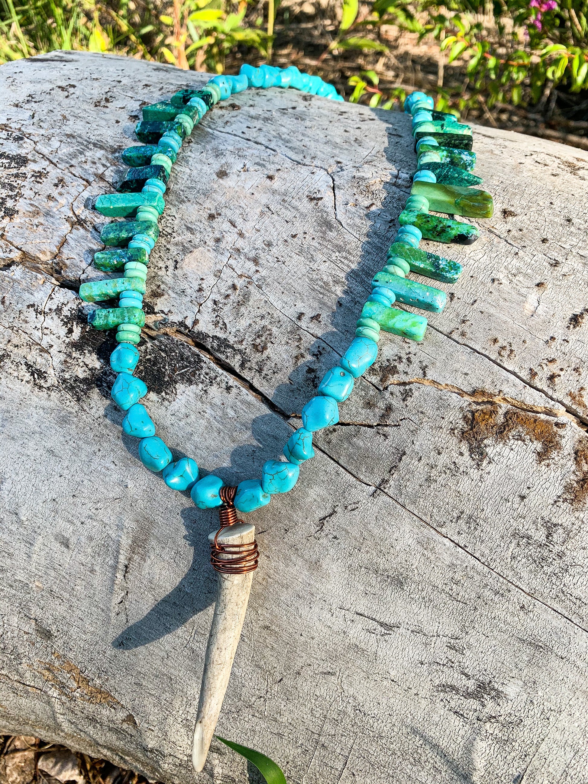 Green and turquoise stones with a copper wire wrapped antler point. Handmade. One of a kind. Not authentic turquoise.