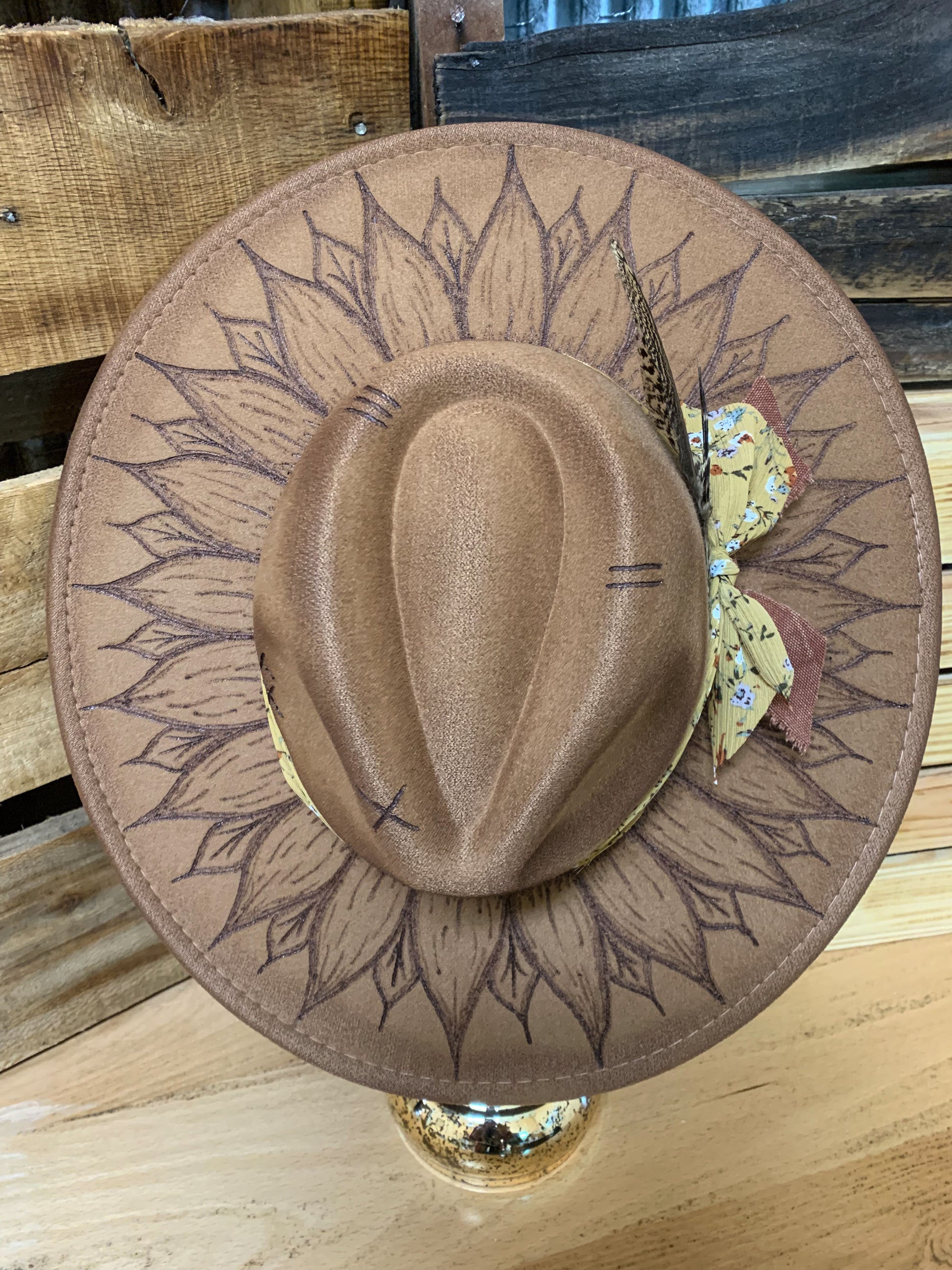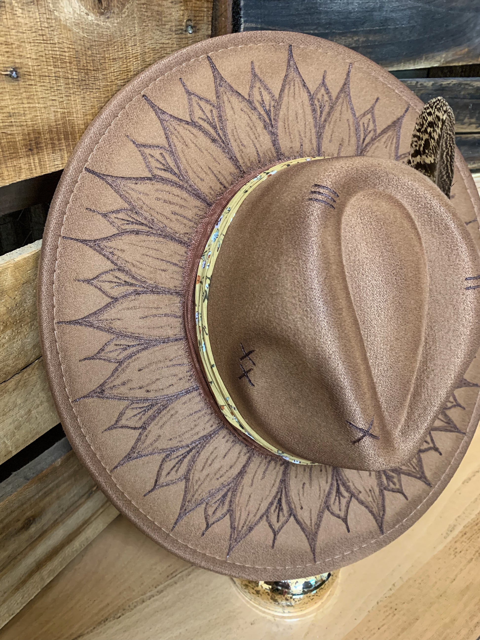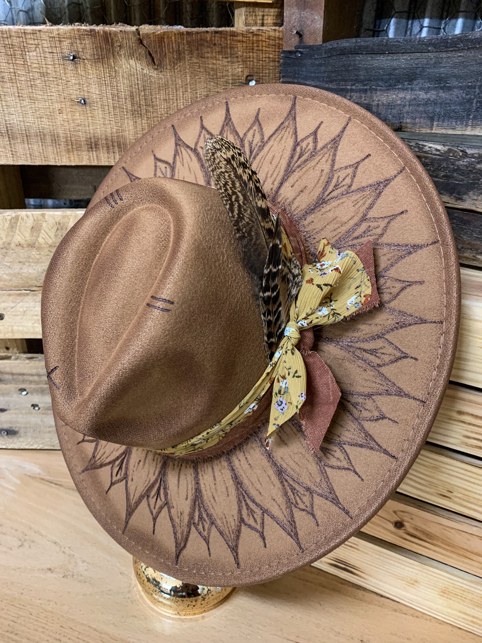 What a fun sunflower hat! A brown faux felt hat with a sunflower design burned into the brim and rust/floral fabric wrapped around and tied on the side. Two feathers on the left side as well. Adjustable drawstrings to tighten. 3.5” brim, 22” circumference. 35% polyester, 65% cotton.