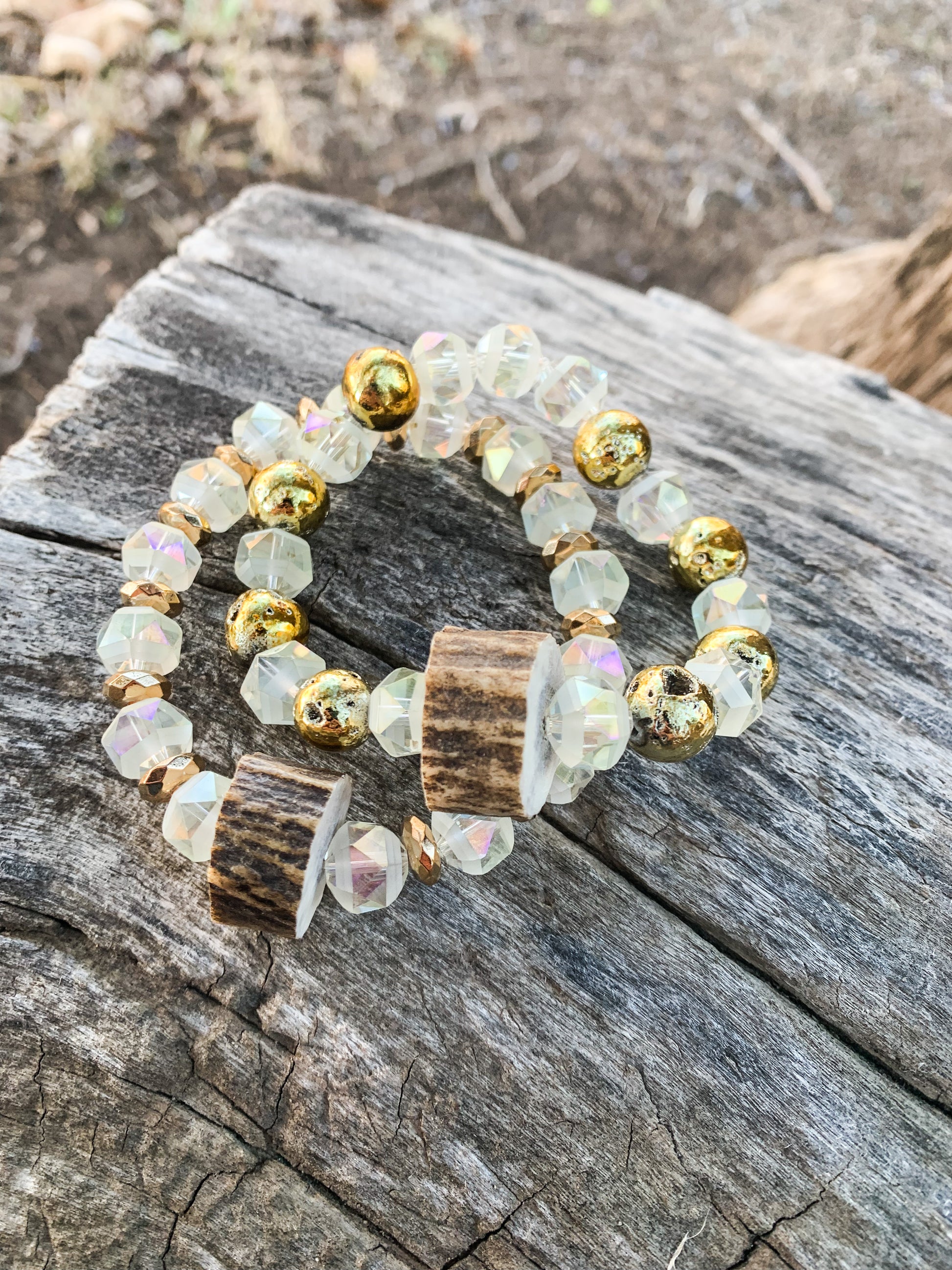 Beautiful translucent and gold beads with two textured Elk antler pieces in the middle. Handmade.