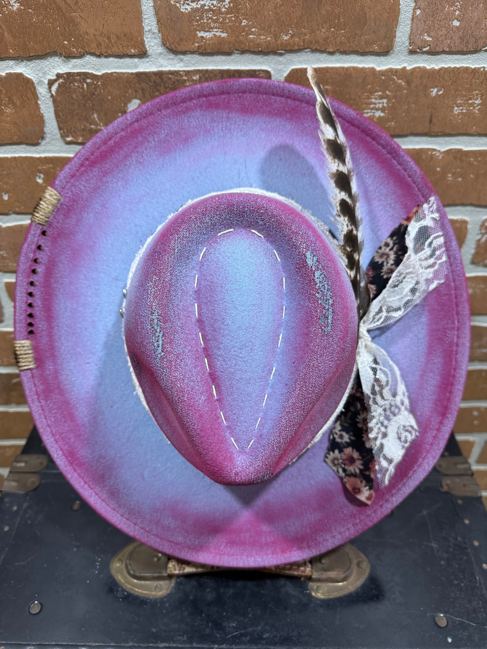 Light blue and maroon painted hat. Faux felt wide brim with fabrics wrapped and tied on one side, and a large turkey feather. Twine wrapped brim detail. Paper clips hooked through fabric. Adjustable drawstrings inside to tighten down if needed! 4.75” height, 3.5” brim, 22” circumference. 65% cotton, 35% polyester.