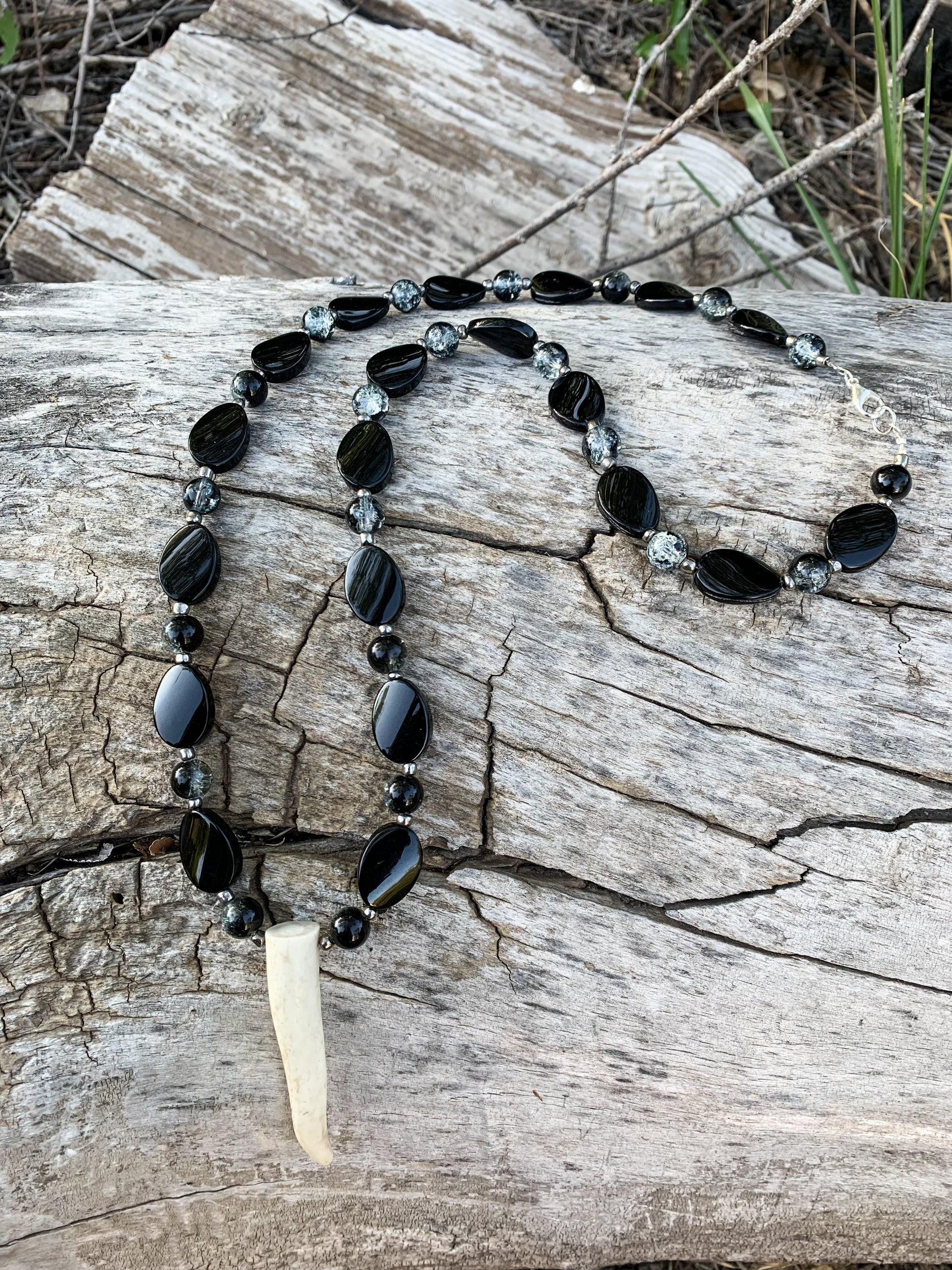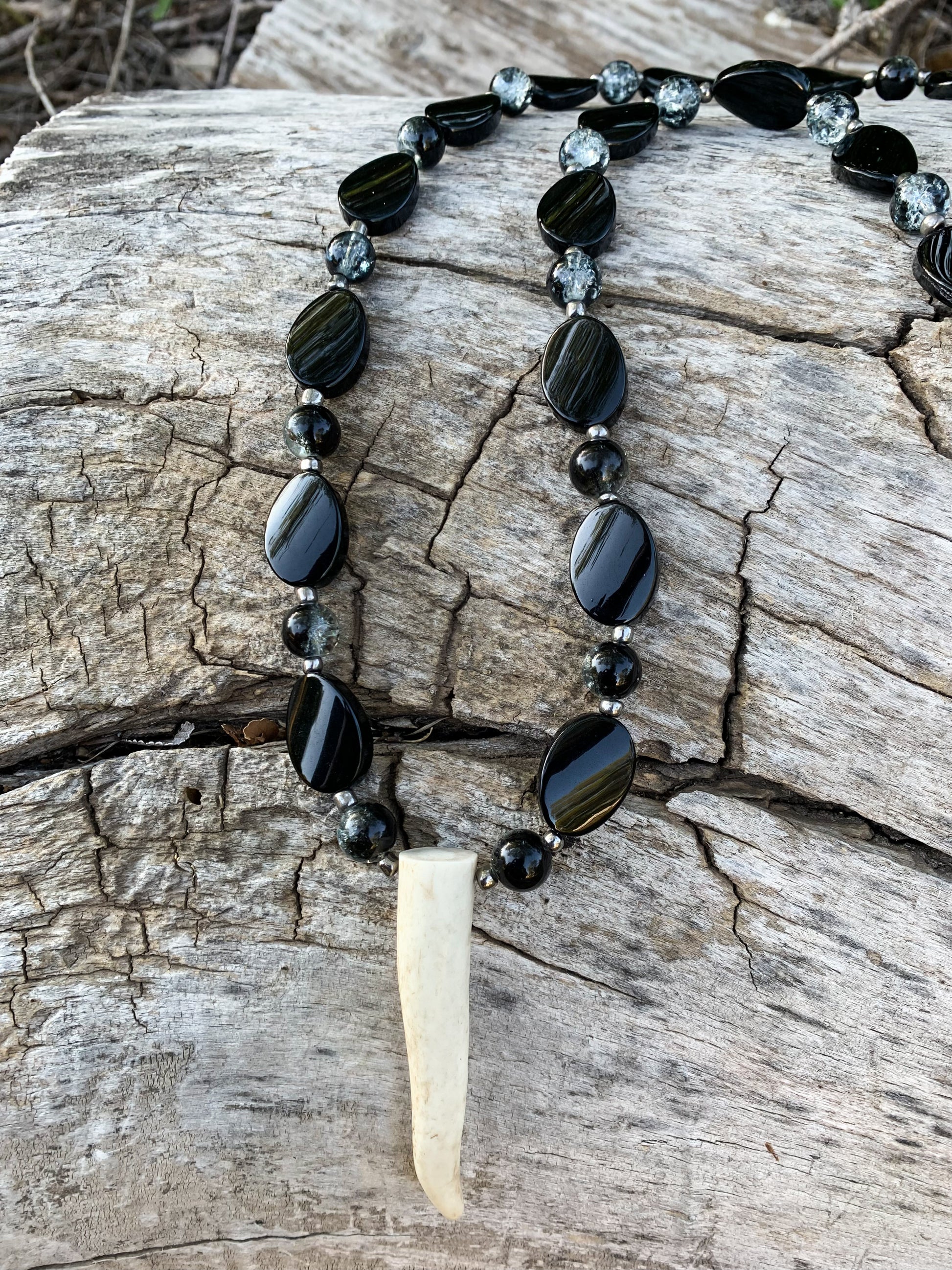 Gorgeous black slab beads with marble glass beads in between, and authentic antler tip in the center. Handmade. One of a kind.