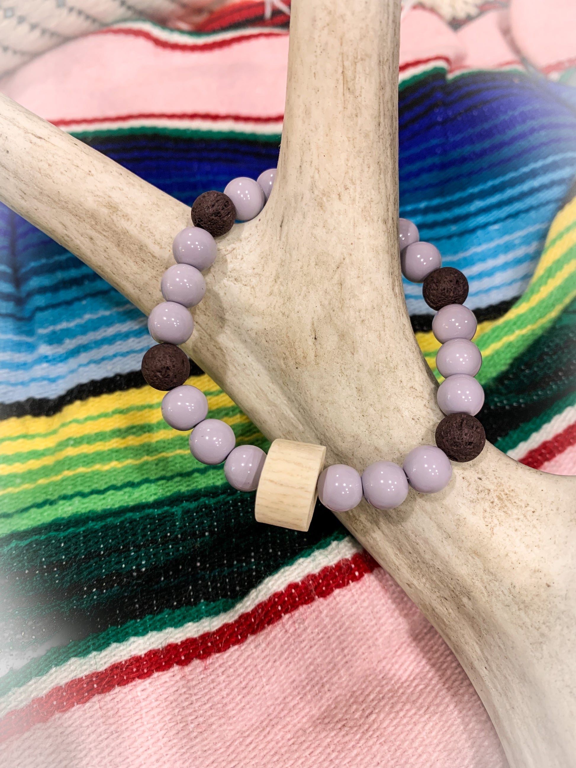 Lavender colored beads with dark purple lava rock beads and a small authentic antler piece. Handmade.