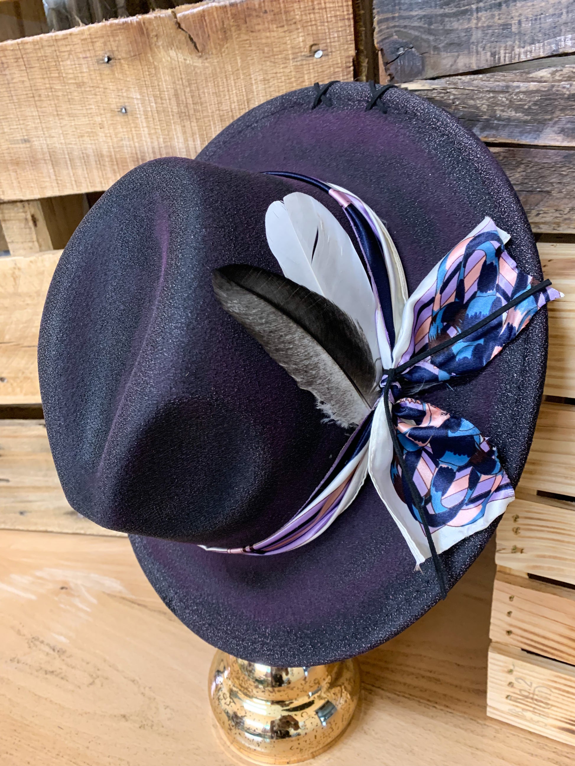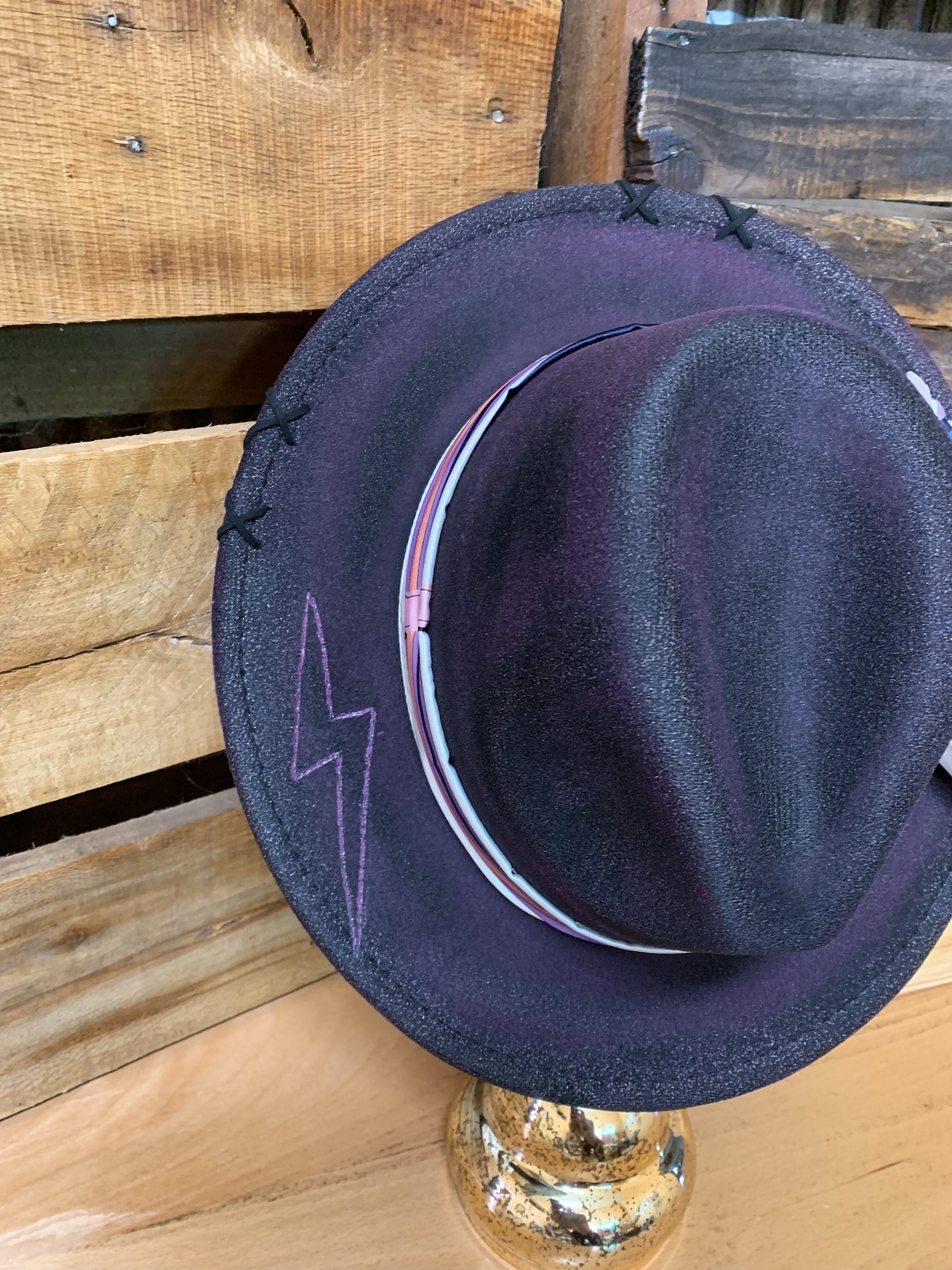 Custom colored deep purple hat with silk band wrapped around, two fun feathers on the side, black cord design on brim, and a lightning bolt burned and painted into it! Adjustable drawstrings inside to tighten. 4.75” height. 2.75” brim. 22” circumference. 65% cotton, 35% polyester.