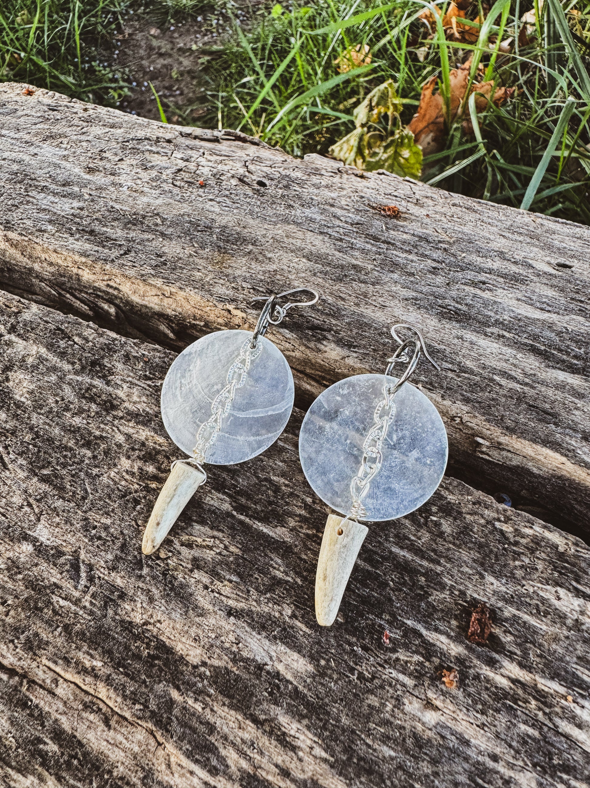 Beautiful Pearl colored shell circle pieces with a chain leading to small antler tips. Handmade. One of a kind.