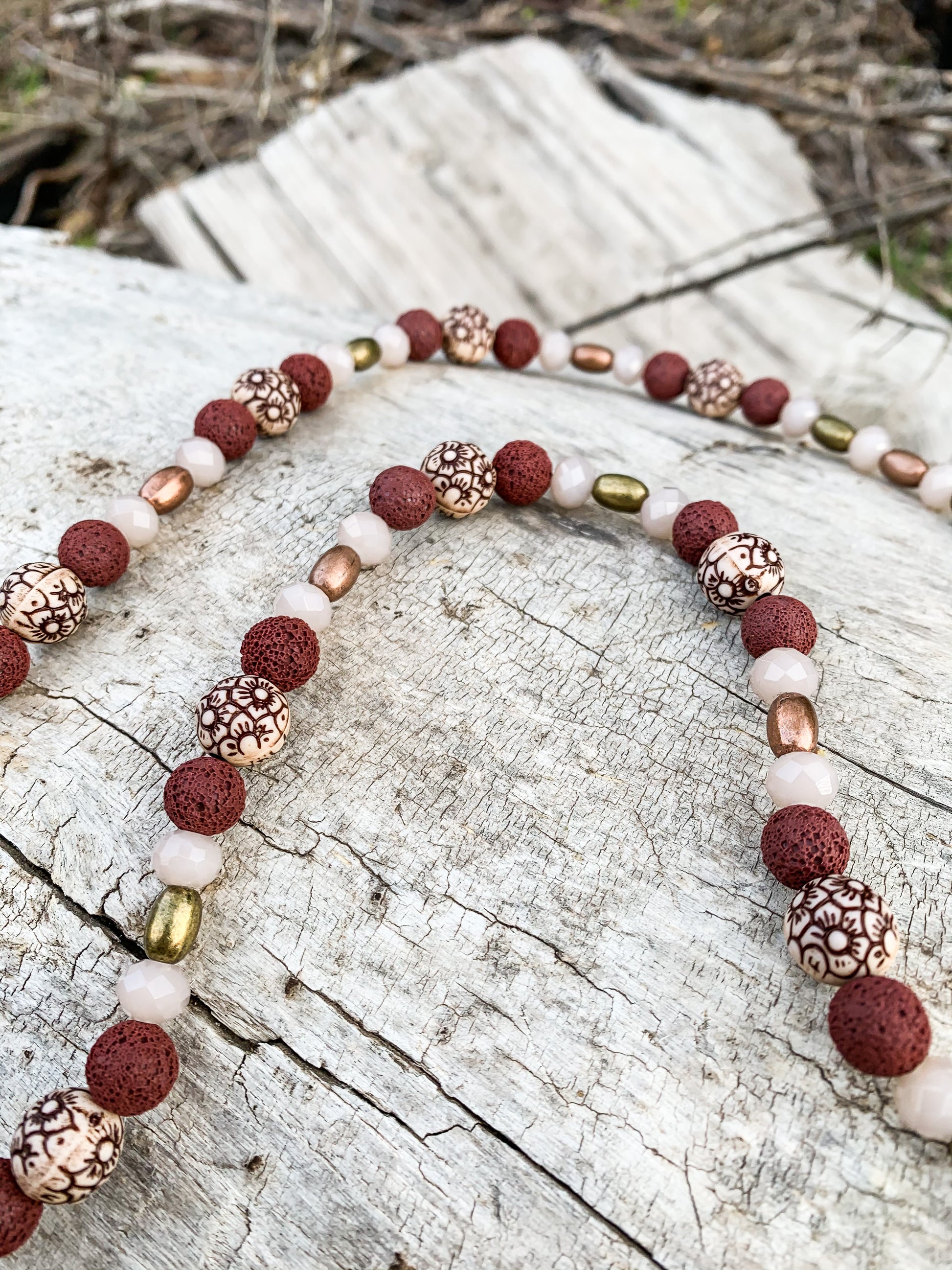 This piece is inspired by one of my favorite verses. Floral engraved beads with light blush/pink, and maroon sponge beads, and a small antler tip! Handmade. One of a kind.