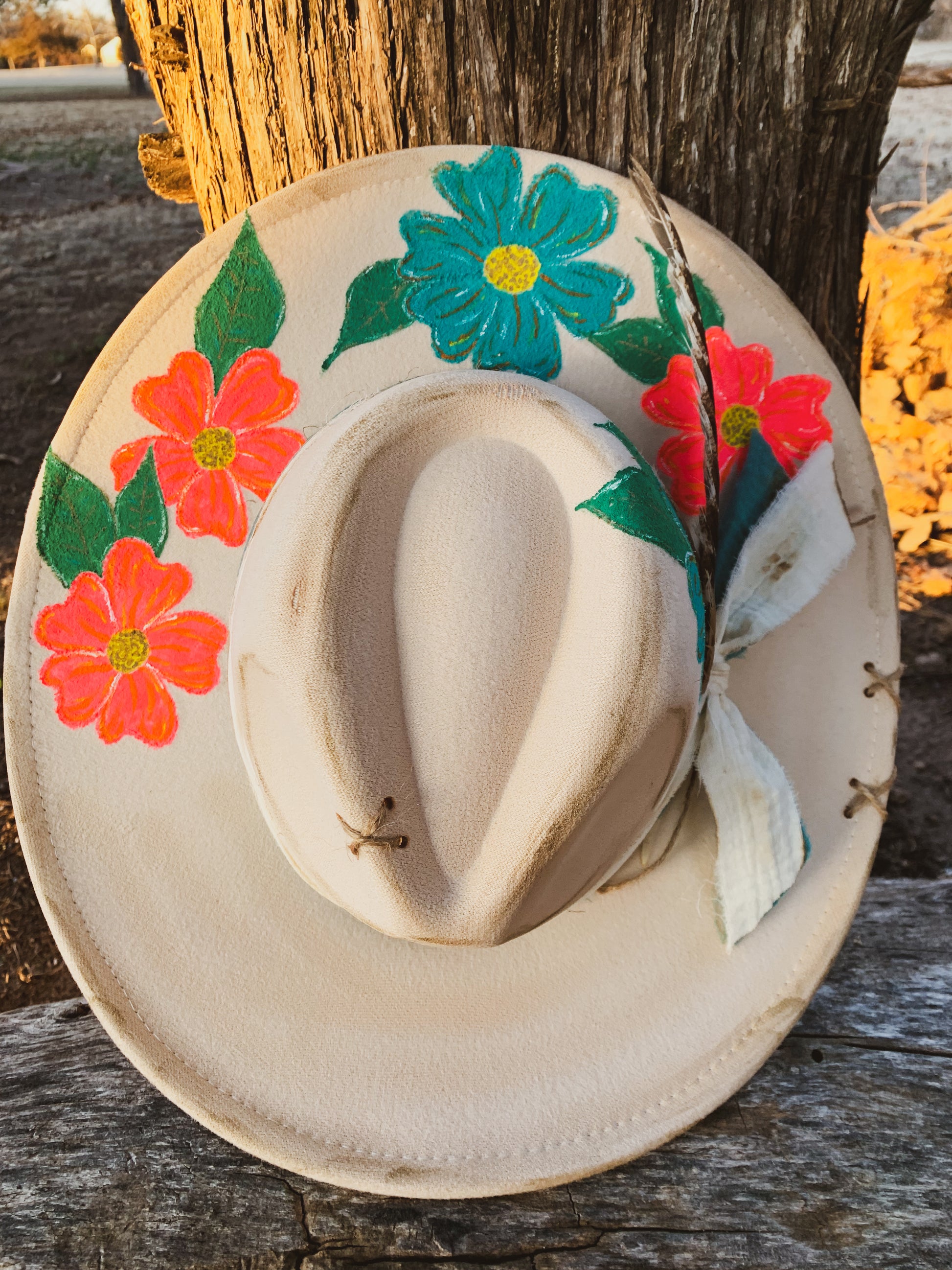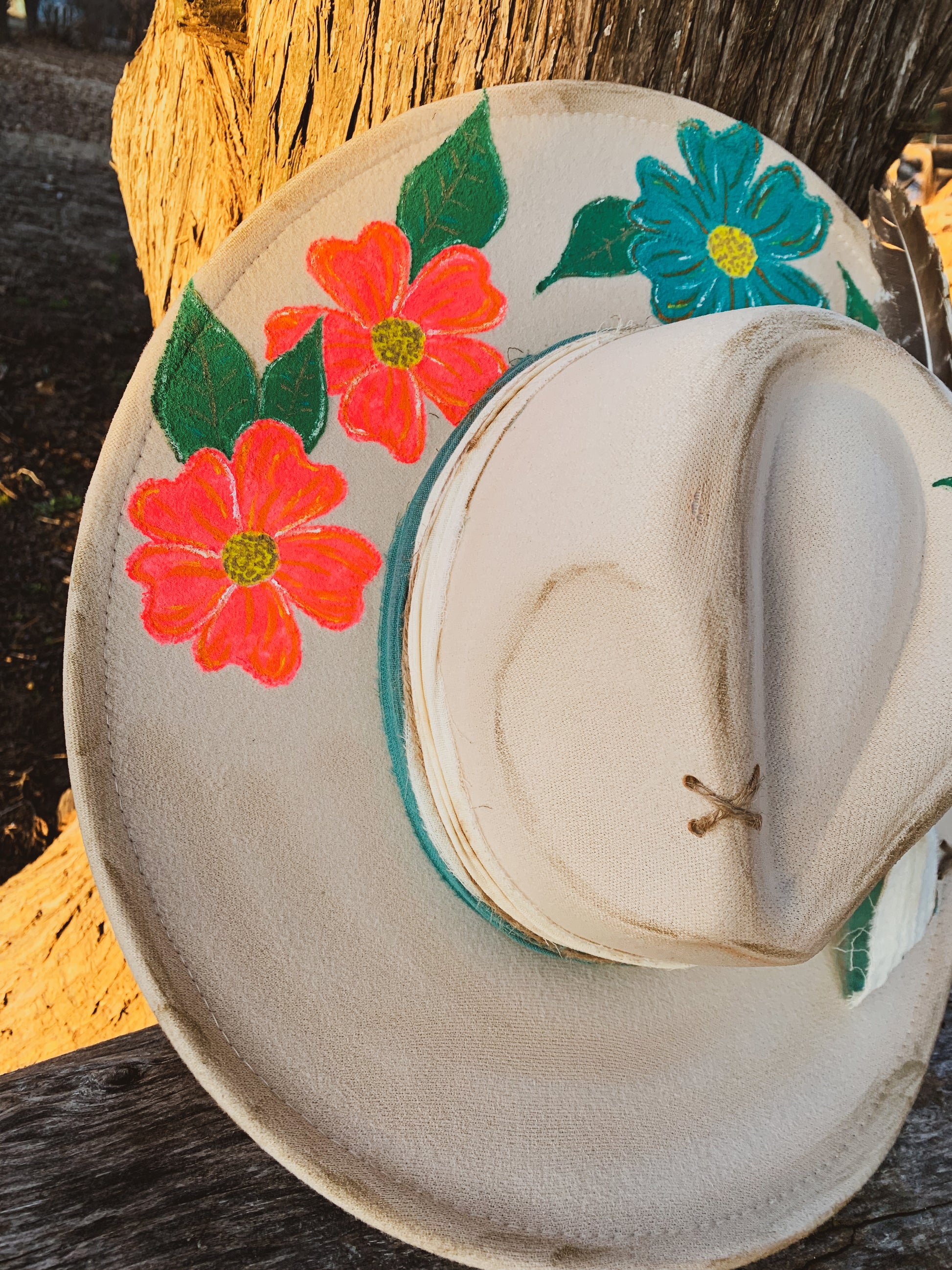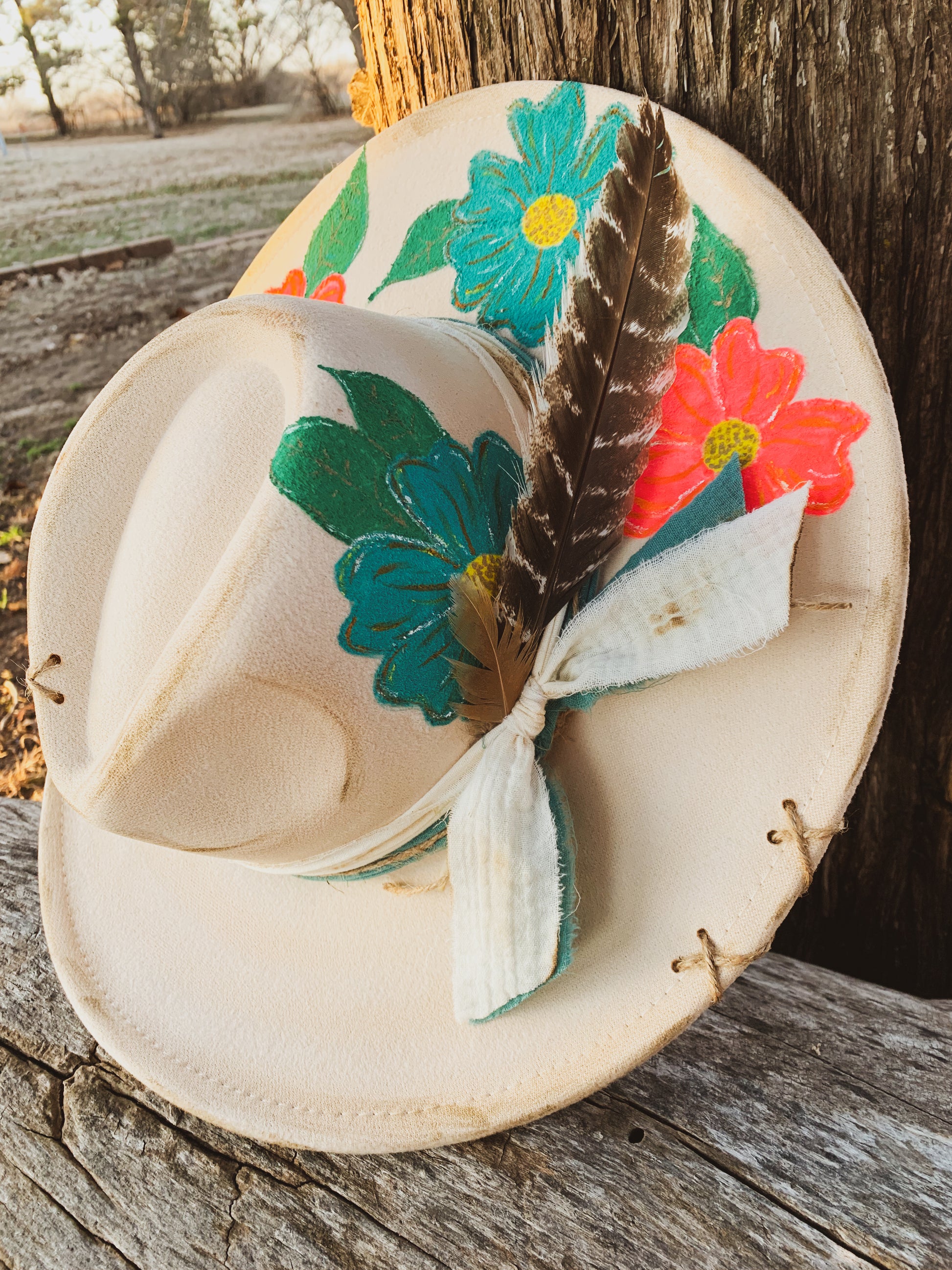 A beautiful Hawaii inspired, ivory faux felt hat with pink and turquoise flowers hand painted on the brim. Two burned fabrics wrapped around and tied on the side with feathers. Twine Xs on brim. Adjustable drawstrings inside to tighten. 3.5” brim, 22” circumference. 35% polyester, 65% cotton.