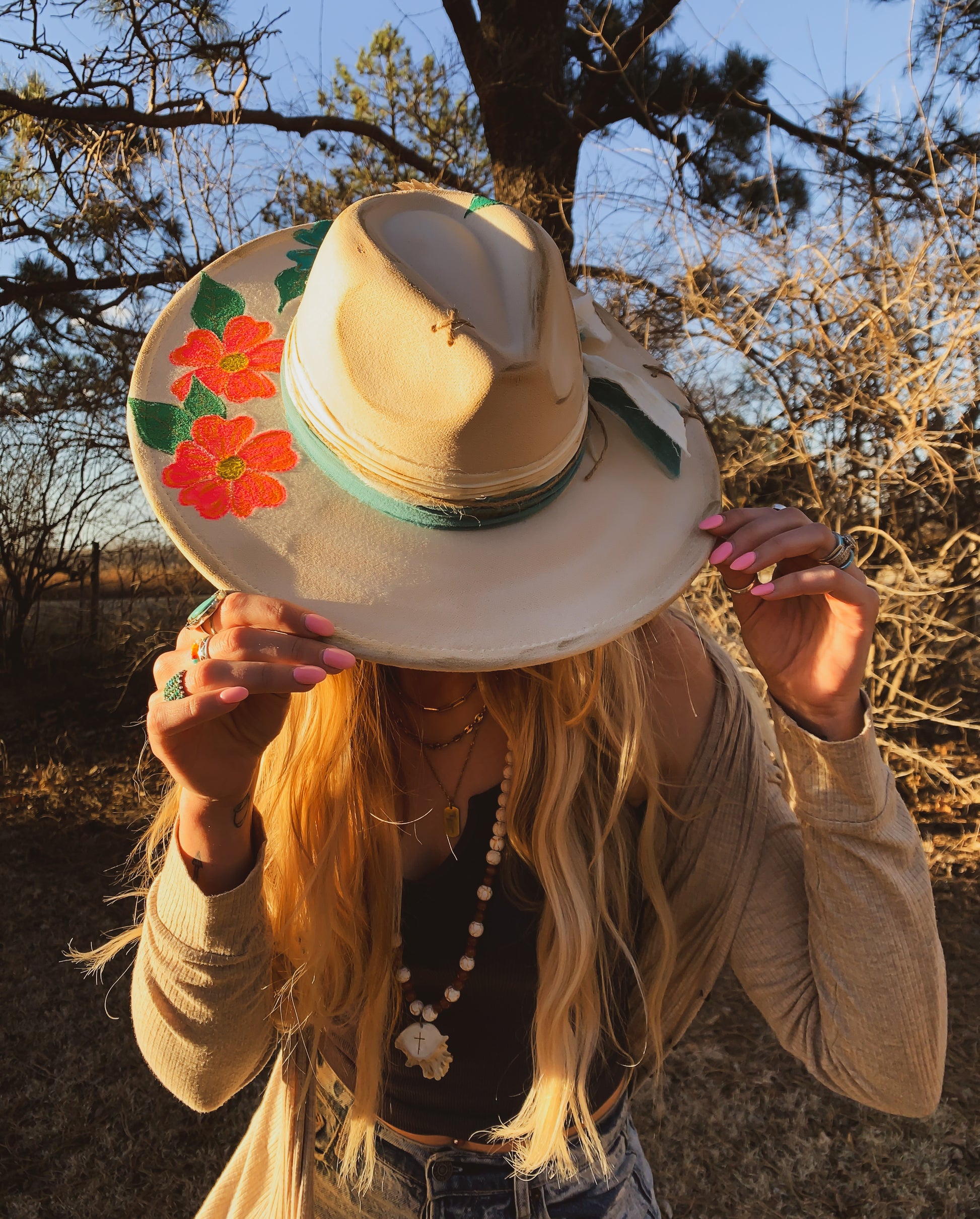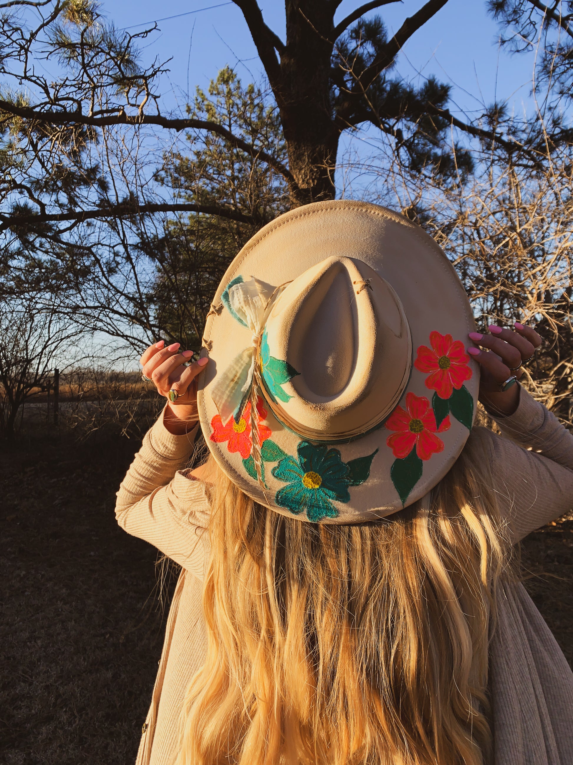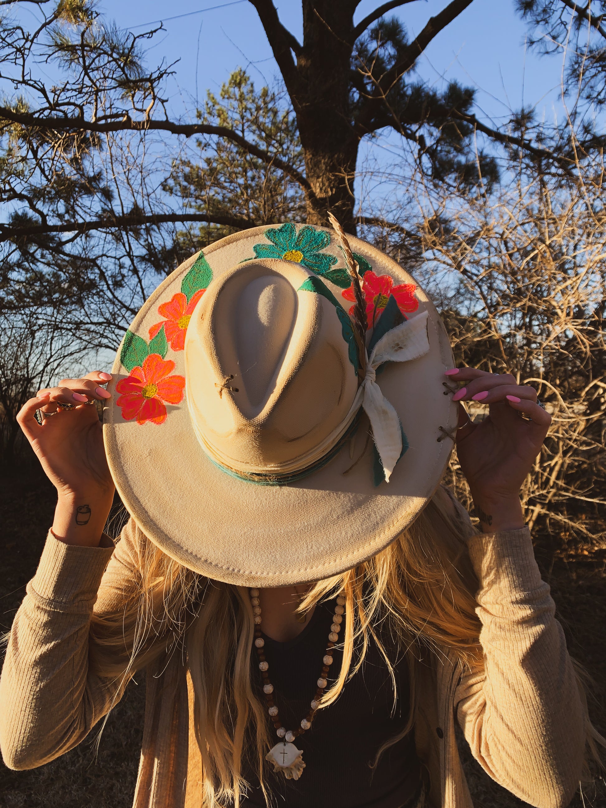 A beautiful Hawaii inspired, ivory faux felt hat with pink and turquoise flowers hand painted on the brim. Two burned fabrics wrapped around and tied on the side with feathers. Twine Xs on brim. Adjustable drawstrings inside to tighten. 3.5” brim, 22” circumference. 35% polyester, 65% cotton.