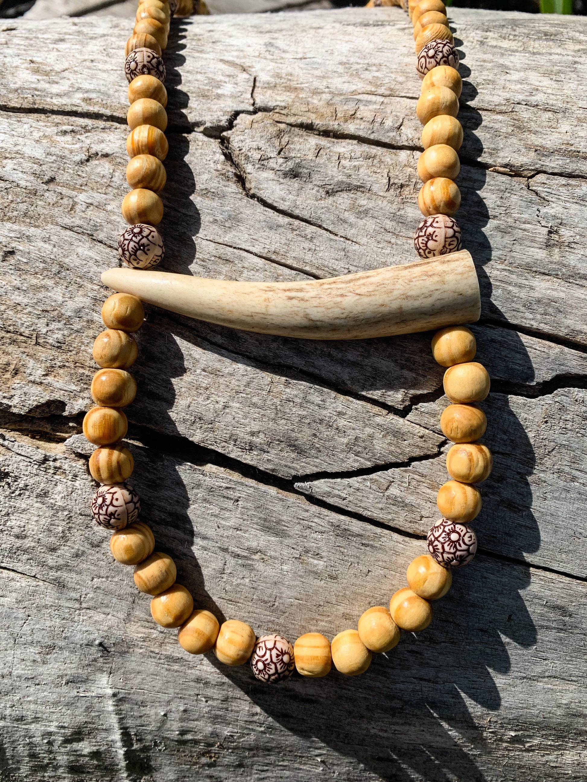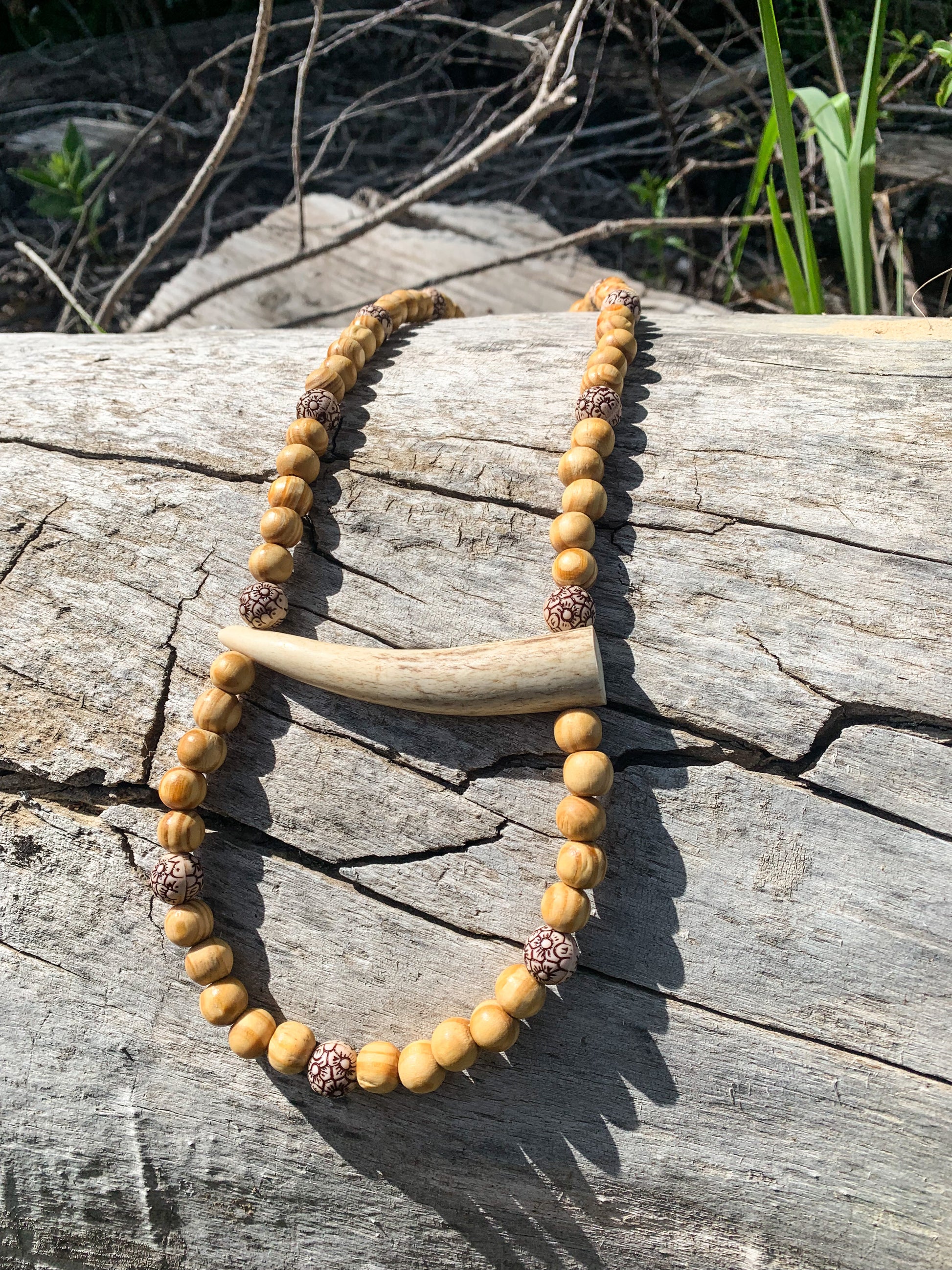 Natural oak colored beads with a floral print accent bead. Authentic horizontal antler piece.