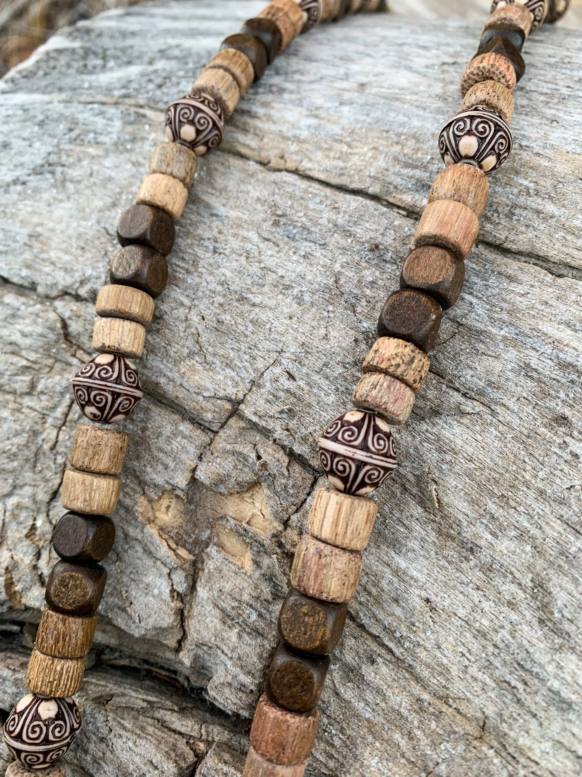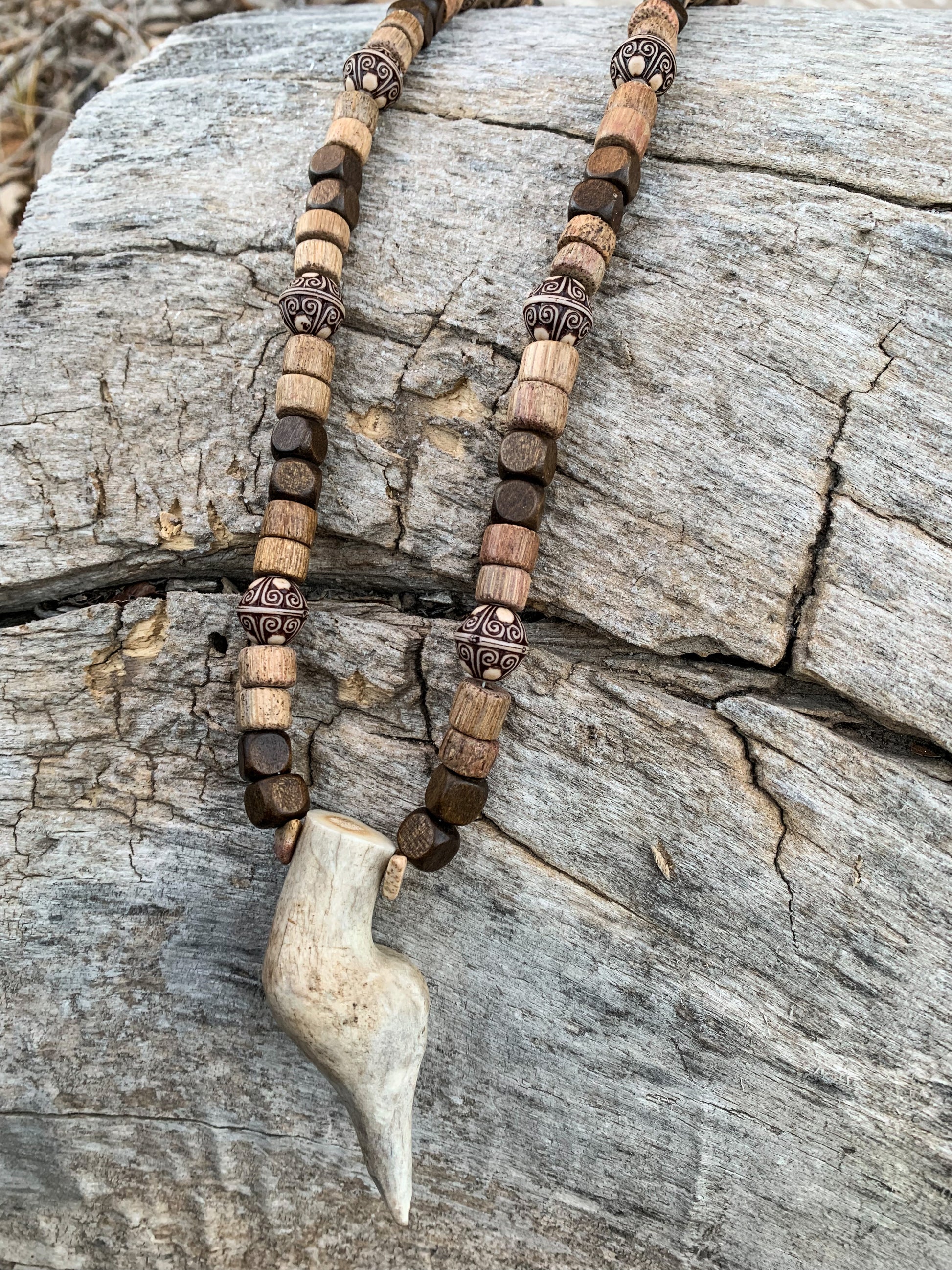 Dark and light brown wooden beads with an incredibly unique authentic antler piece in the middle. Handmade.
