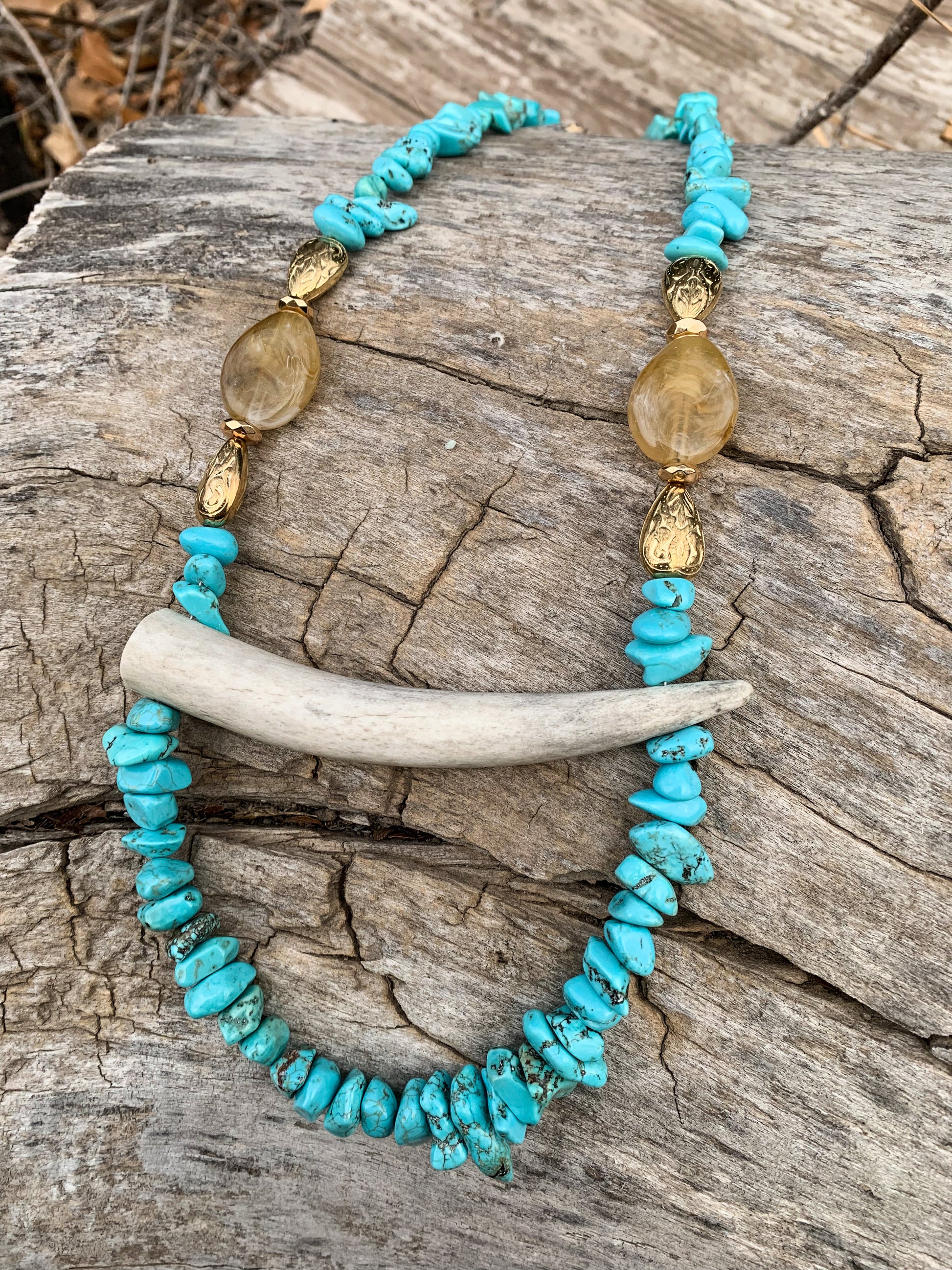 Faux Turquoise rock beads with gorgeous golden bead design and horizontal authentic antler piece. Handmade.