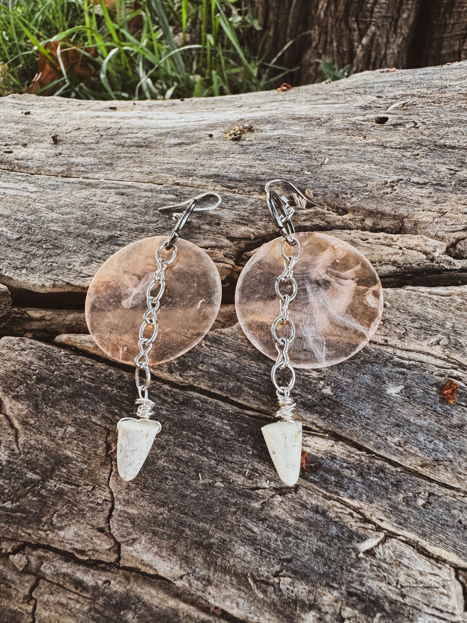 Coral colored shell circles and dainty authentic antler tips hanging from a silver chain. Handmade. One of a kind.