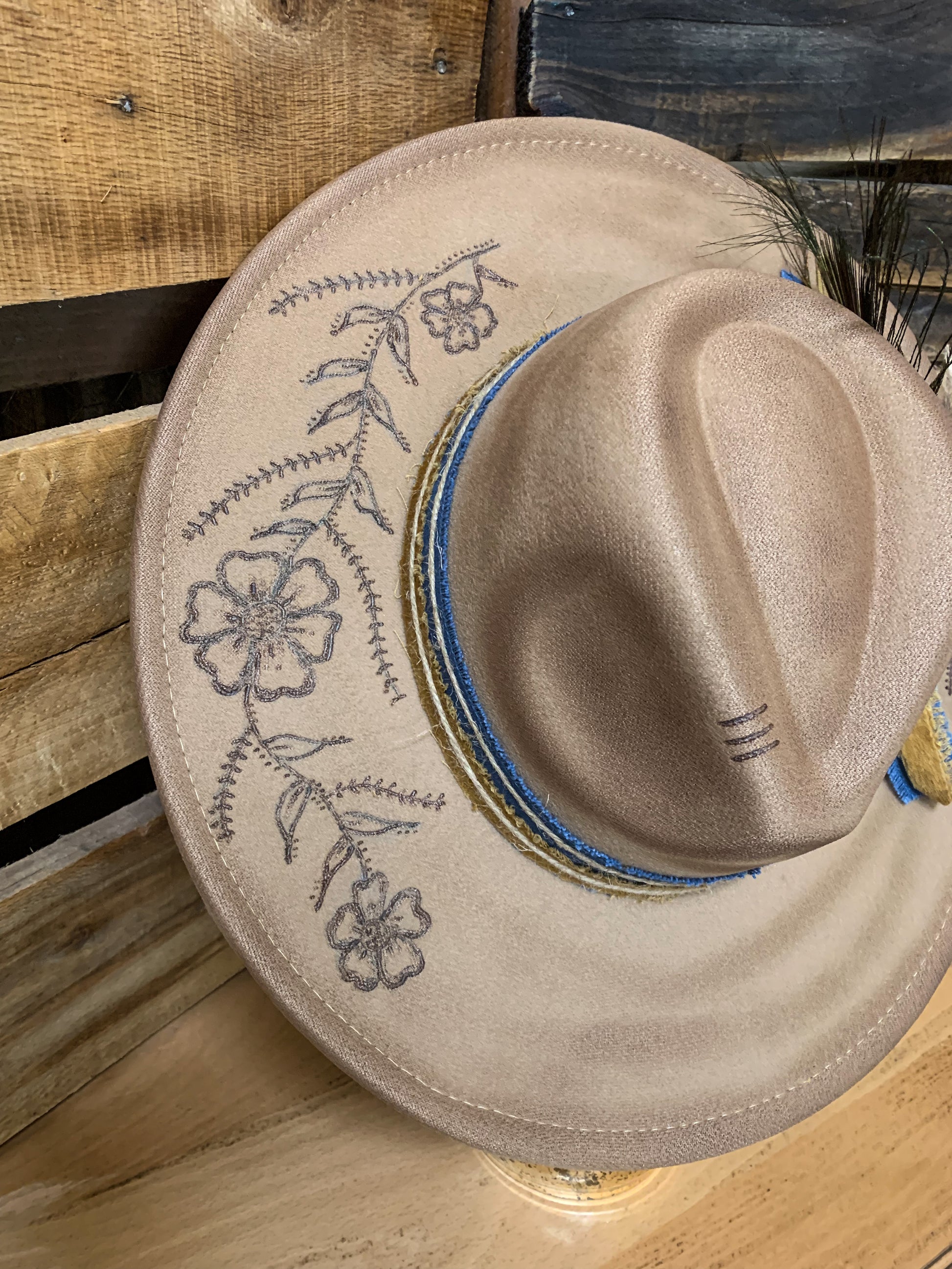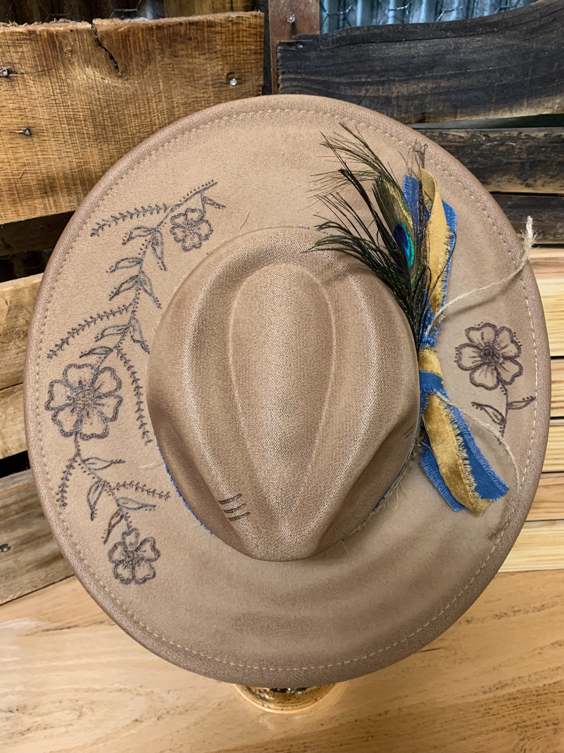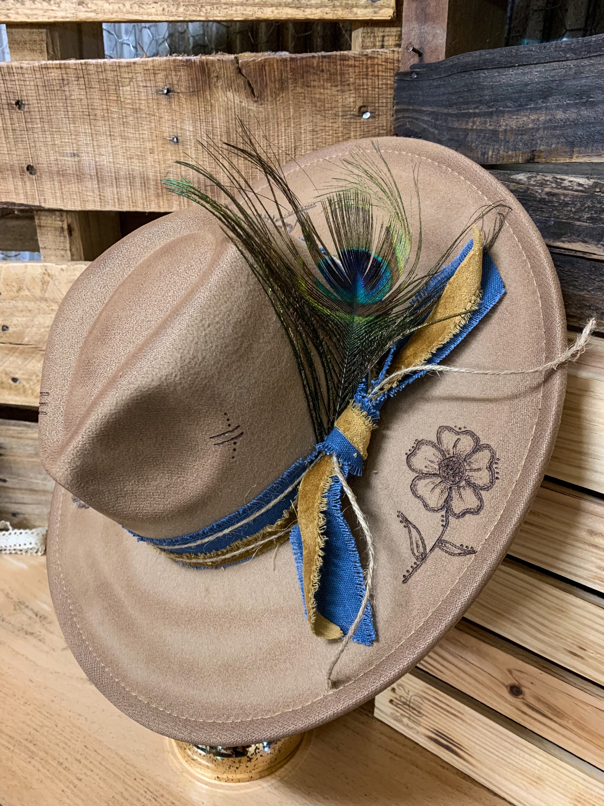 A beautiful tan faux felt hat with floral design burned into brim and blue and gold fabric wrapped around. Peacock feather on the side! Adjustable drawstrings inside to tighten. 3.5” brim, 22” circumference. 35% polyester, 65% cotton.