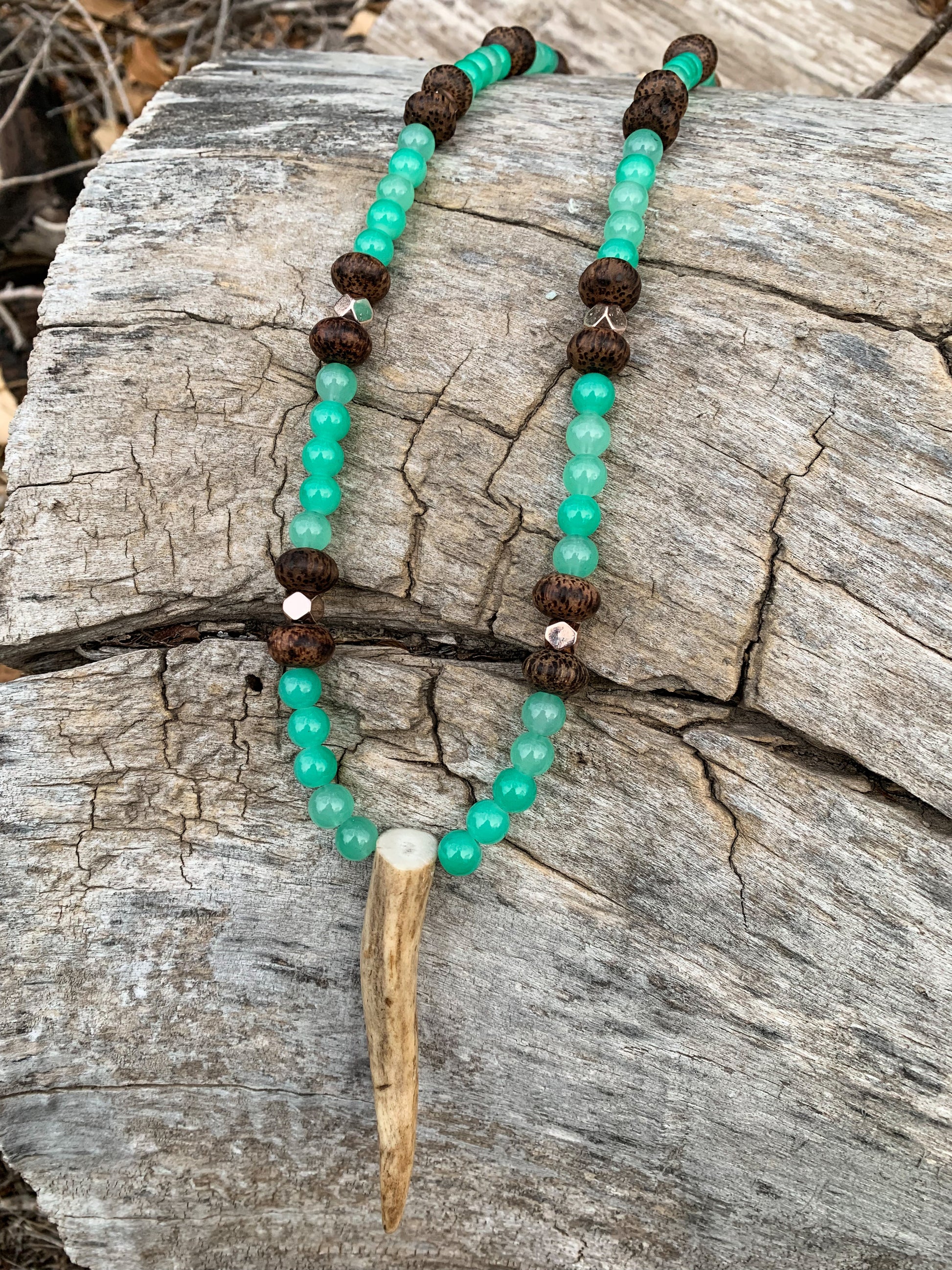Gorgeous teal glass beads with wooden and gold accent pieces and a small authentic antler point. Handmade.