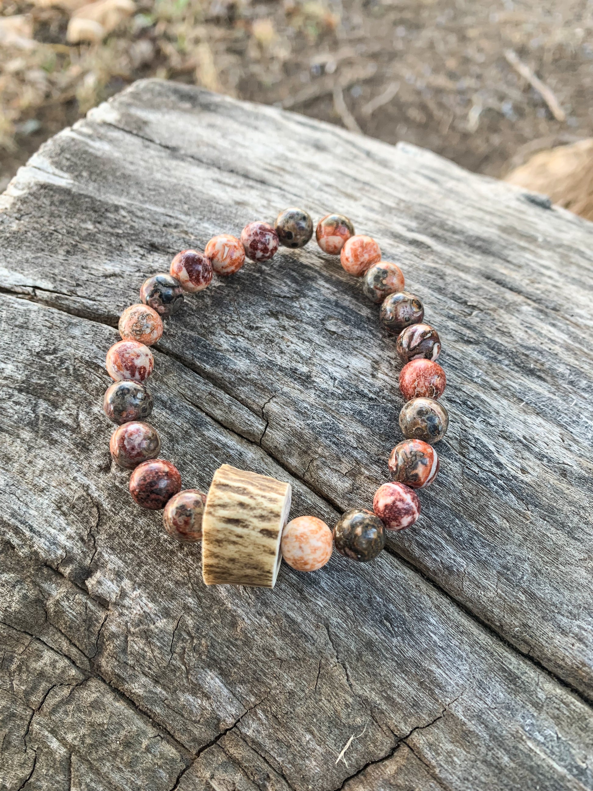 Fun pink/maroon/black beads with a small textured Elk antler piece in the middle. Handmade.