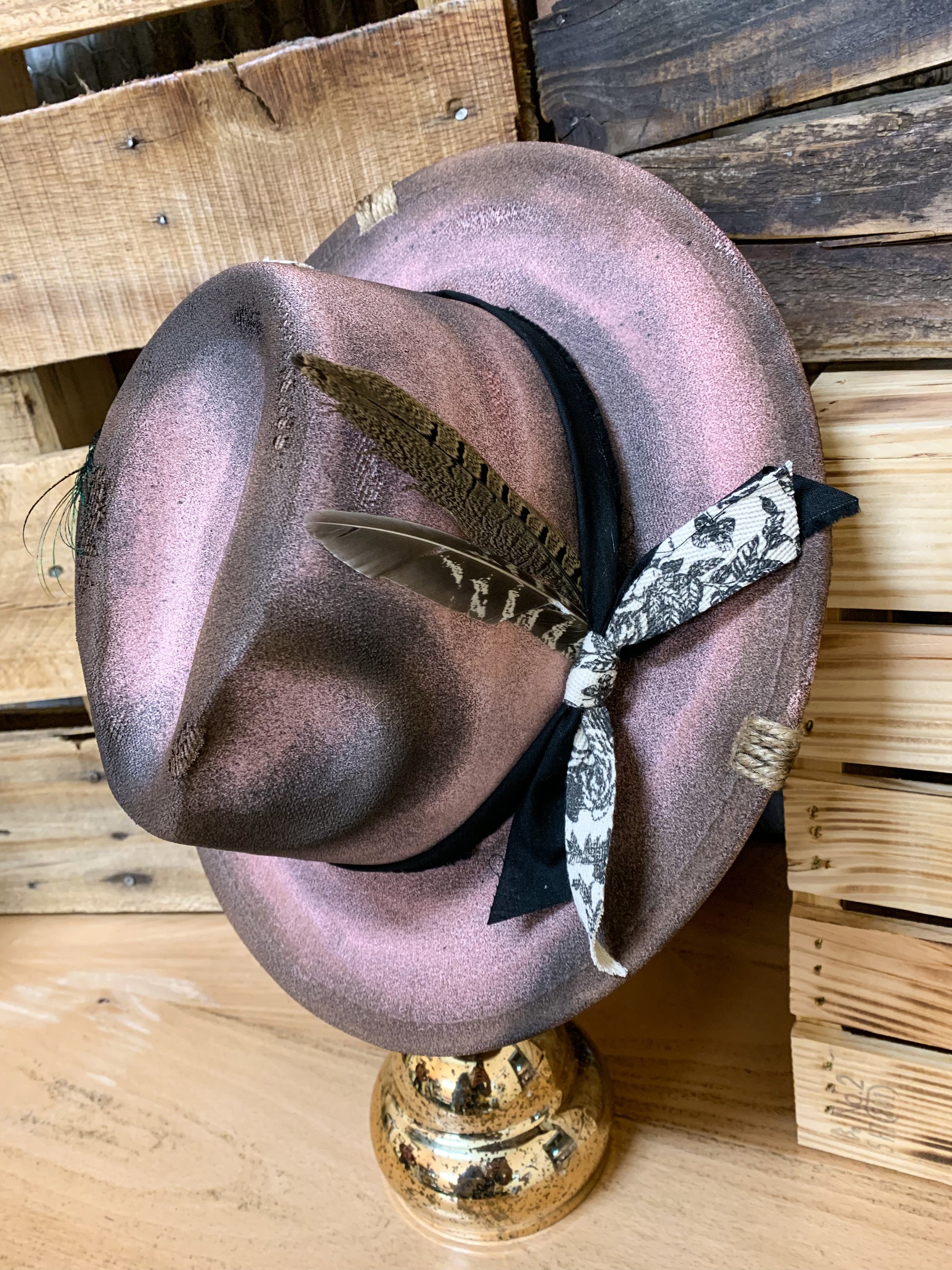 A light pink hat with brown and black distress color, with a black band and vintage rose accent piece, and 2 pheasant feathers on one side and a peacock feather on the other. 4.75” height. 2.75” brim. 22” circumference. 65% cotton, 35% polyester.