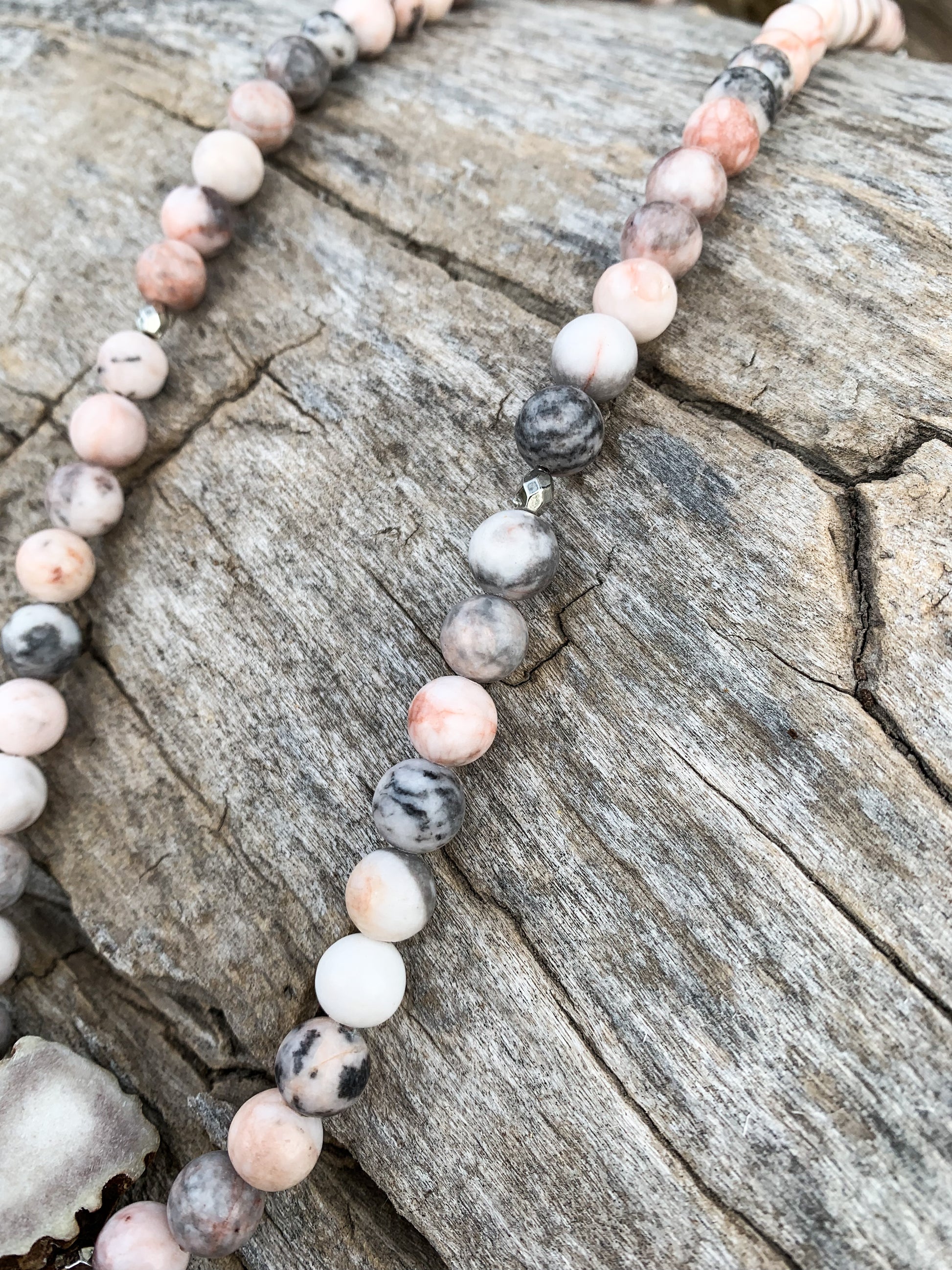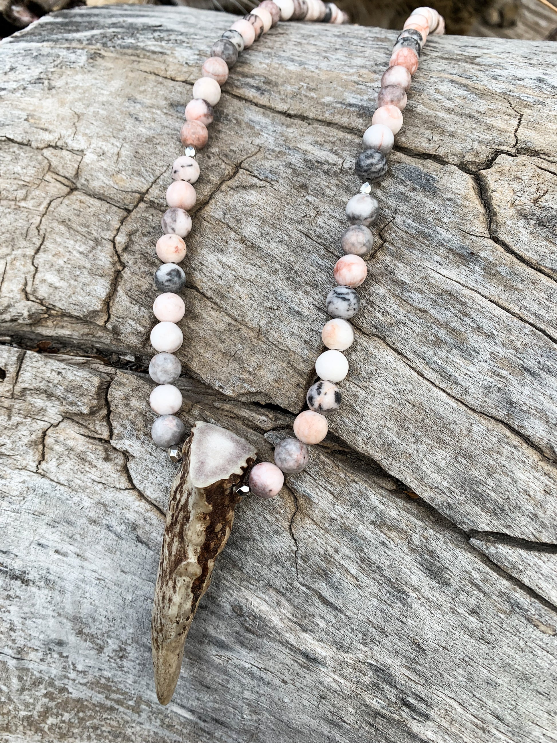Gorgeous pink and gray beads with a marble like look to them. Small silver accent beads in between. Textured authentic antler piece in center. Handmade.