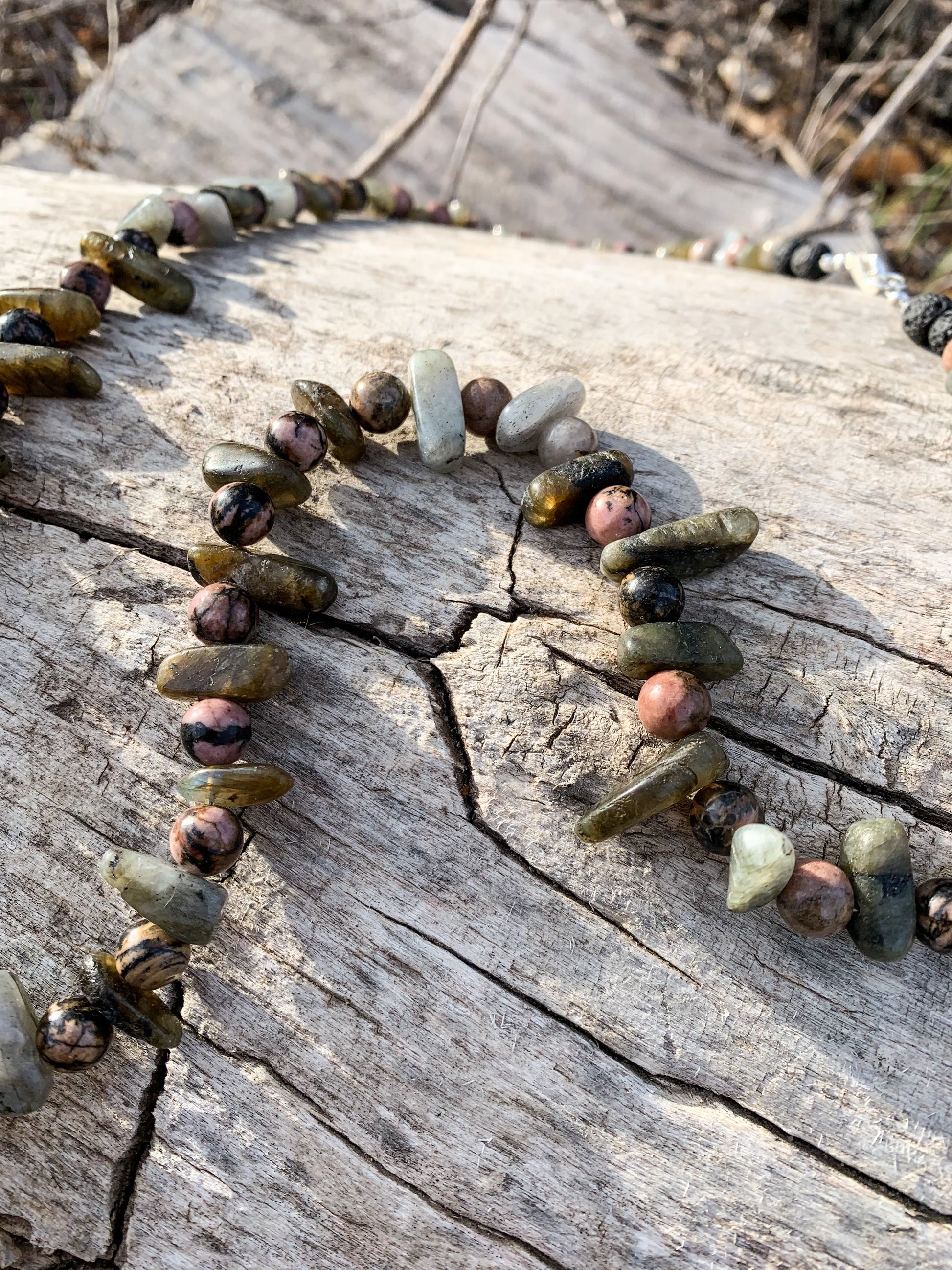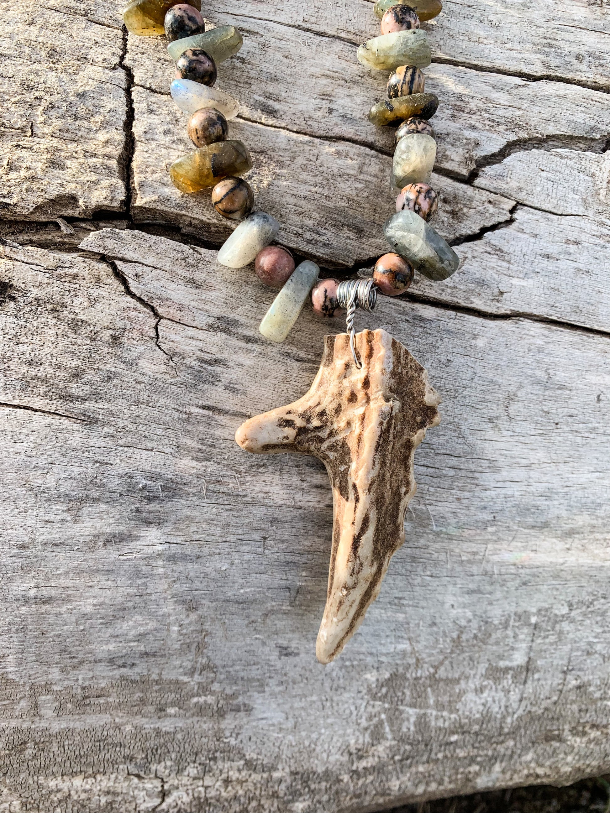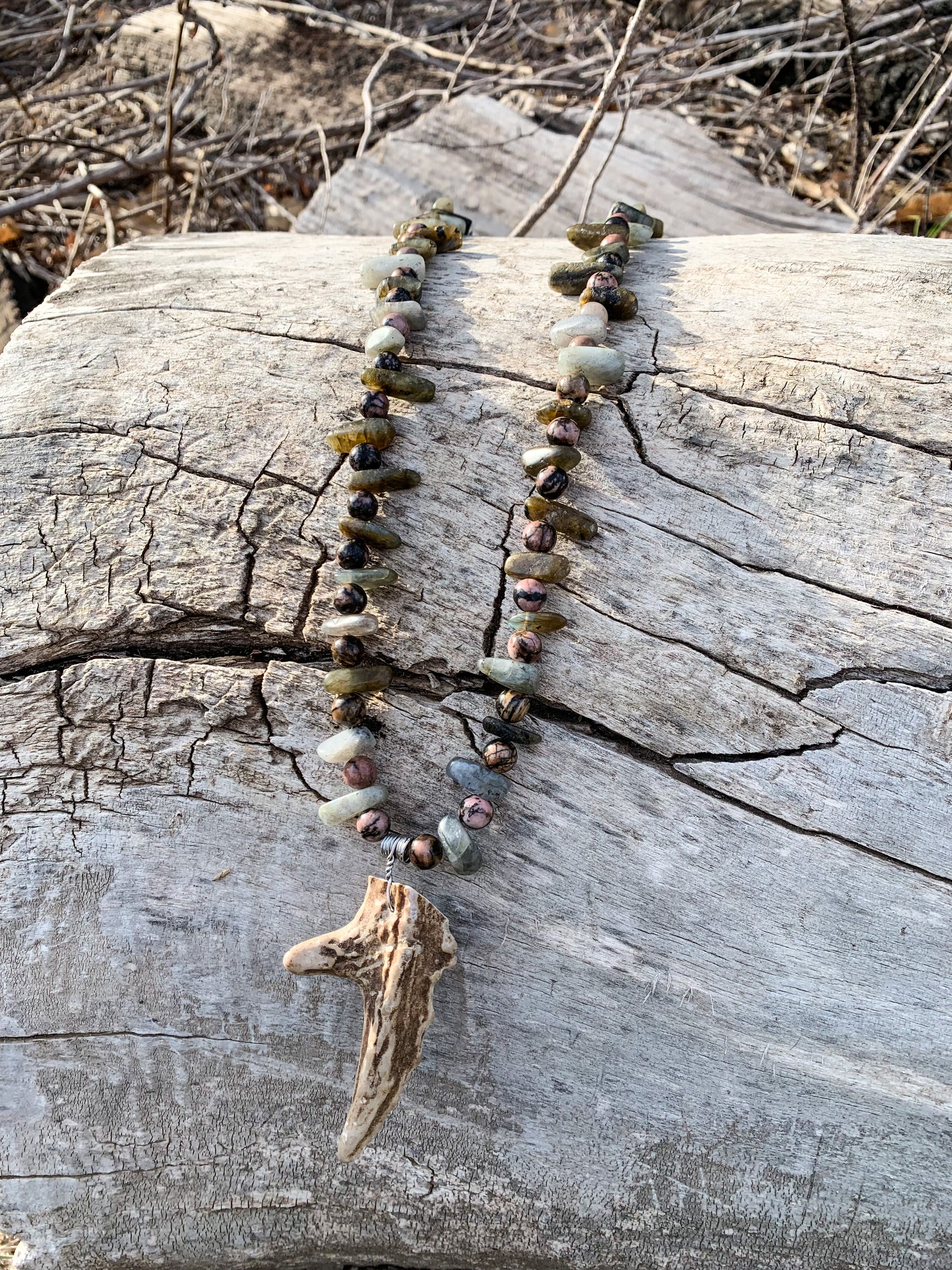Pink and black beads with black/grey rock beads and unique brow tine antler piece. Handmade. One of a kind.