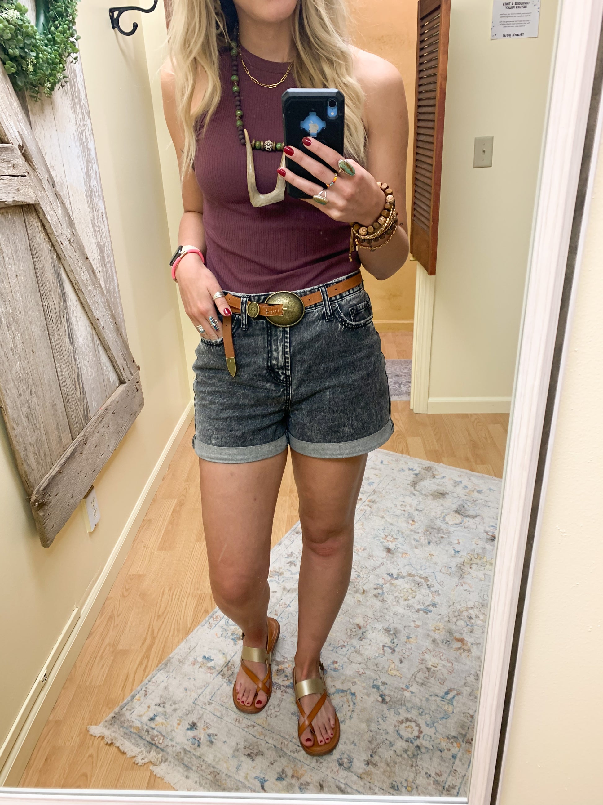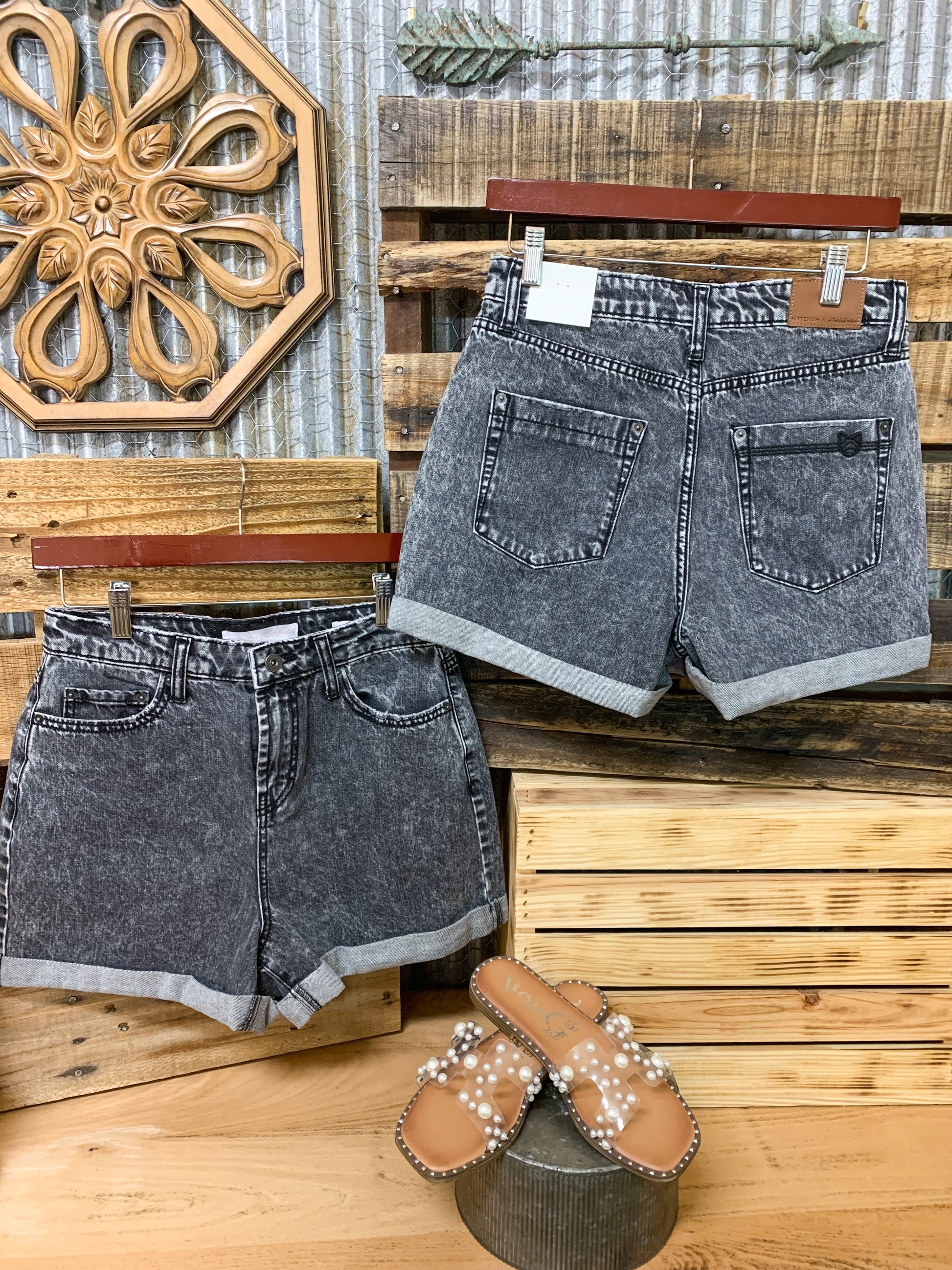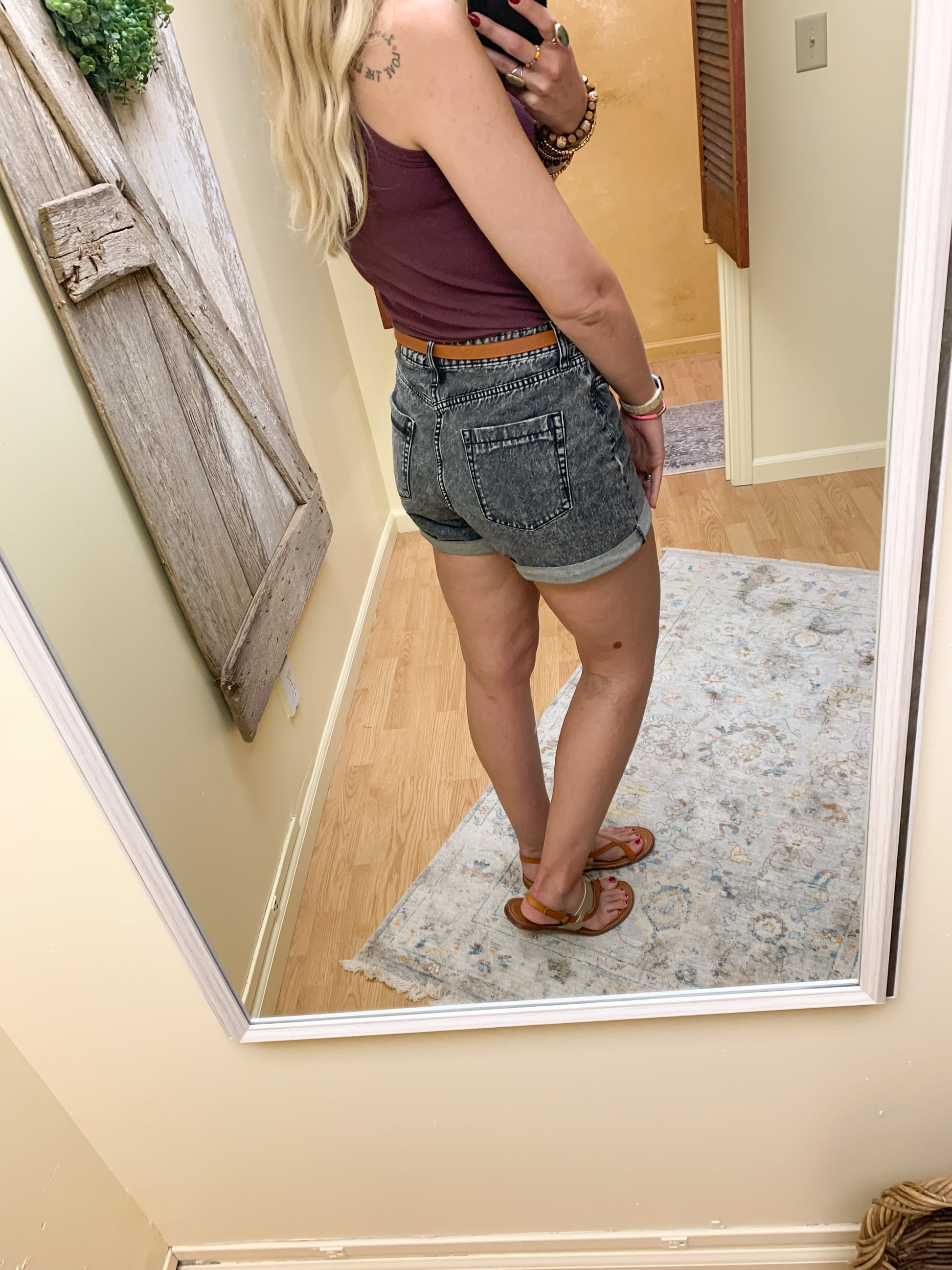 High waisted, faded black washed denim short with cuff at the bottom. 3” inseam. Size up two from your jean size! Bre is normally 27 jean, wearing 29 short in photo.