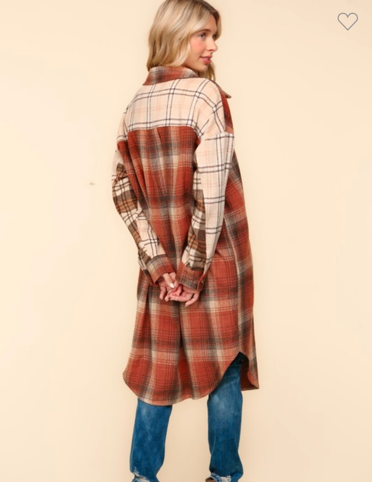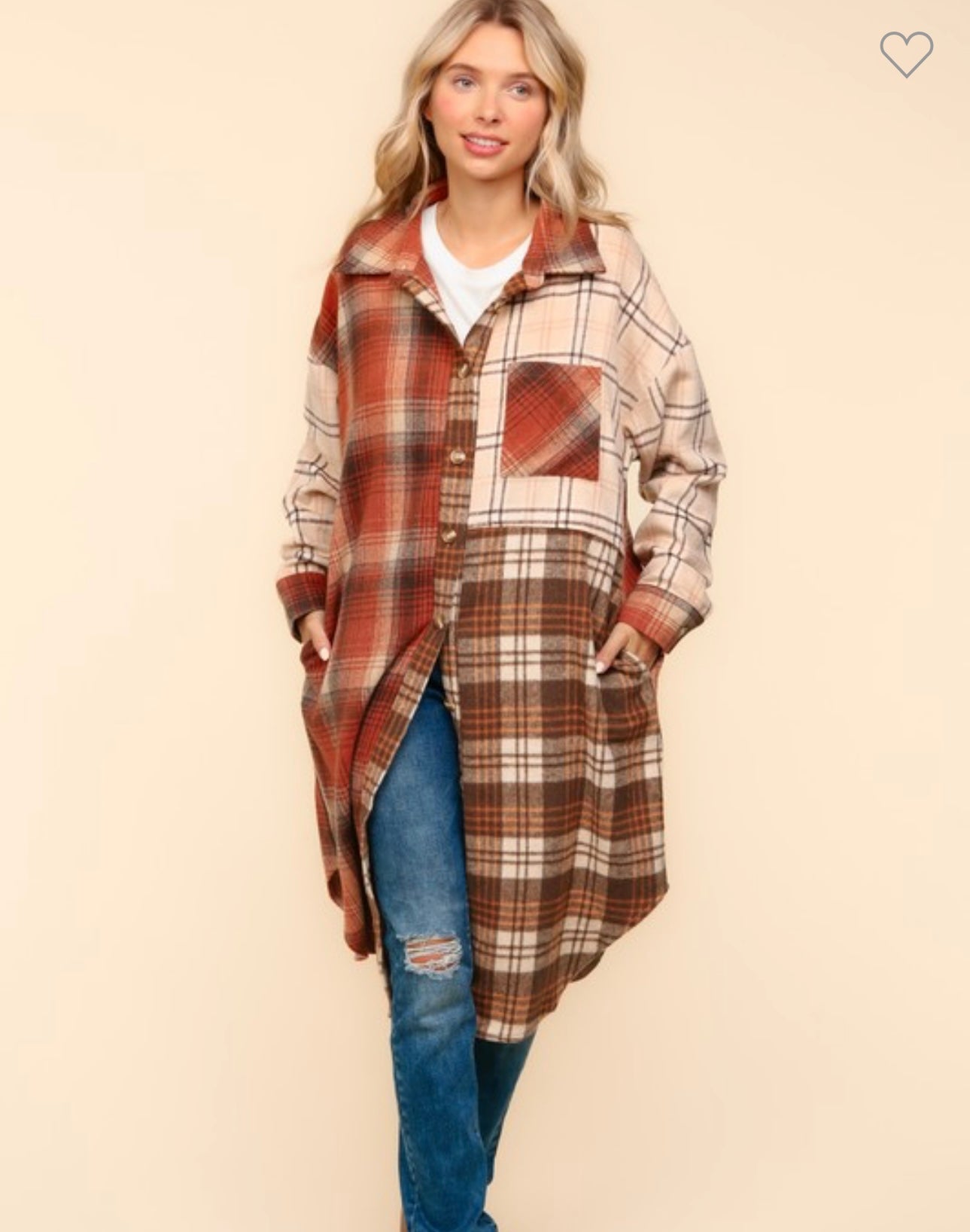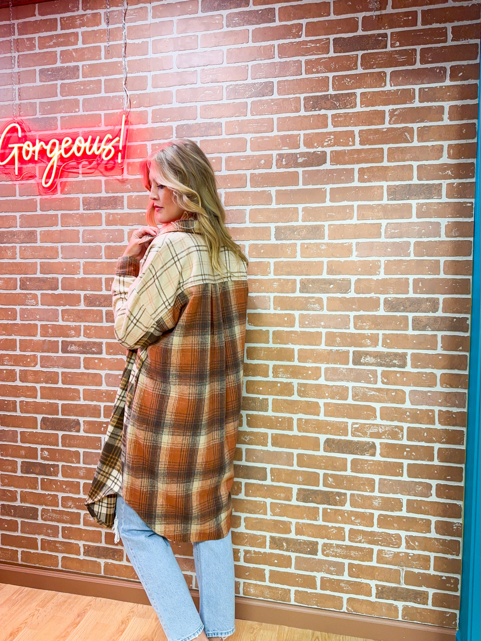 The Plaid Shacket features a warm and stylish flannel exterior, perfect for cooler weather. Its long length and functional buttons make it not only fashionable, but also practical for everyday wear. Upgrade your wardrobe with this must-have addition.