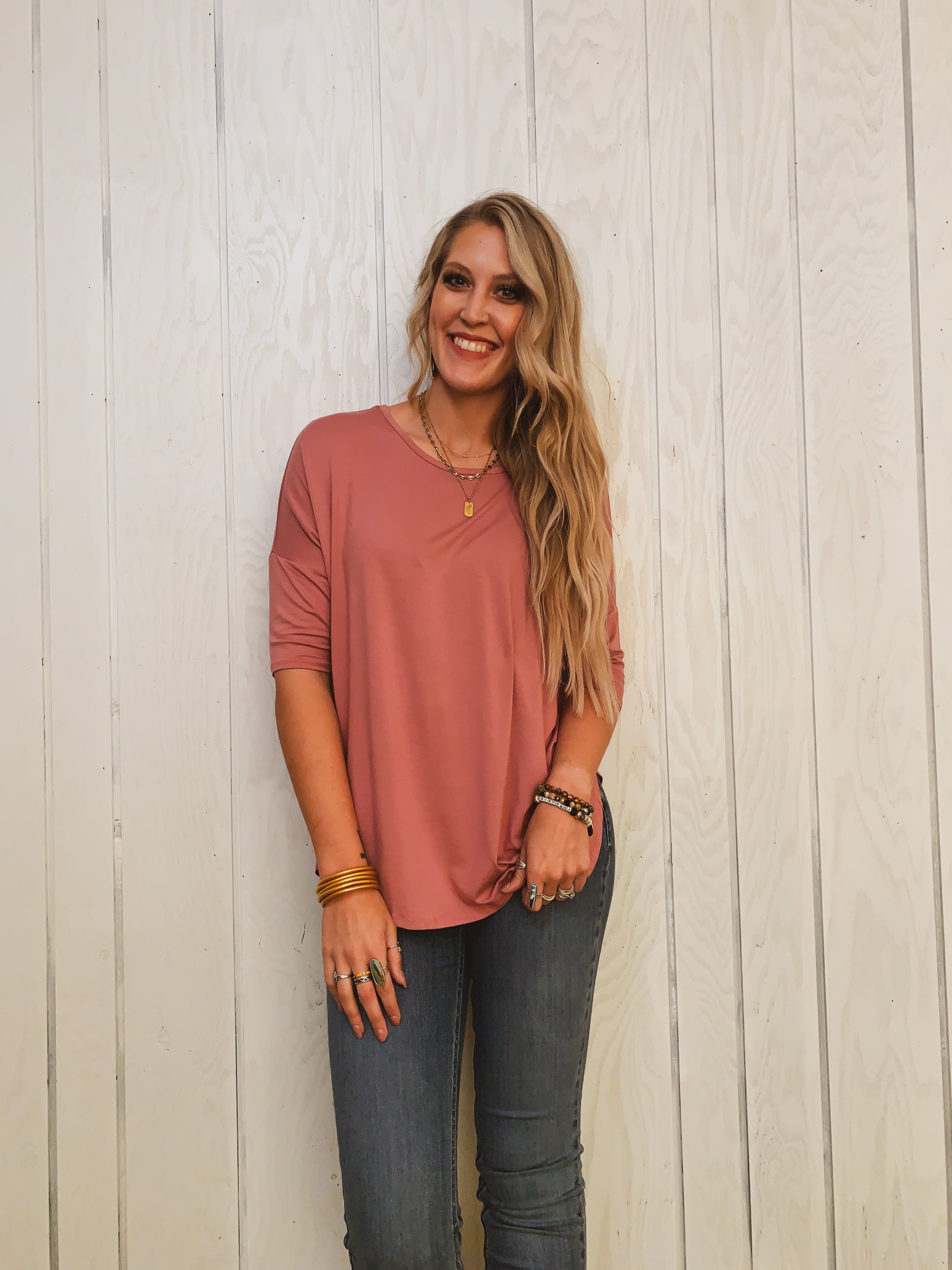 A super soft, stretchy fabric tunic with a crew neck look. Elbow length sleeves and loose fit. Bre is in size medium.