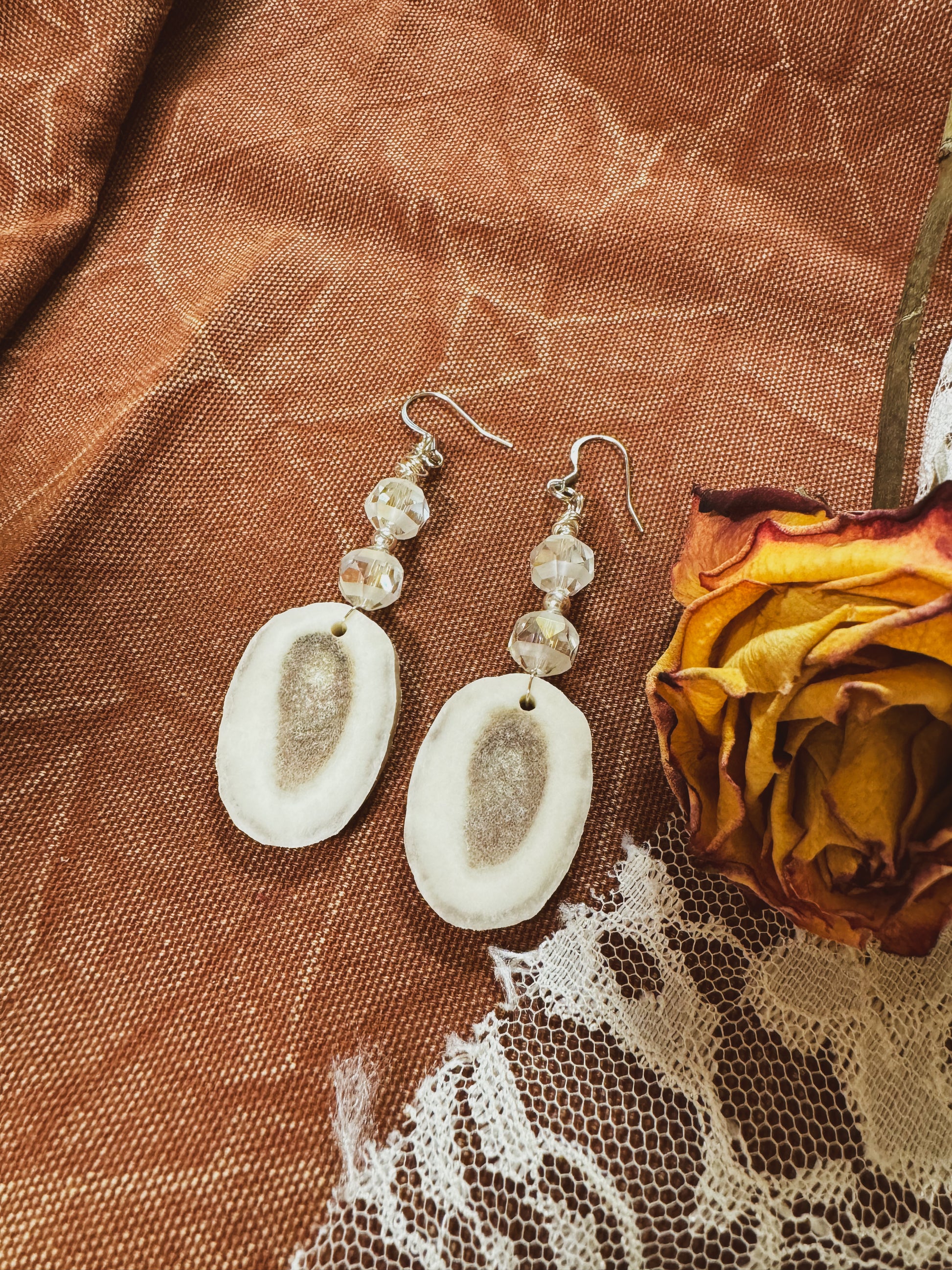 Add a touch of elegance to any outfit with our Princess Antler Earrings. These earrings feature shimmering clear glass beads, smoothed antler slabs, and dainty silver wire, creating a unique and sophisticated look. Embrace the beauty of nature with these stunning earrings. Handmade. One of a kind.