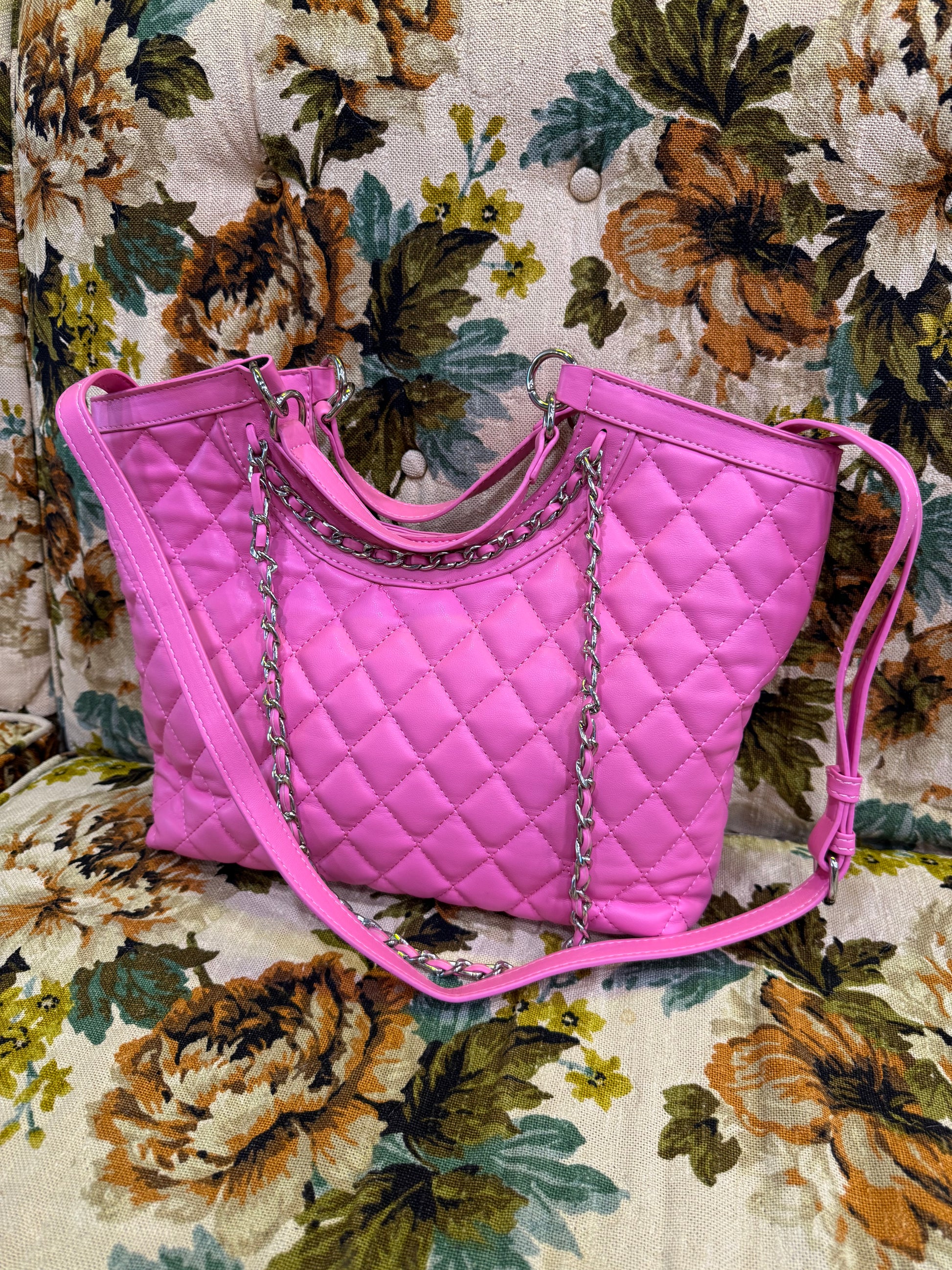 Quilted front look. Faux vegan leather. Zip top closure. Silver tone hardware. Detachable shoulder strap. L: 14.5, H: 10.5, W: 3.75