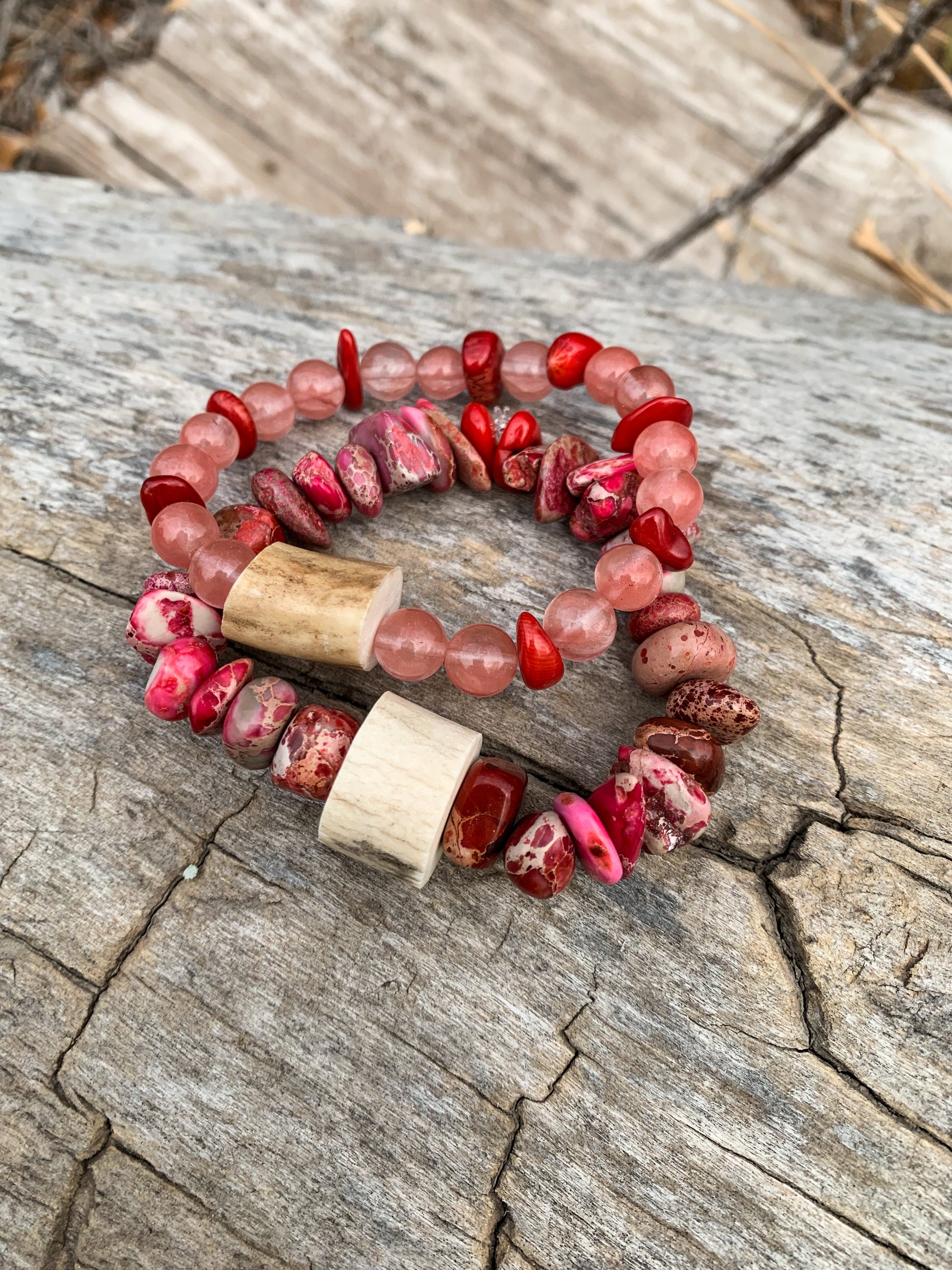 Red rock bead bracelet stacks with two antler pieces. Handmade.