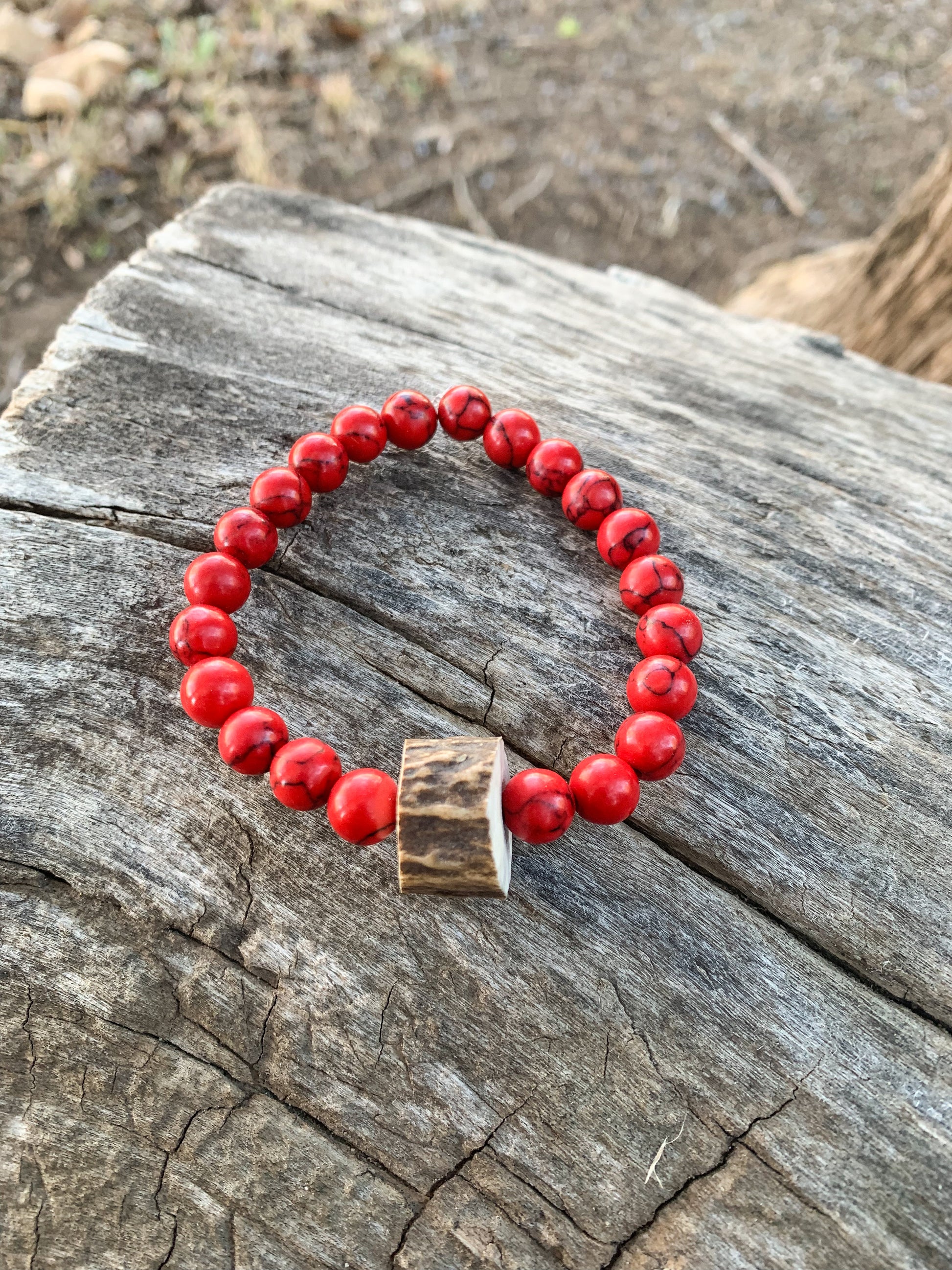 Red beads with black crackle design and a small textured Elk antler piece in the center. Handmade.