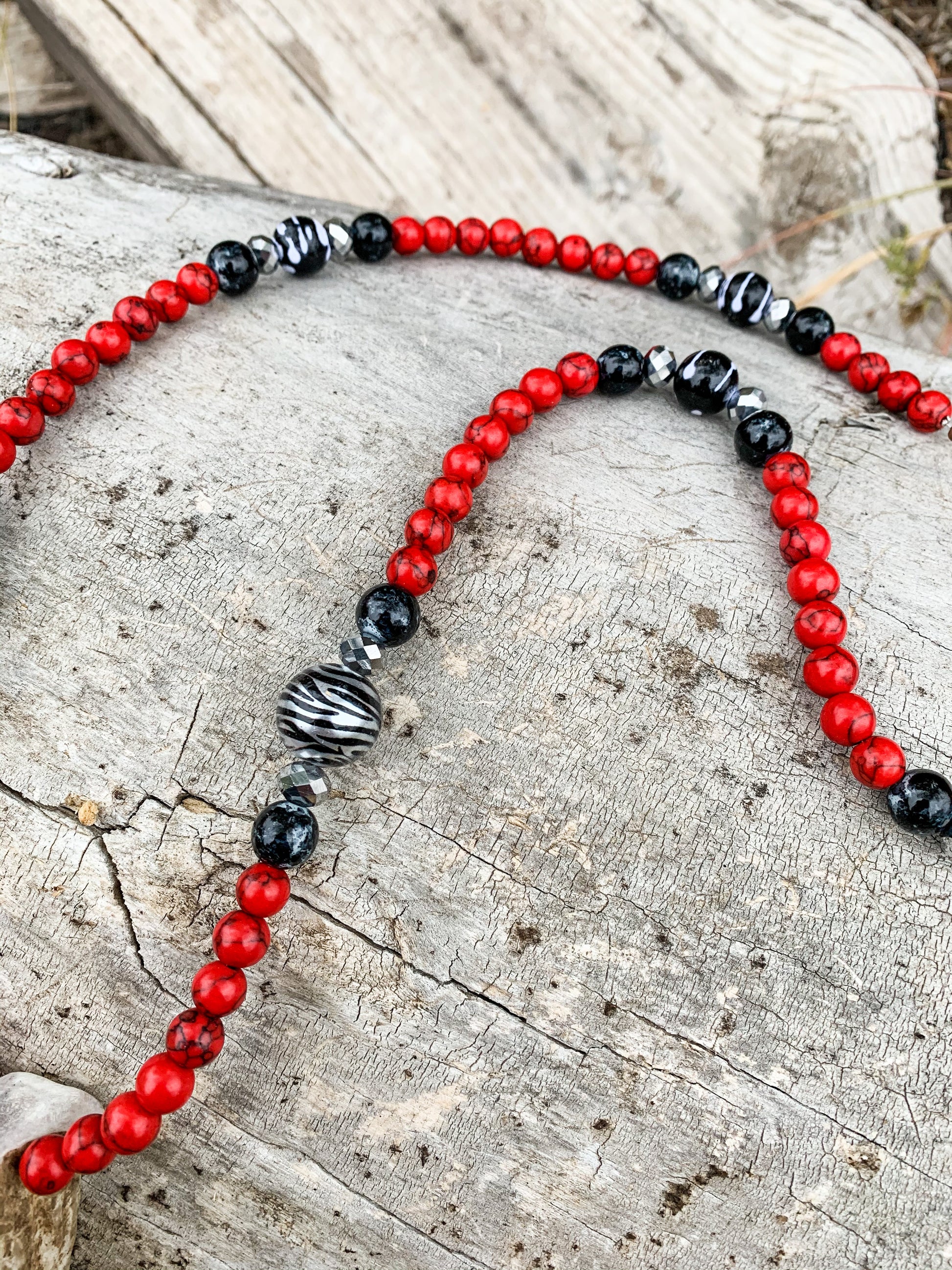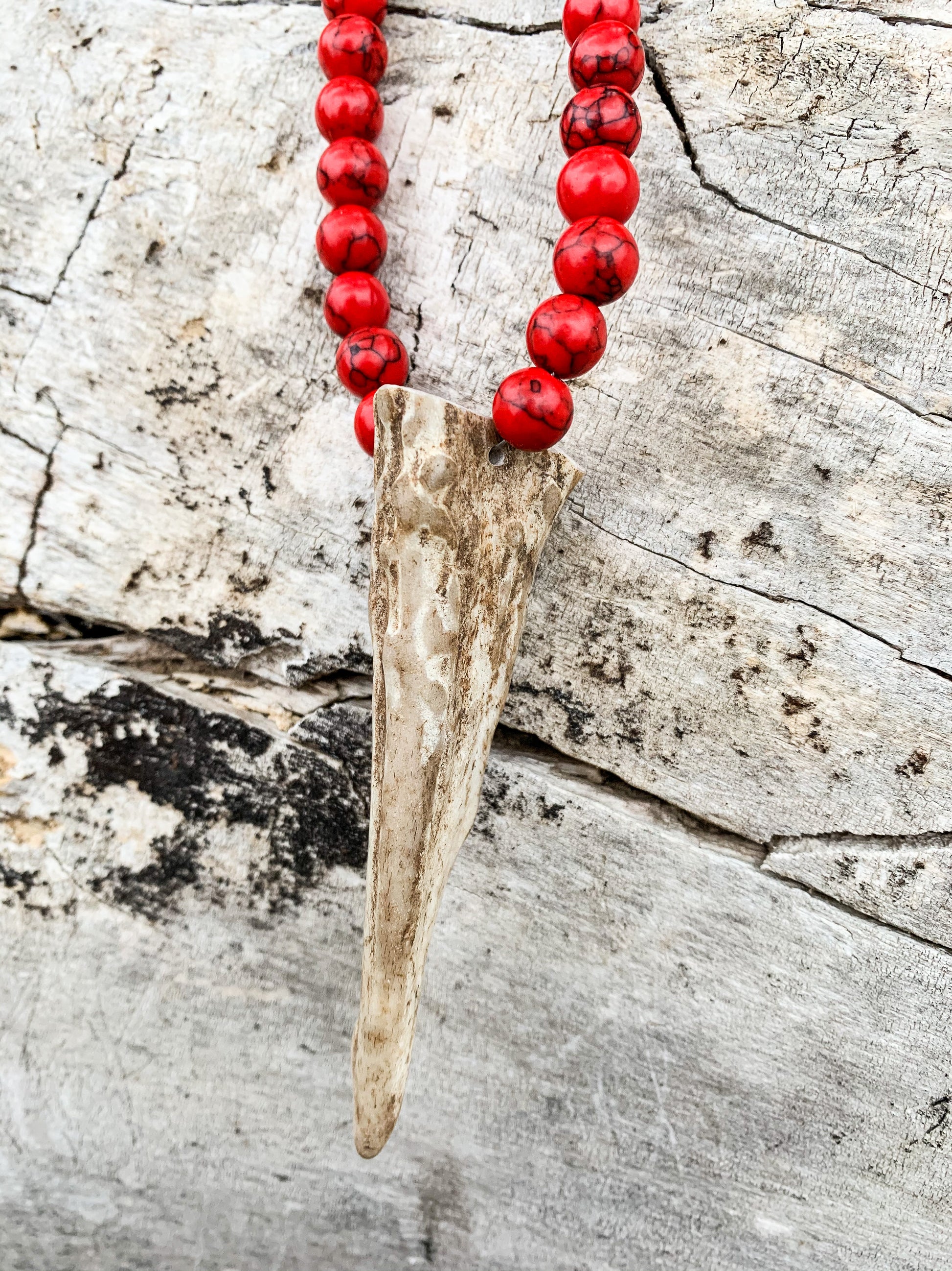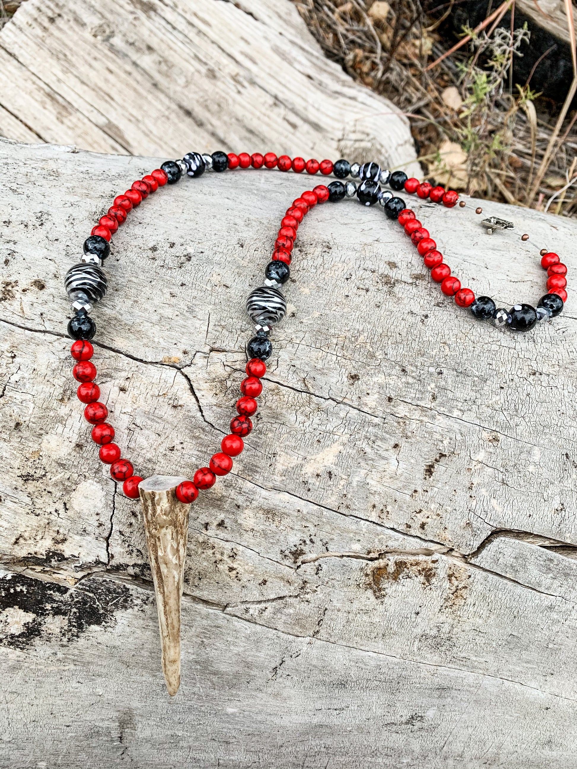 Red beads with black vein accents. Silver and black beads surrounding zebra striped larger beads. This has one of my favorite detailed brow tine antler pieces!