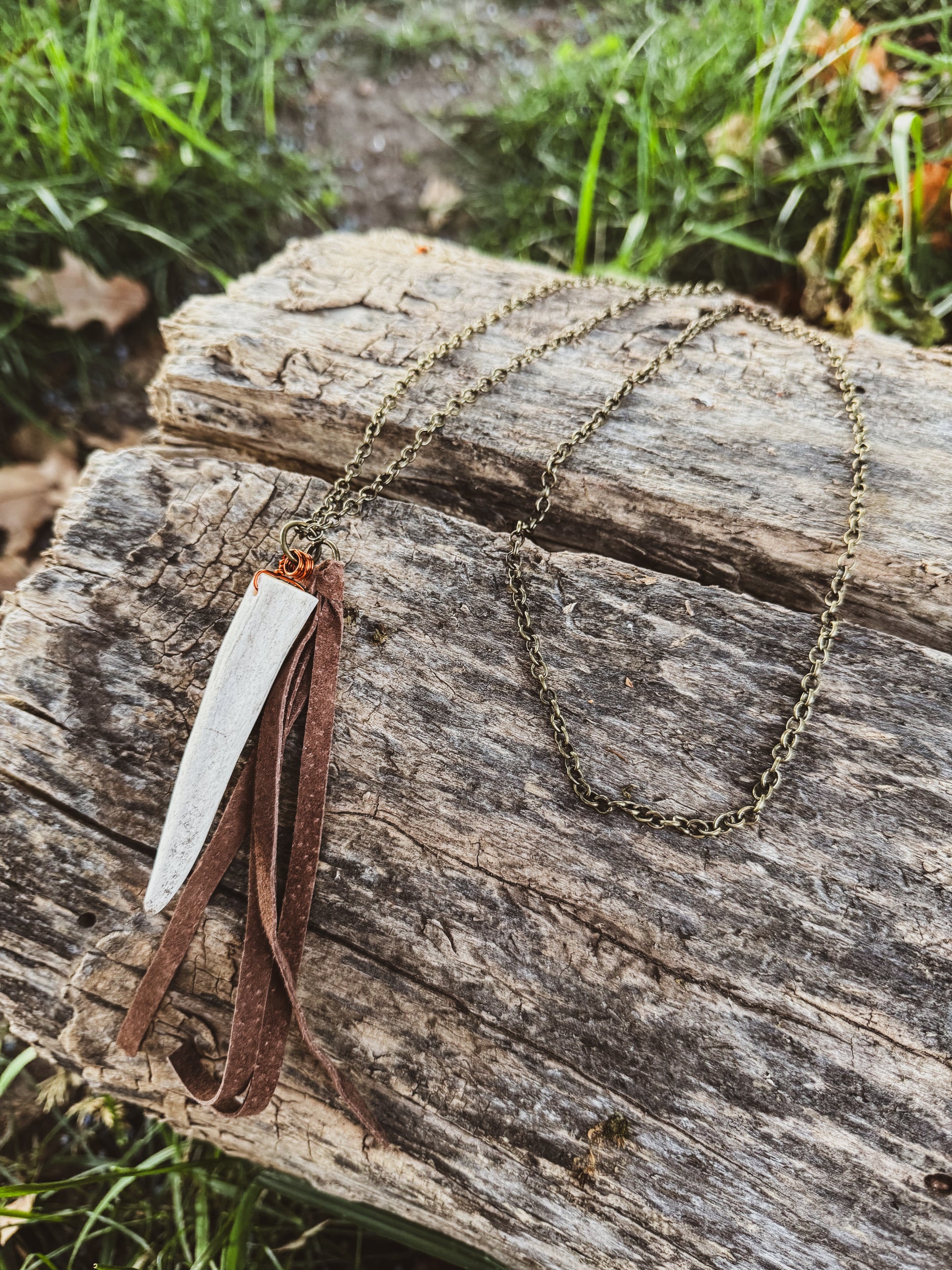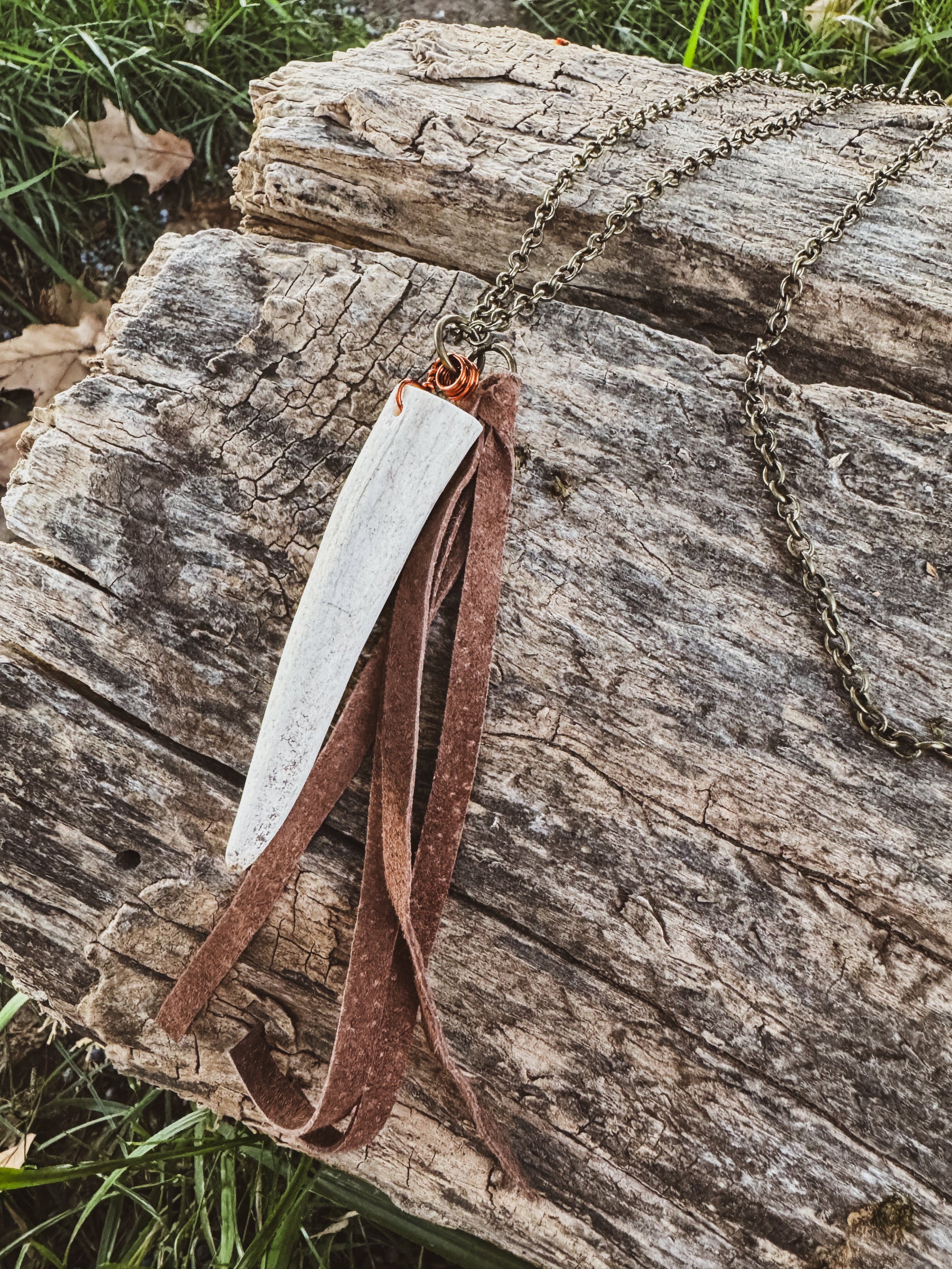 A 16.5” long chain with a simple authentic antler tip and leather fringe. The perfect amount of simple and unique to add a fun touch to any outfit! Handmade.