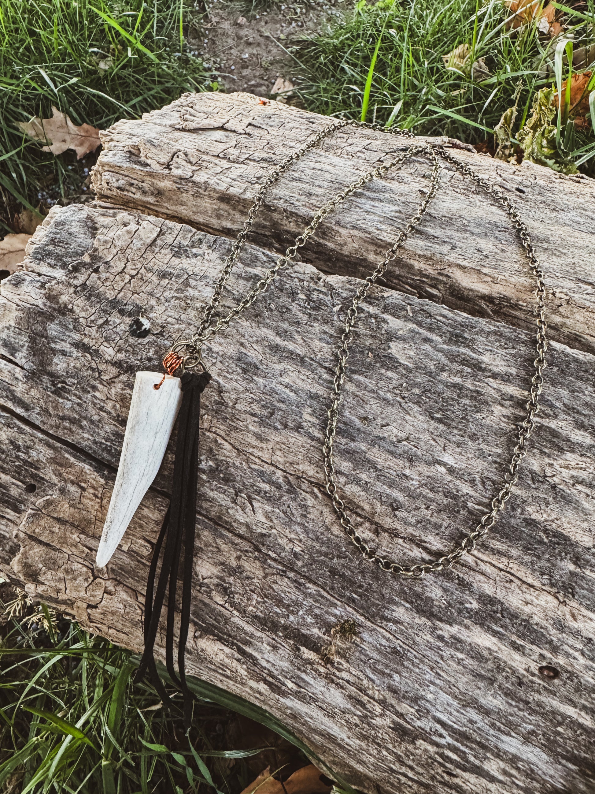 A 16.5” long chain with a simple authentic antler tip and faux leather fringe. The perfect amount of simple and unique to add a fun touch to any outfit! Handmade.