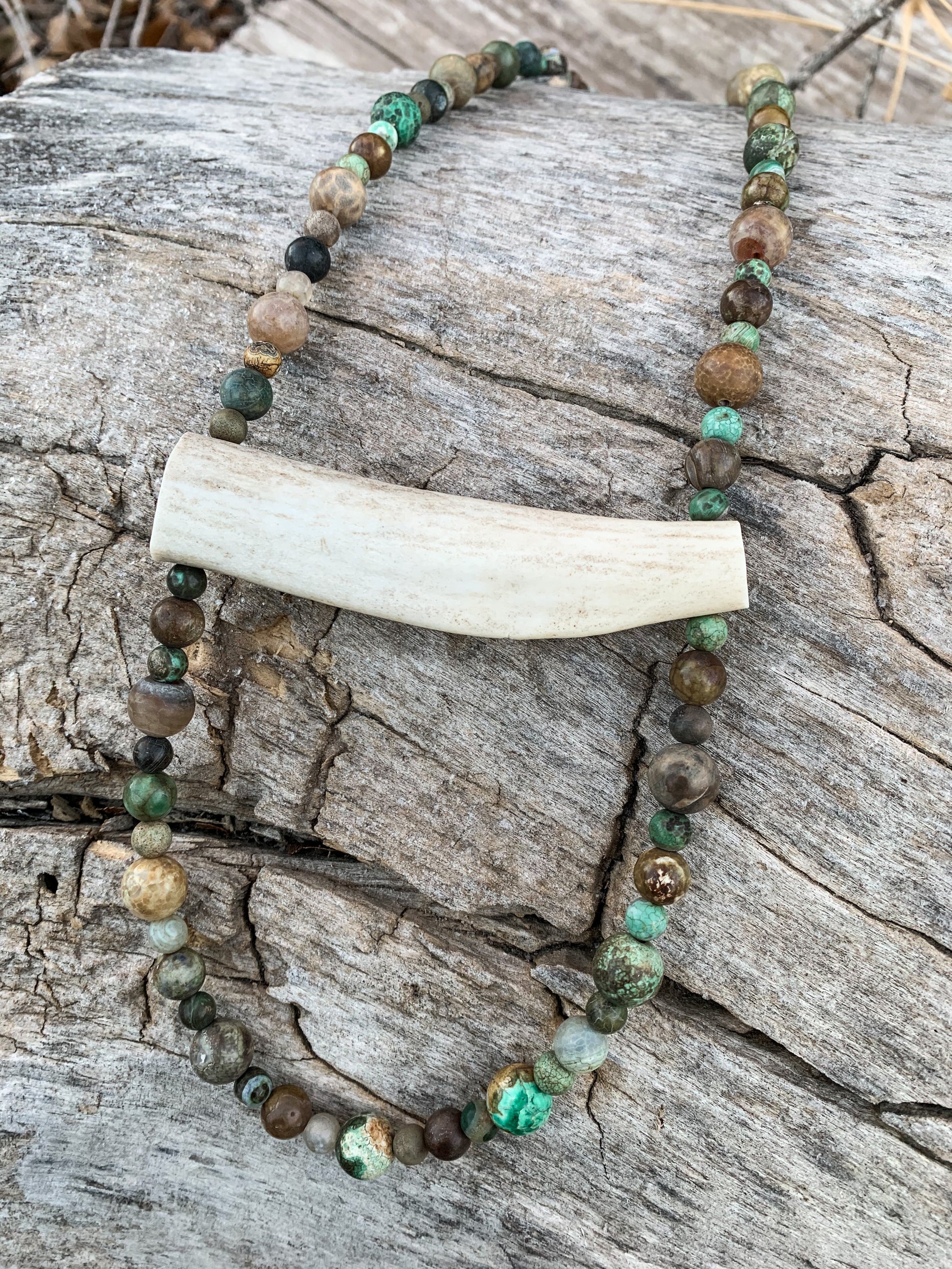 Gorgeous brown/green/rust colored beads of three different sizes, and an authentic antler piece going across. Handmade.