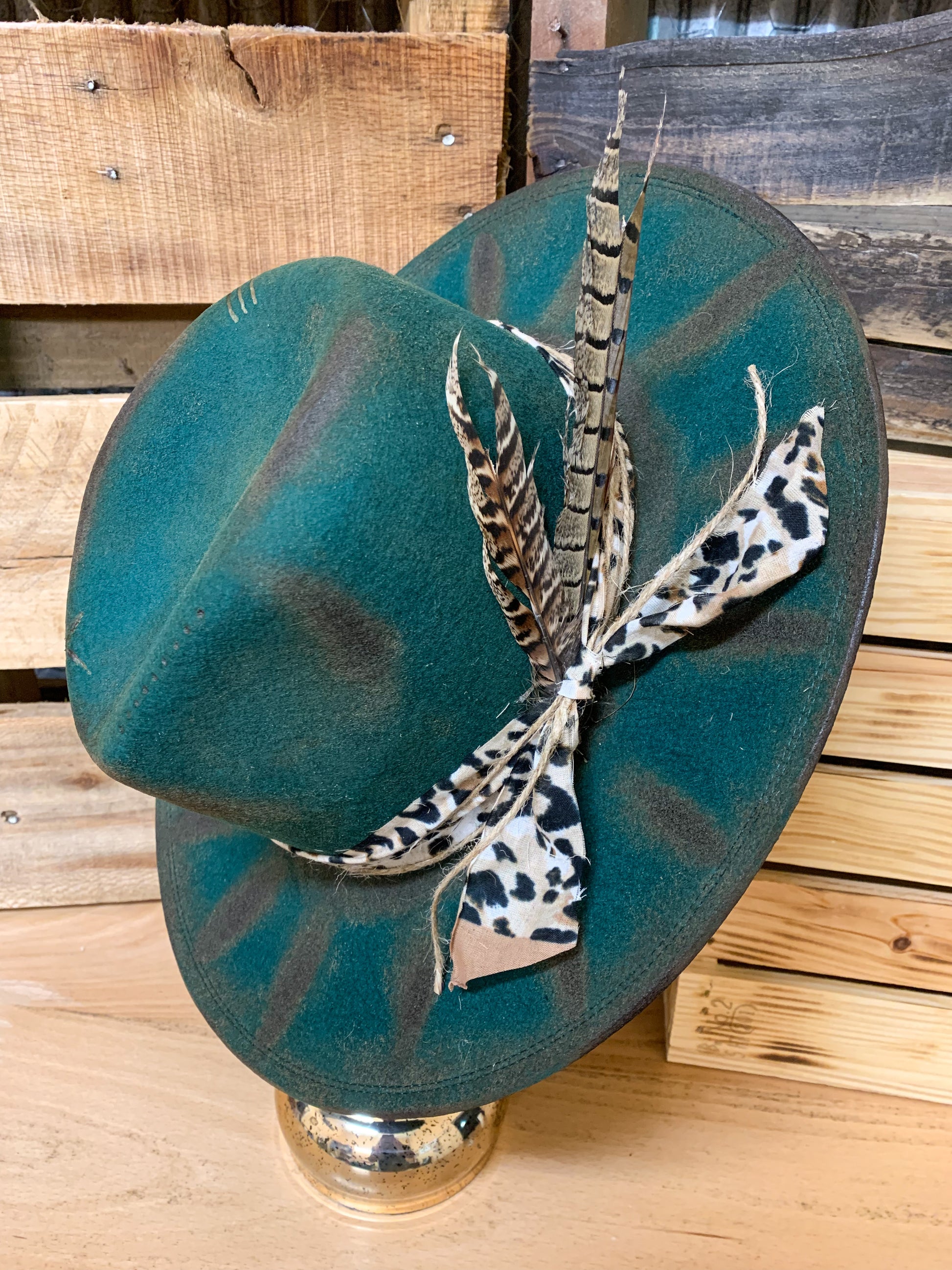 Atlas classic wool felt rancher hat with rich tonal satin lining and raw edging. 11cm crown height, 8cm brim length, 58/59cm inner circumference. Adjustable drawstrings inside to tighten. Burn accent marks with leopard bandana band and pheasant feathers on one side with peacock on the other.