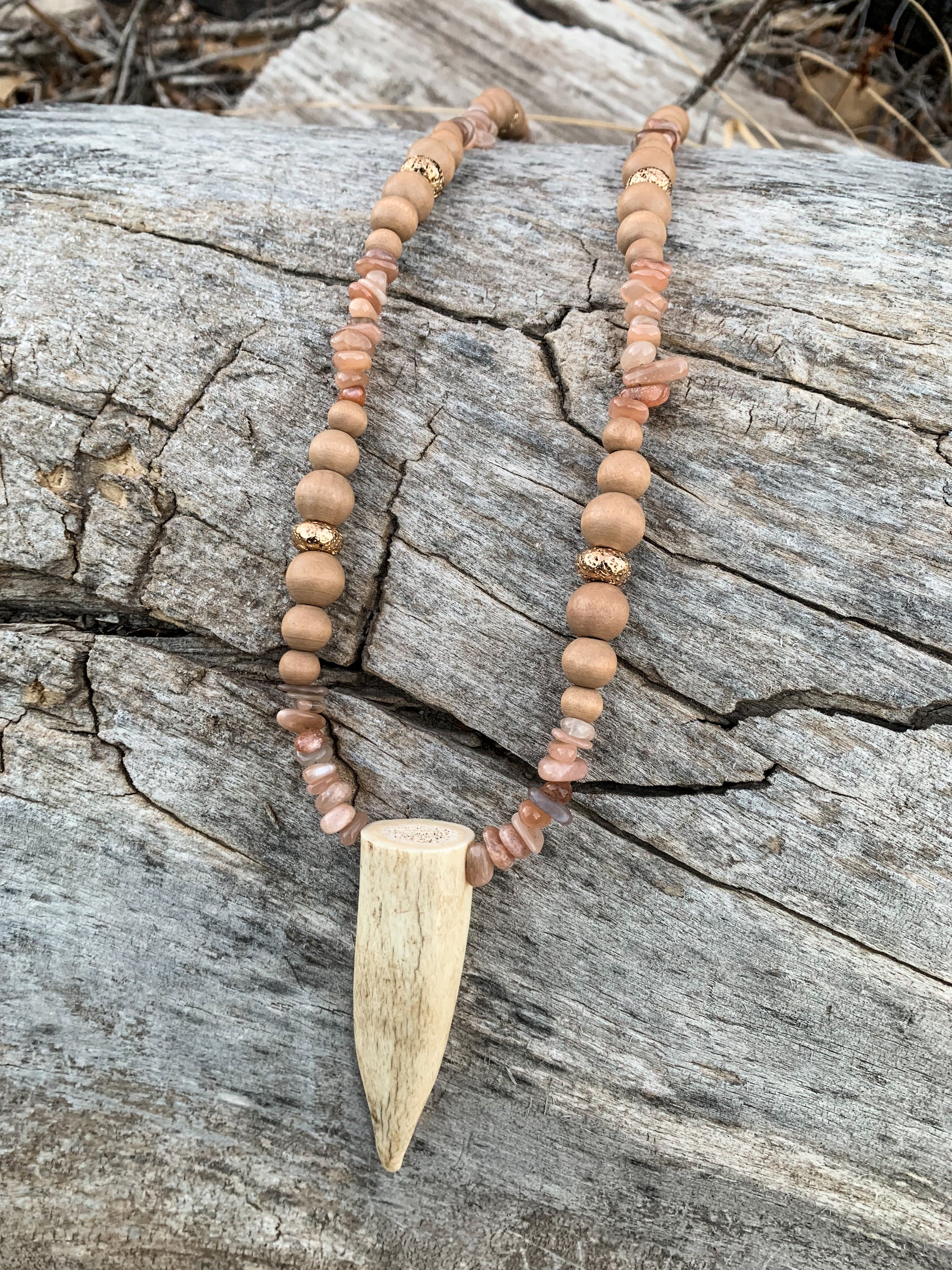 Gorgeous sandy colored rock beads, with tan wooden beads and a golden accent one. Unique shaped authentic antler piece in the center. Handmade.