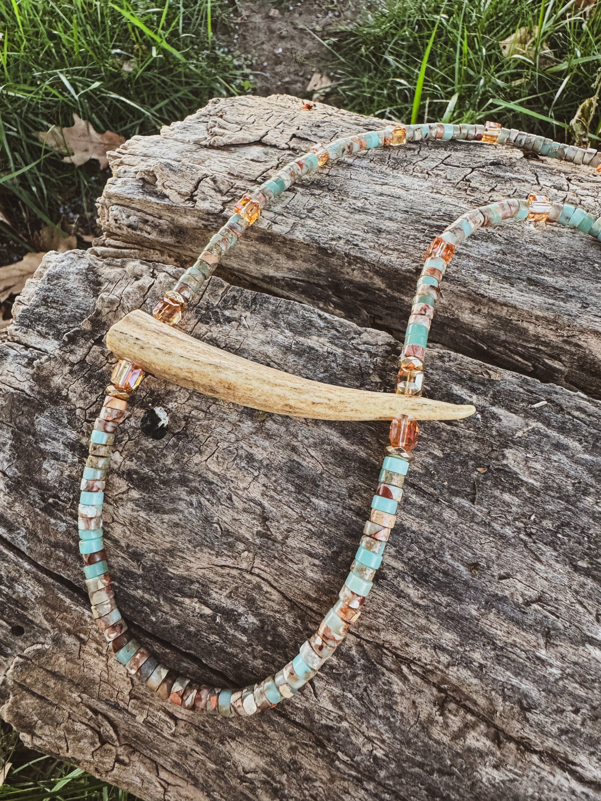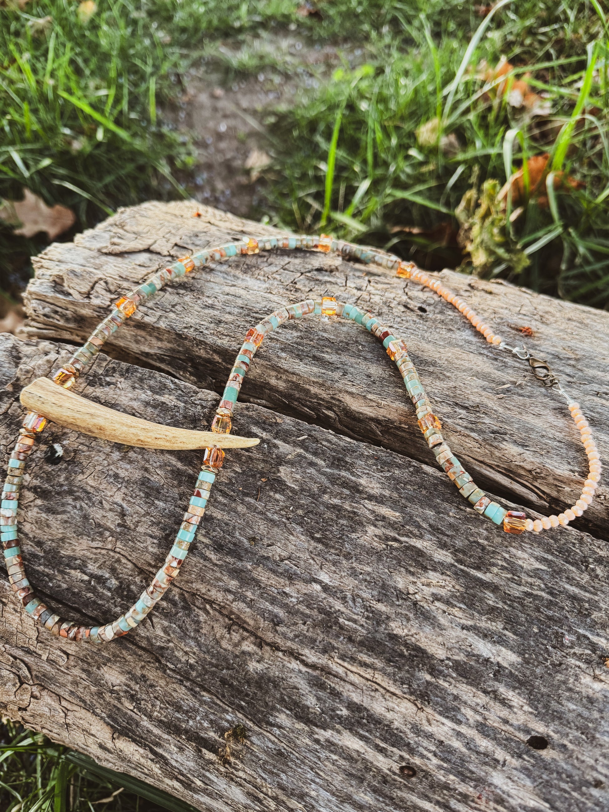 Small coral and light blue beads with orange crystal beads and a horizontal authentic antler piece. Handmade. One of a kind.
