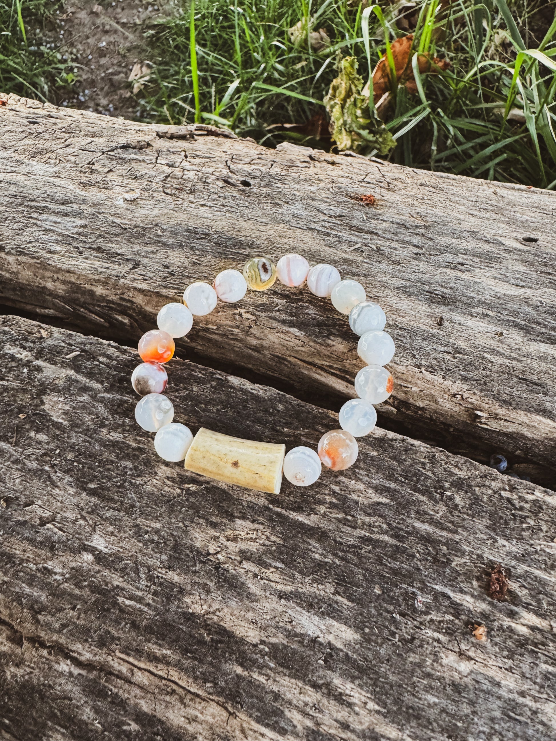 Glass marbled beads and a small authentic antler piece. Handmade. One of a kind.