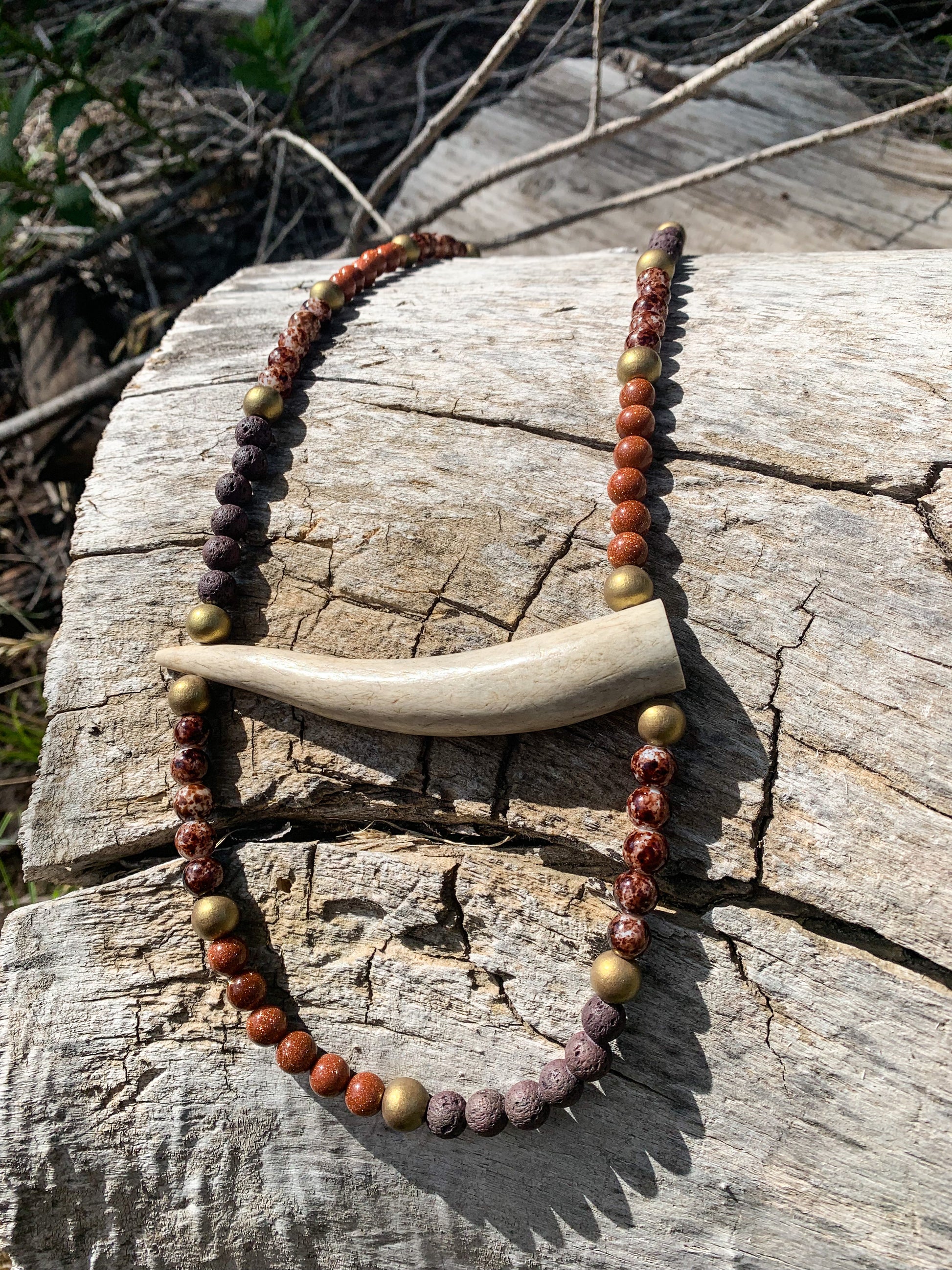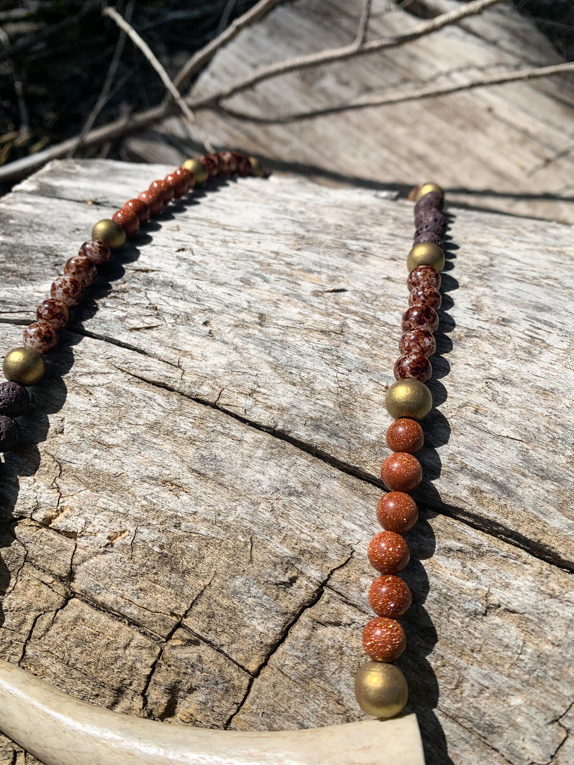 Different variations of brown beads with golden matte finish beads in between. Horizontal authentic antler tip.