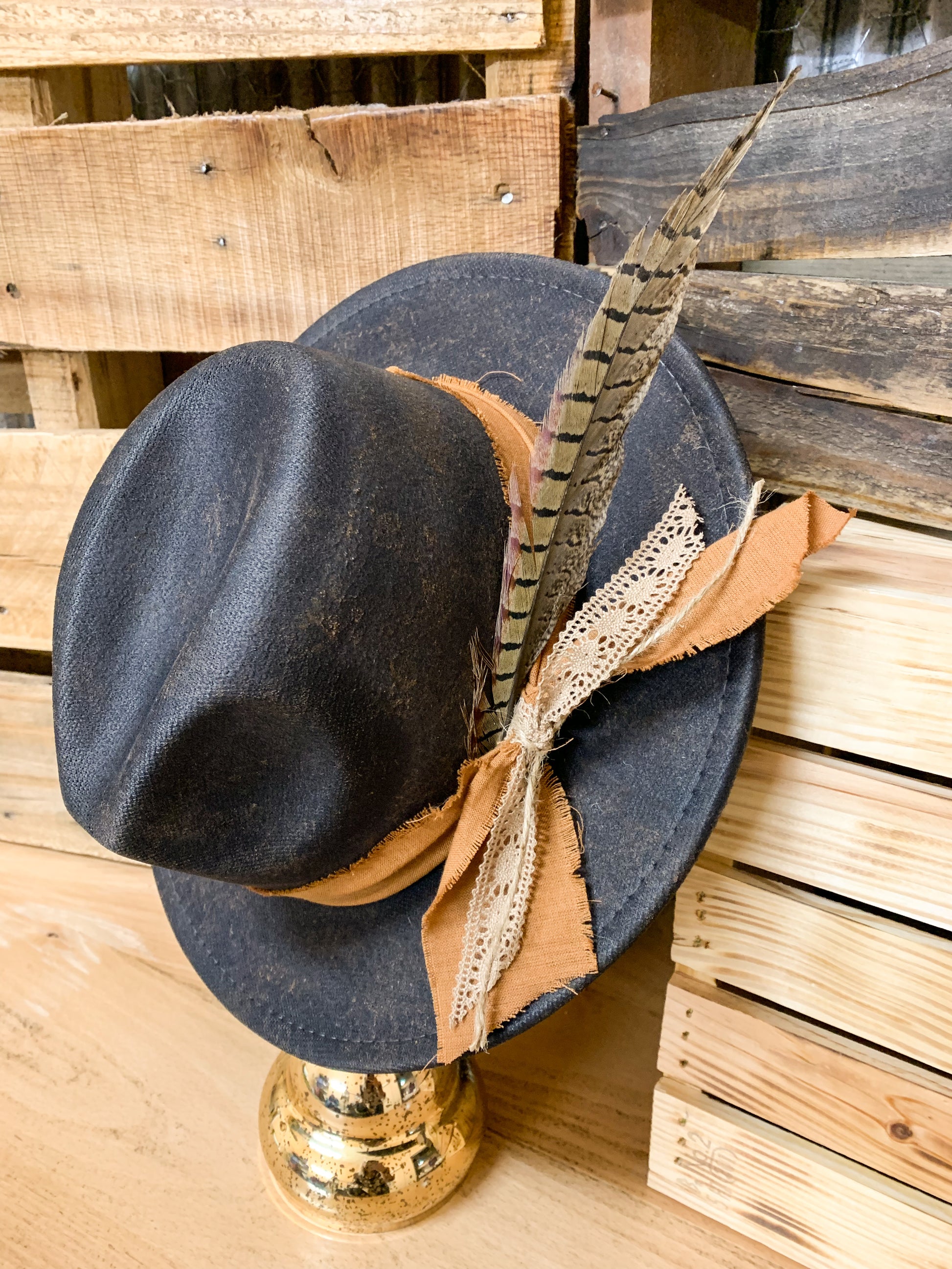 Charcoal gray hat with rust distressed look and rust colored fabric band and a pheasant feather on the side. Adjustable drawstrings inside to tighten. 4.75” height. 2.75” brim. 22” circumference. 65% cotton, 35% polyester.