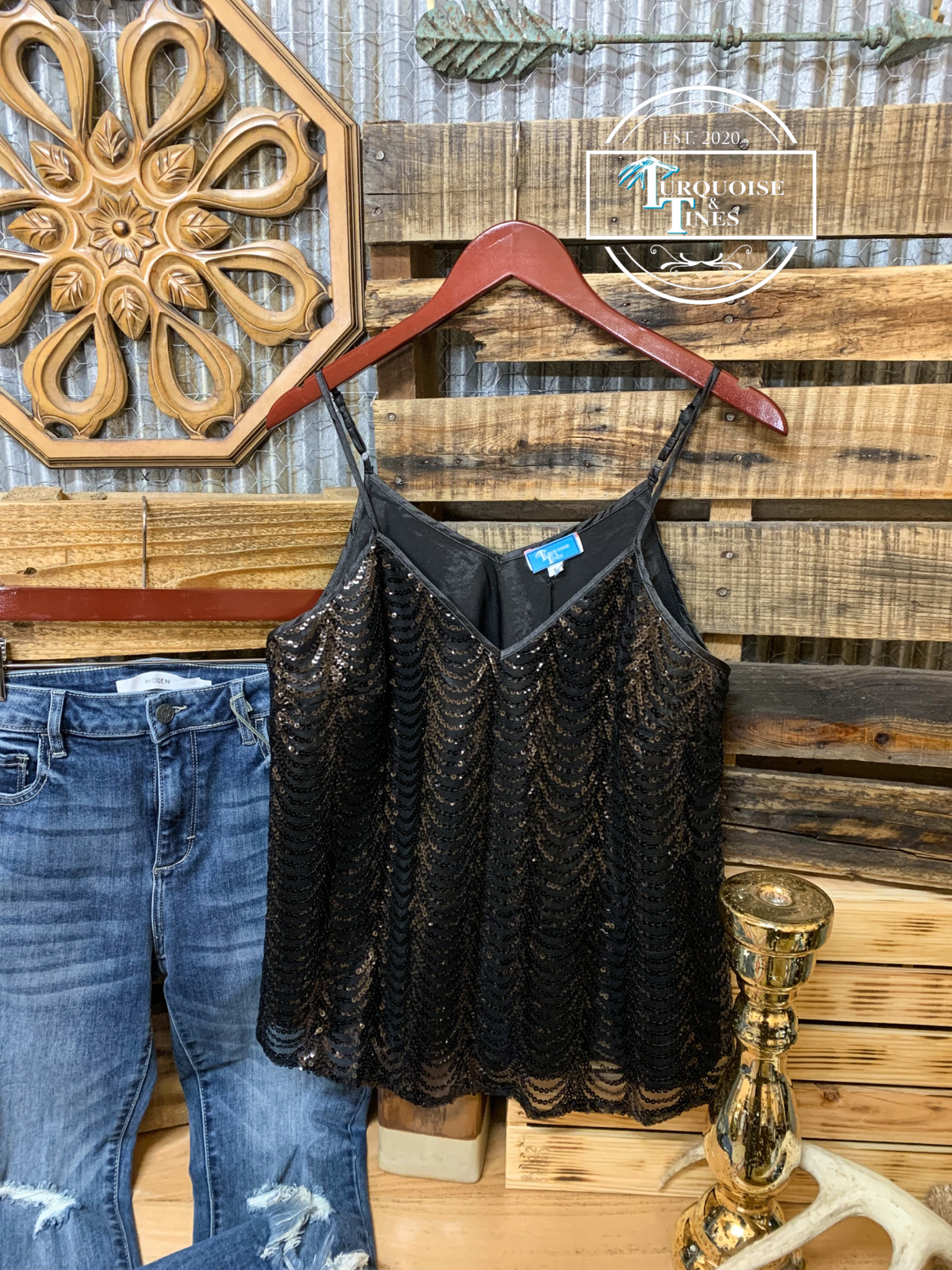 Scallop sequin tank top with a V neckline and a lined bodice. Adjustable straps.