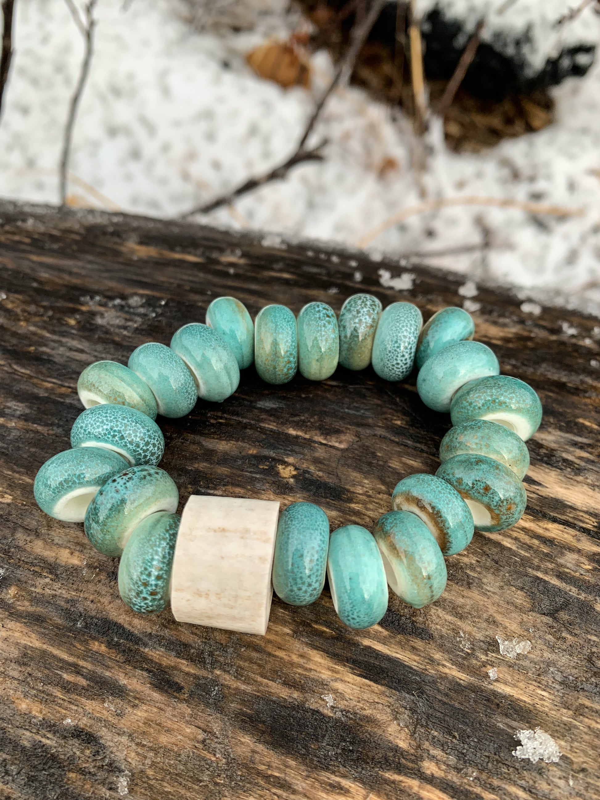Large stone beads with a smooth Seafoam colored finish and an authentic antler piece. Handmade.