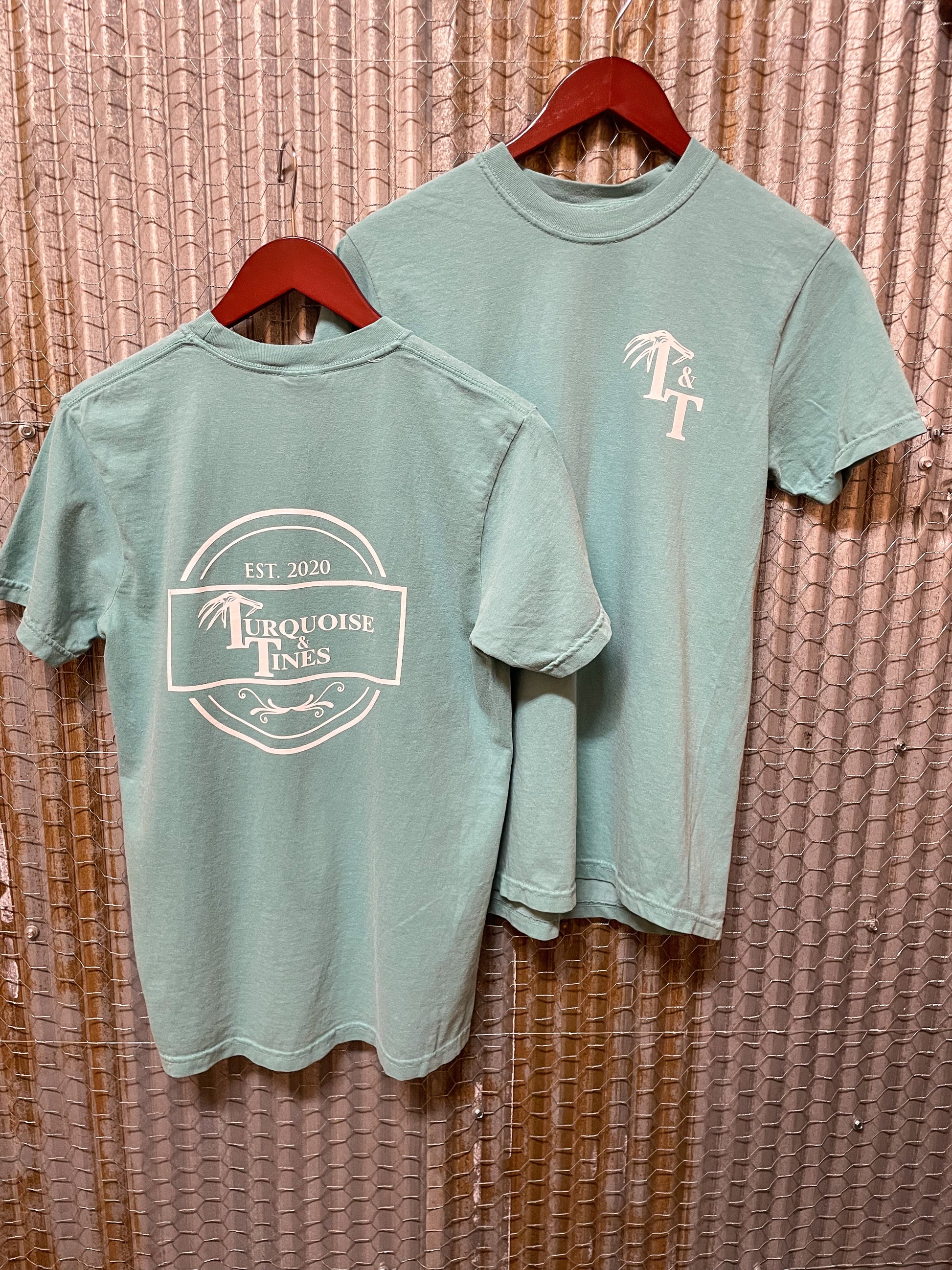 Your favorite comfort color wash tee with the Turquoise & Tines storefront logo on the back, and T&T logo on the front chest pocket area. True to size.