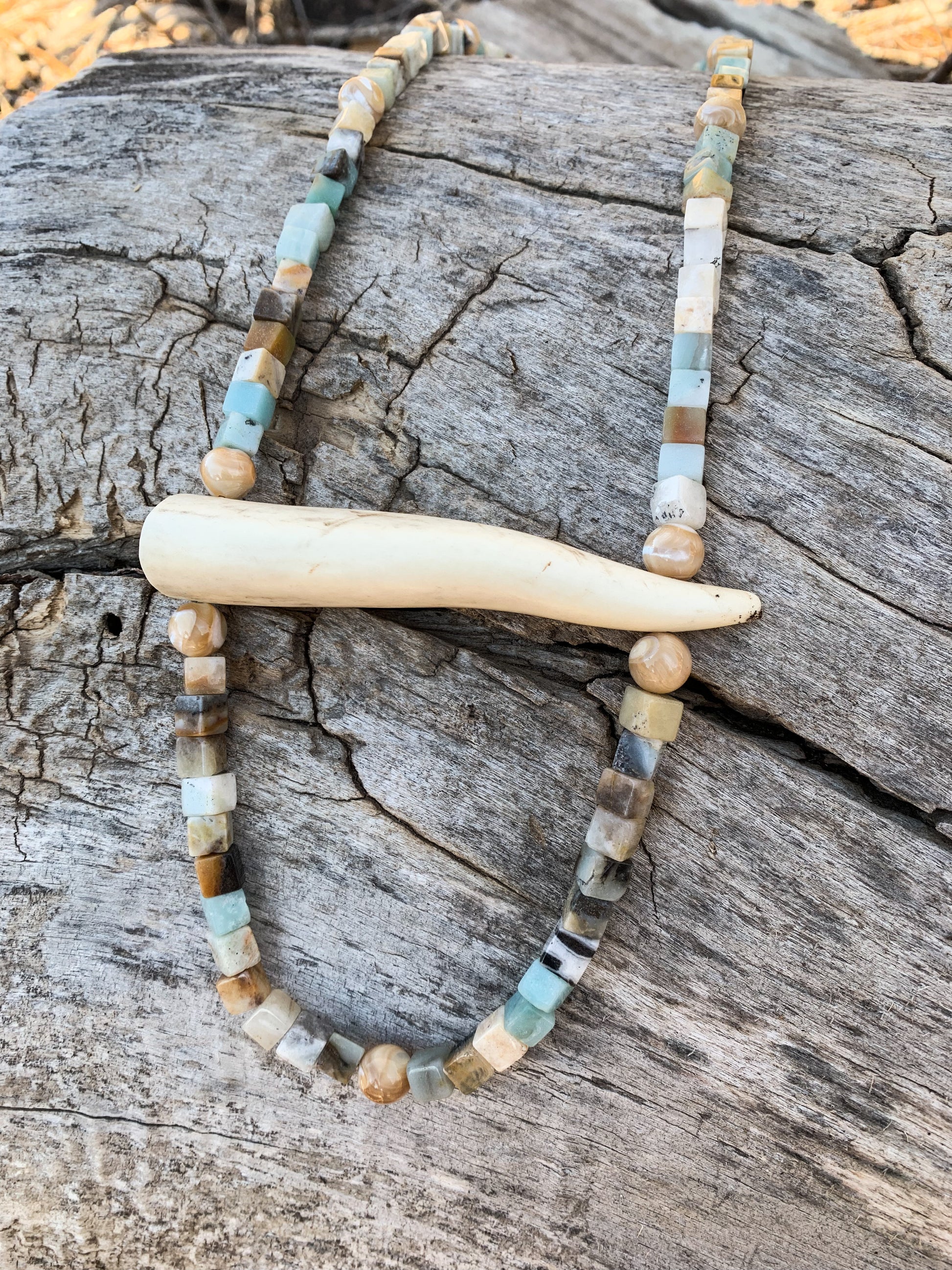 Square stone beads with accent marble beads and a horizontal authentic antler necklace. Handmade.