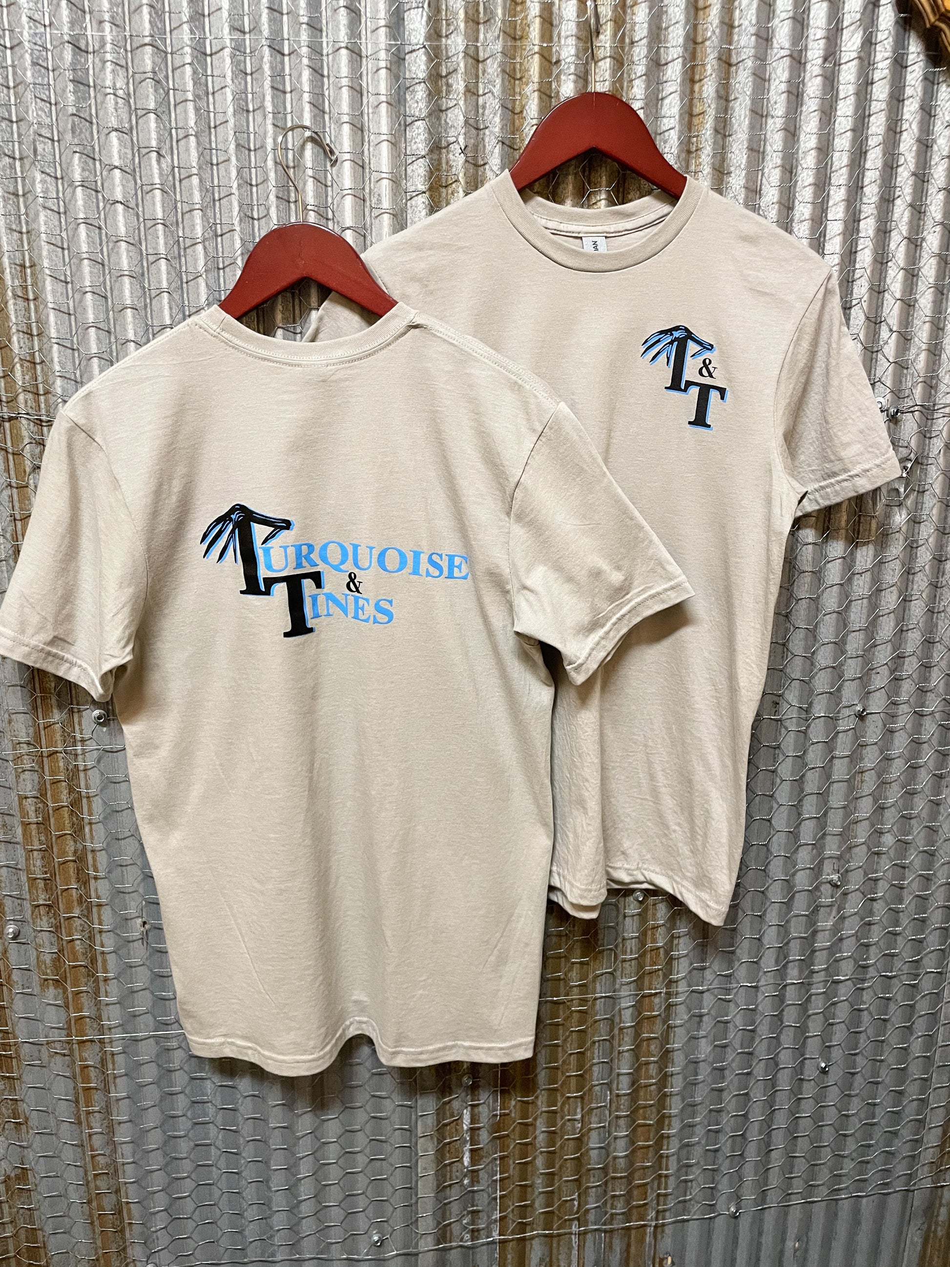 Unisex tan colored tee with Turquoise & Tines logo on the back, and T&T logo on the front chest pocket area.