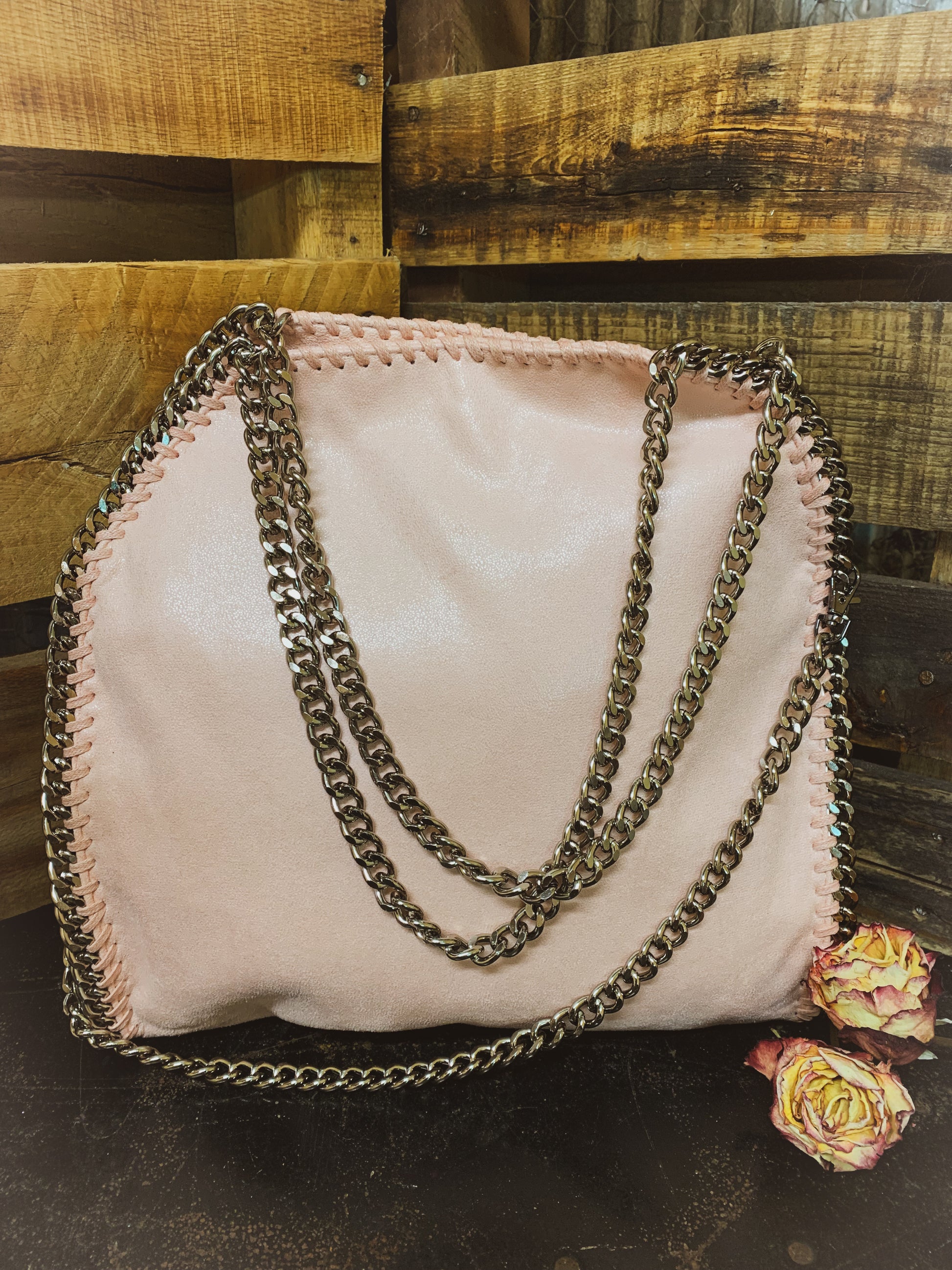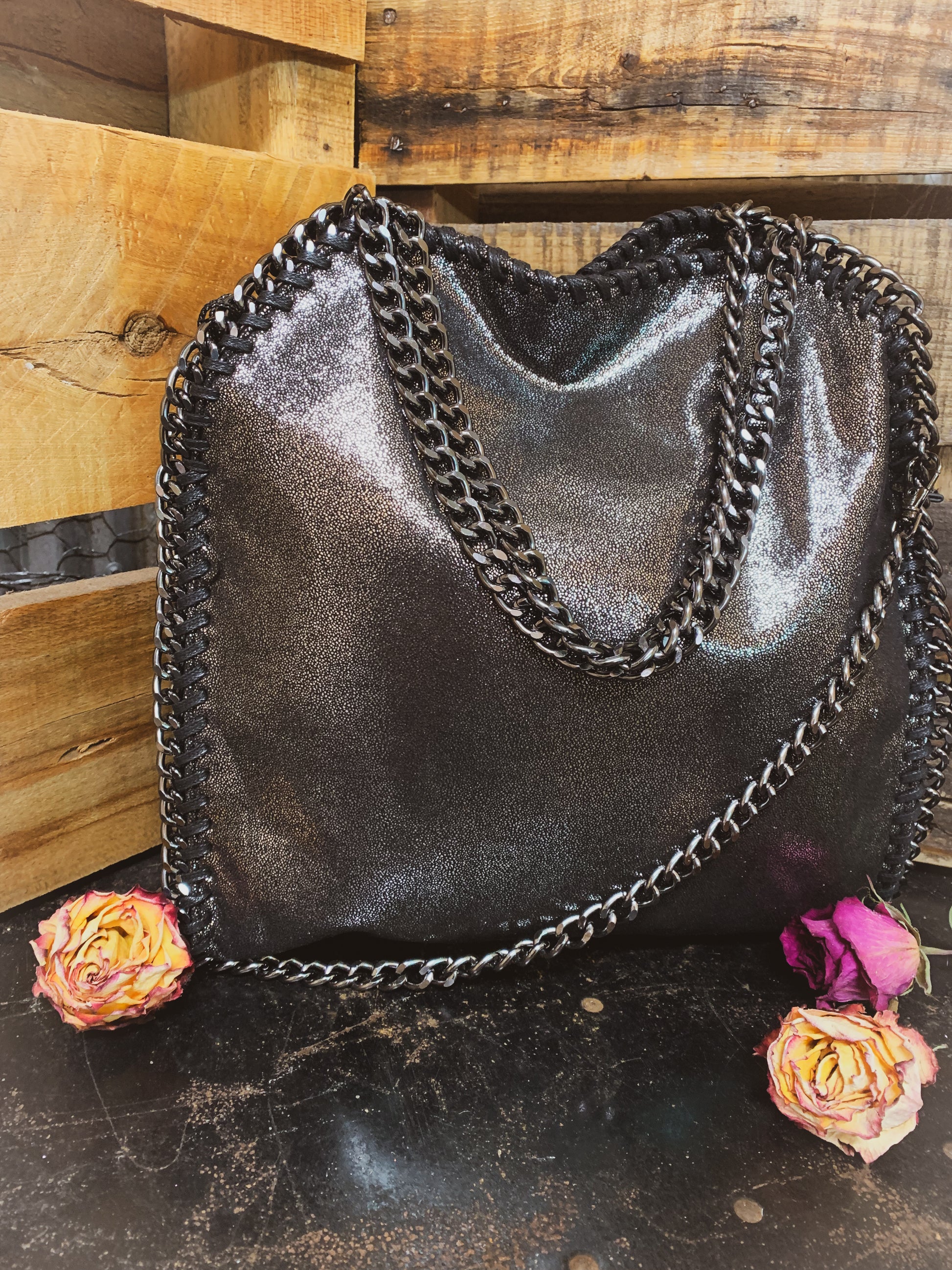 Super fun slouchy style bags with a soft shimmer material and chain handle designs. Button closure. Zipper pocket inside. 13 W x 5 D x 12 H